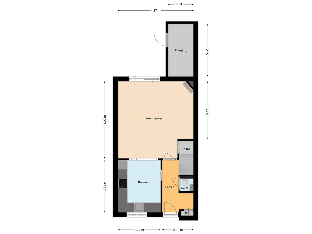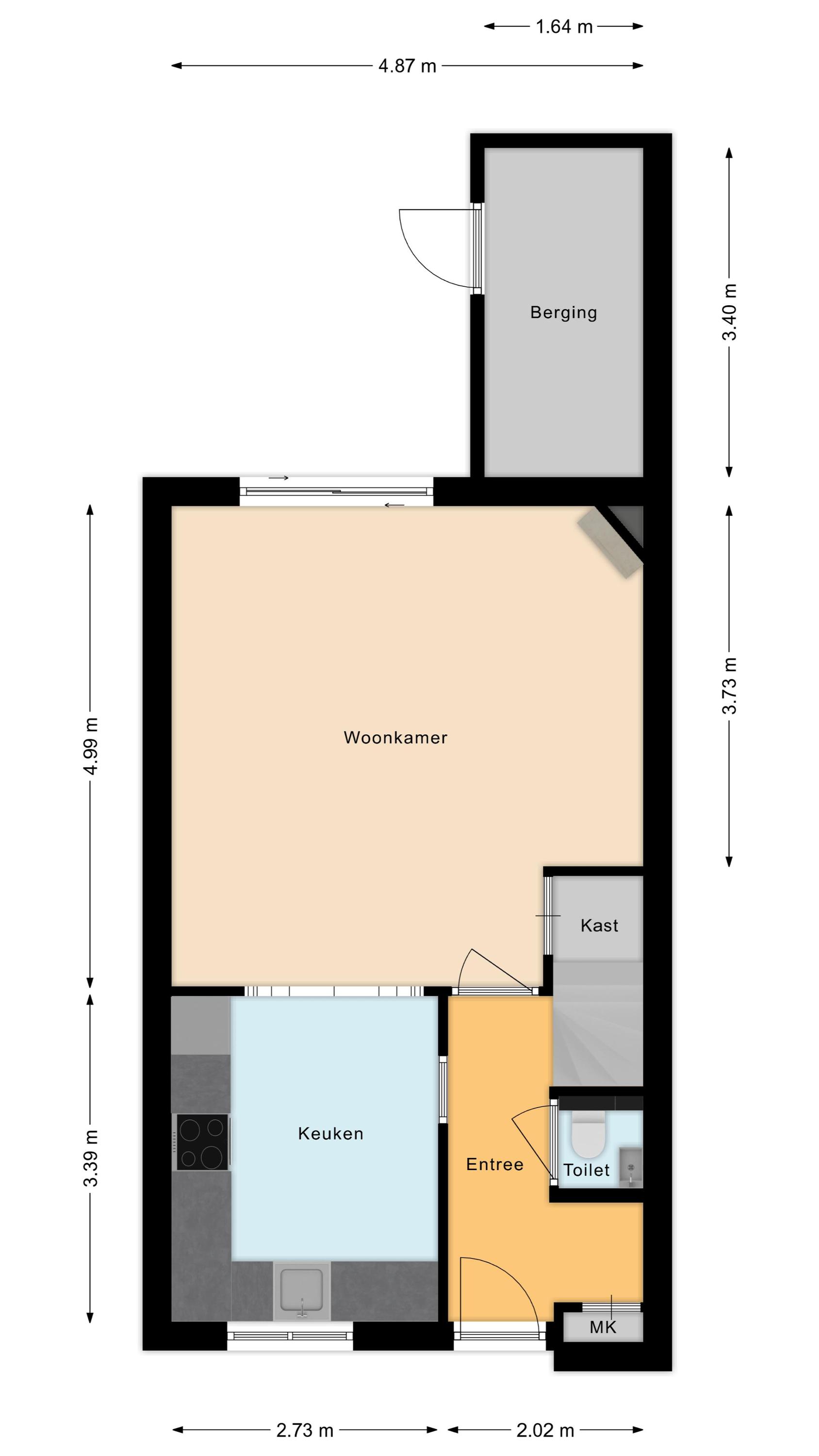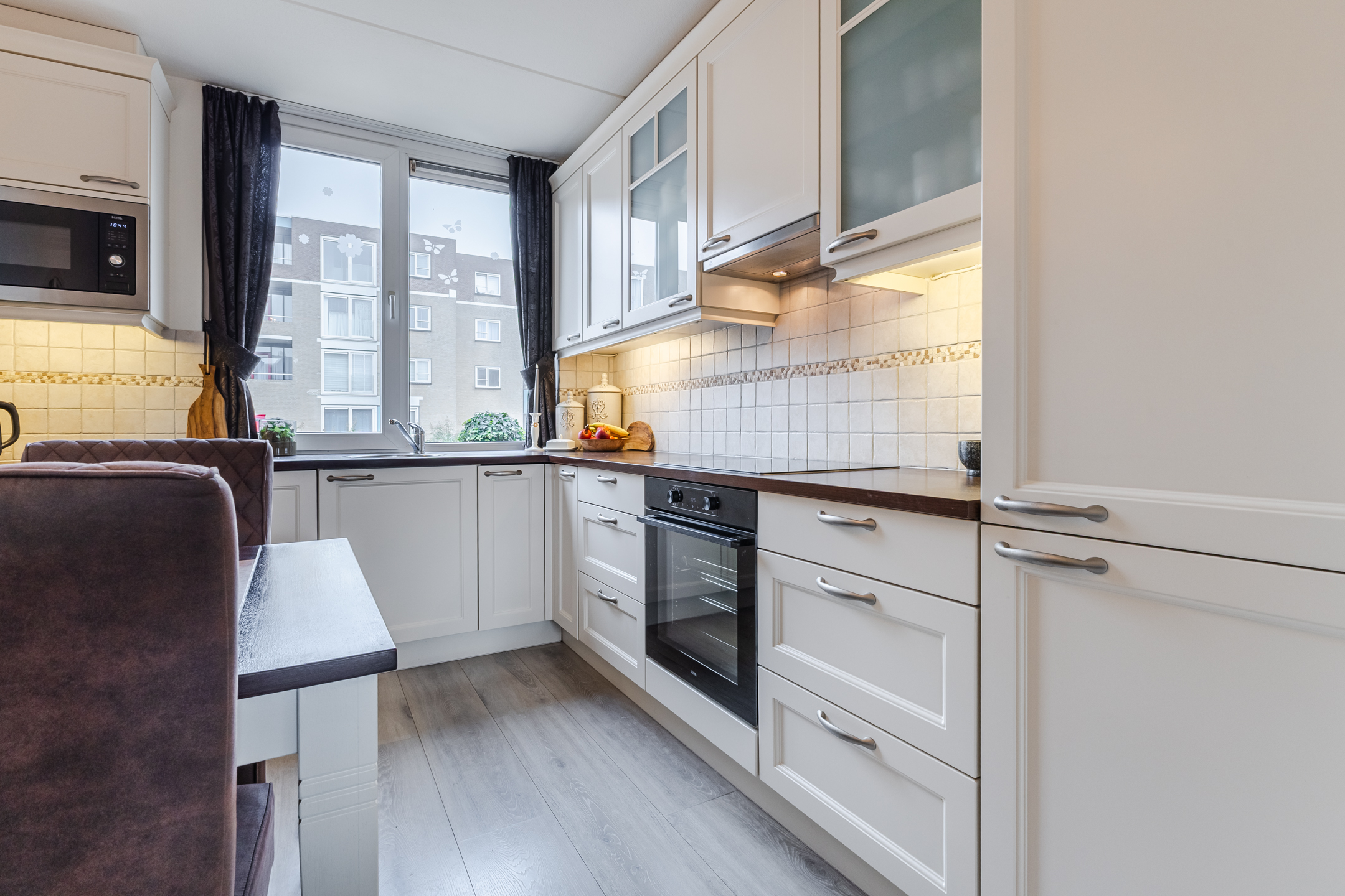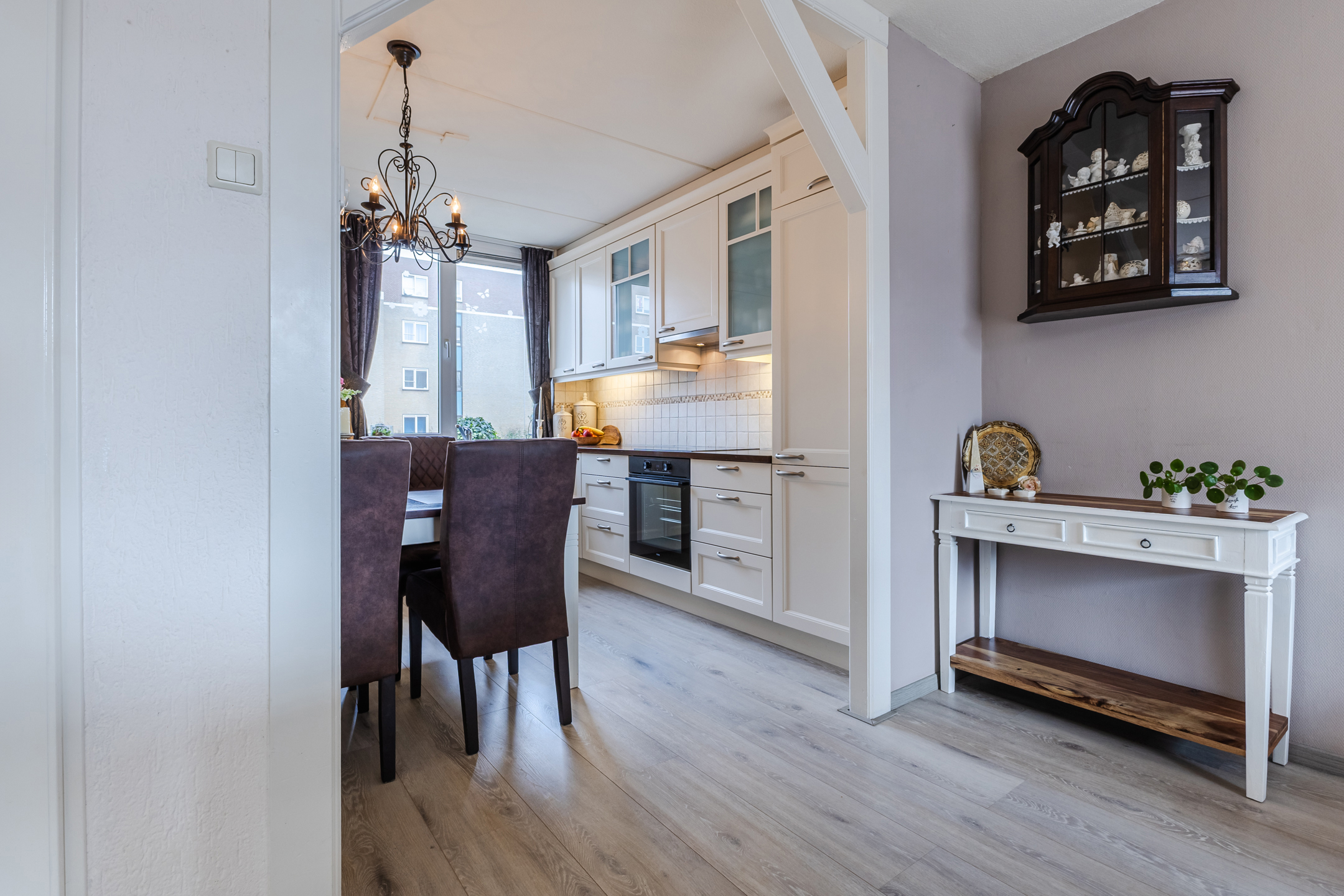 De tuingerichte woonkamer heeft een praktische trapkast, een schuifpui naar de zonnige achtertuin en er is airconditioning. Aan de voorzijde van de woning is de complete keuken gelegen met inbouwapparatuur als: een inductiekookplaat, afzuigkap, oven, magnetron, vaatwasser, vriezer en een koelkast. Over de gehele begane grond ligt een laminaatvloer.