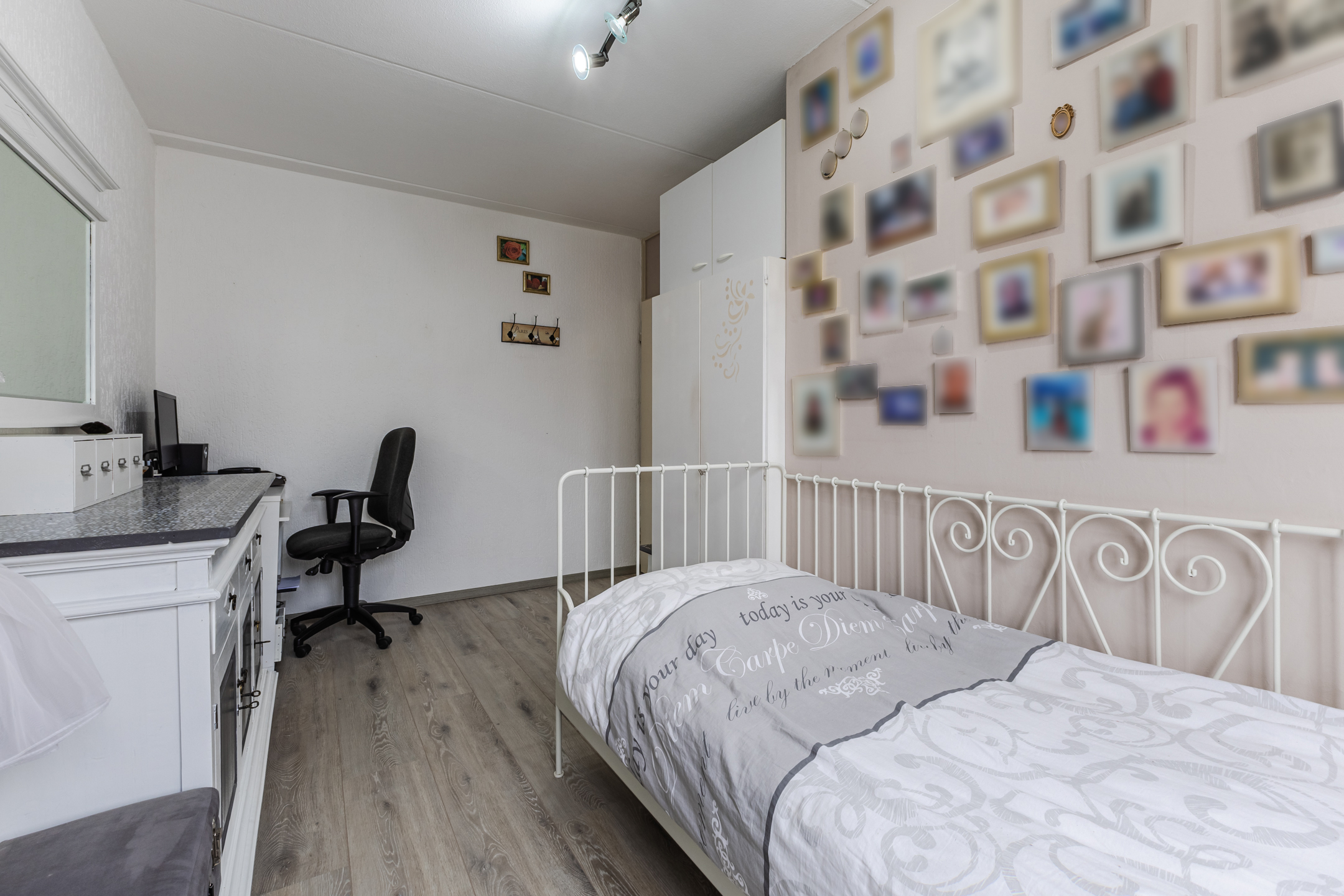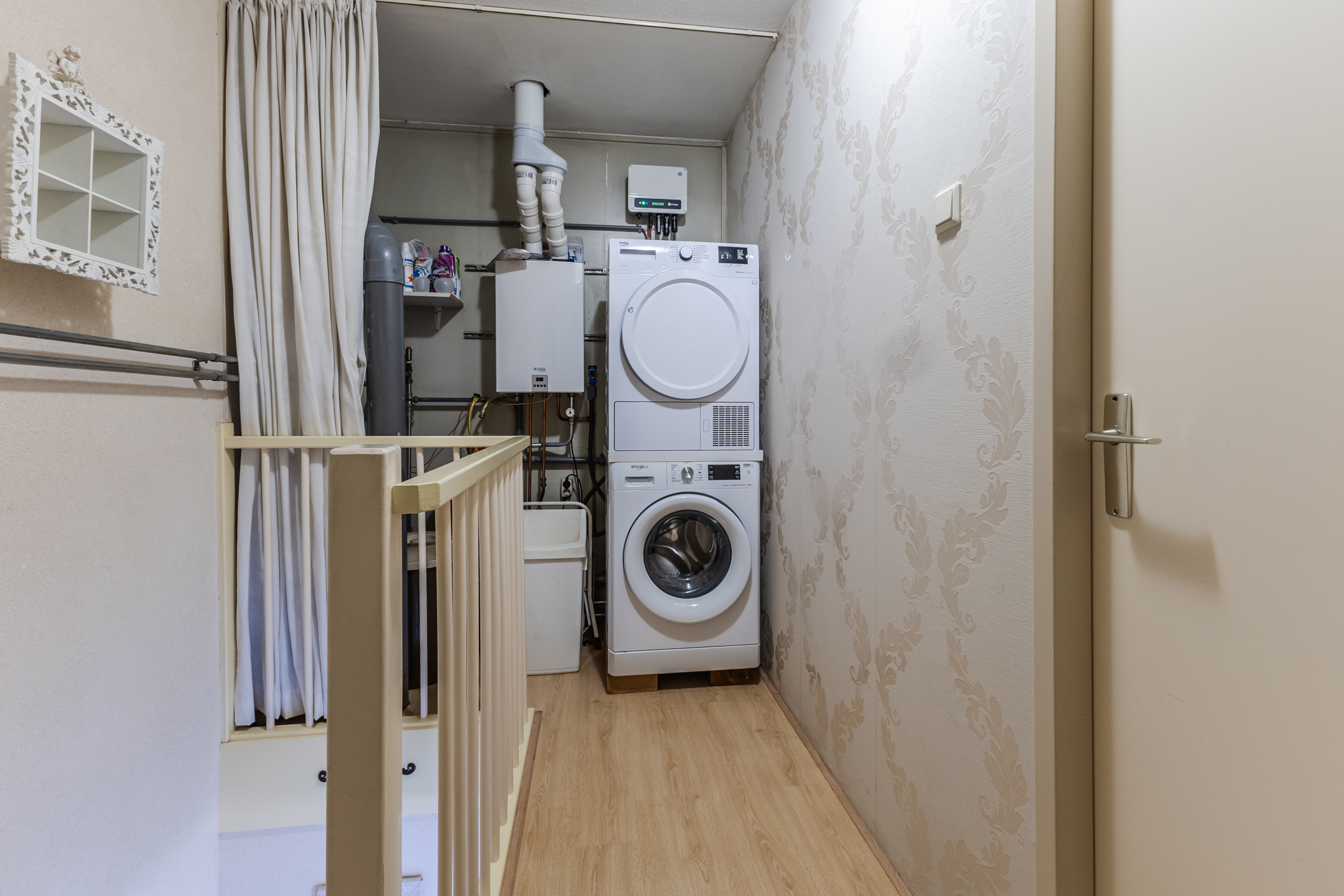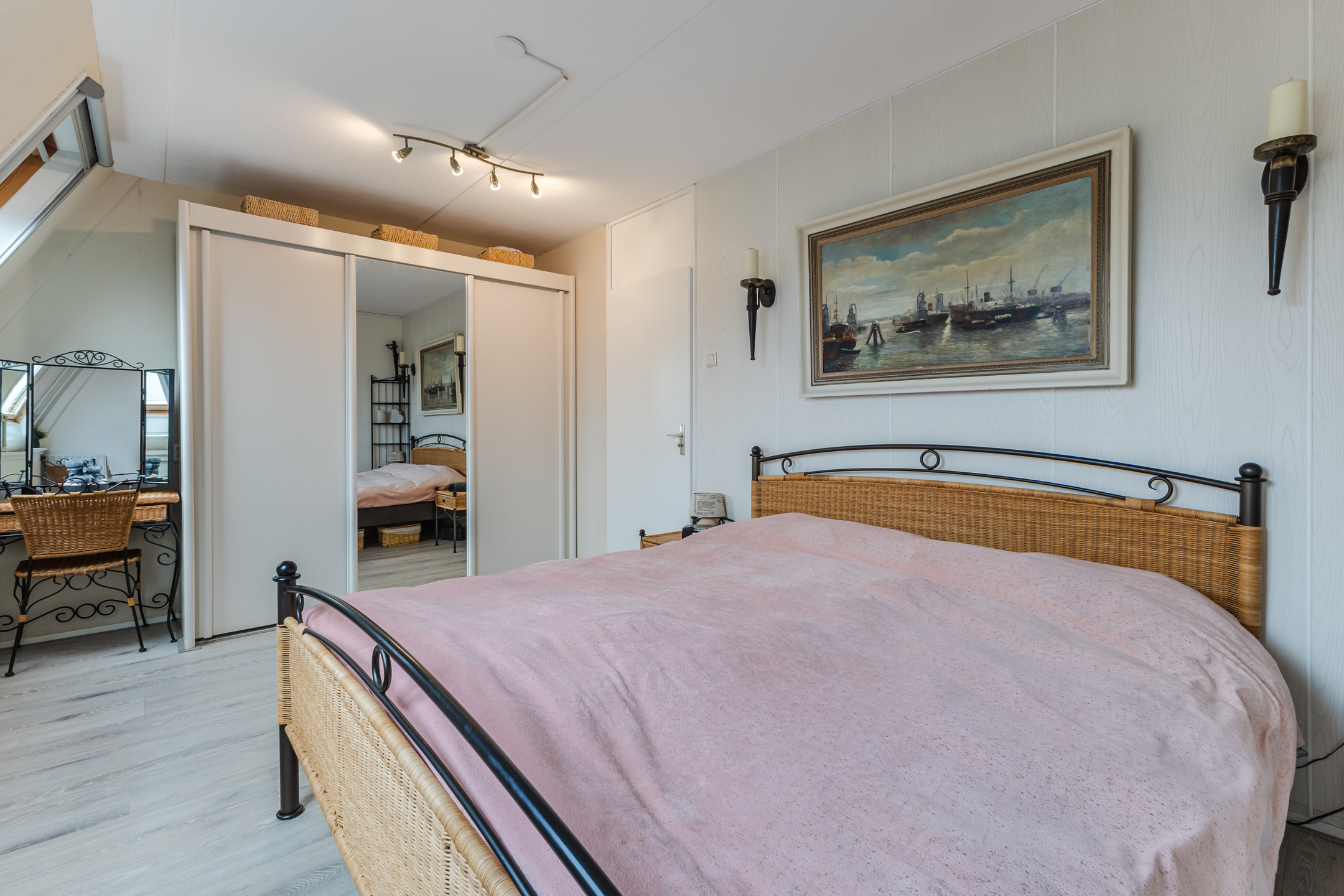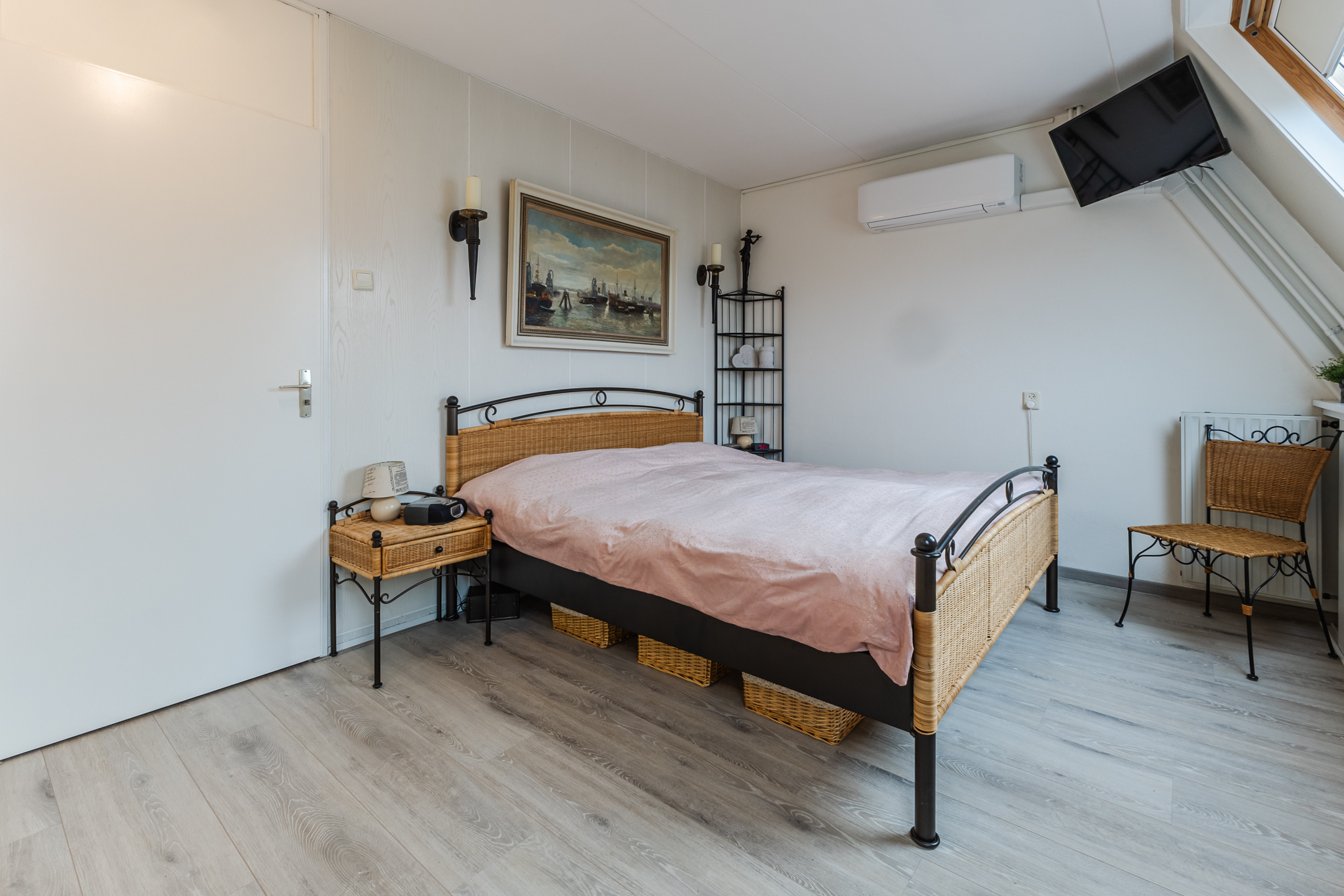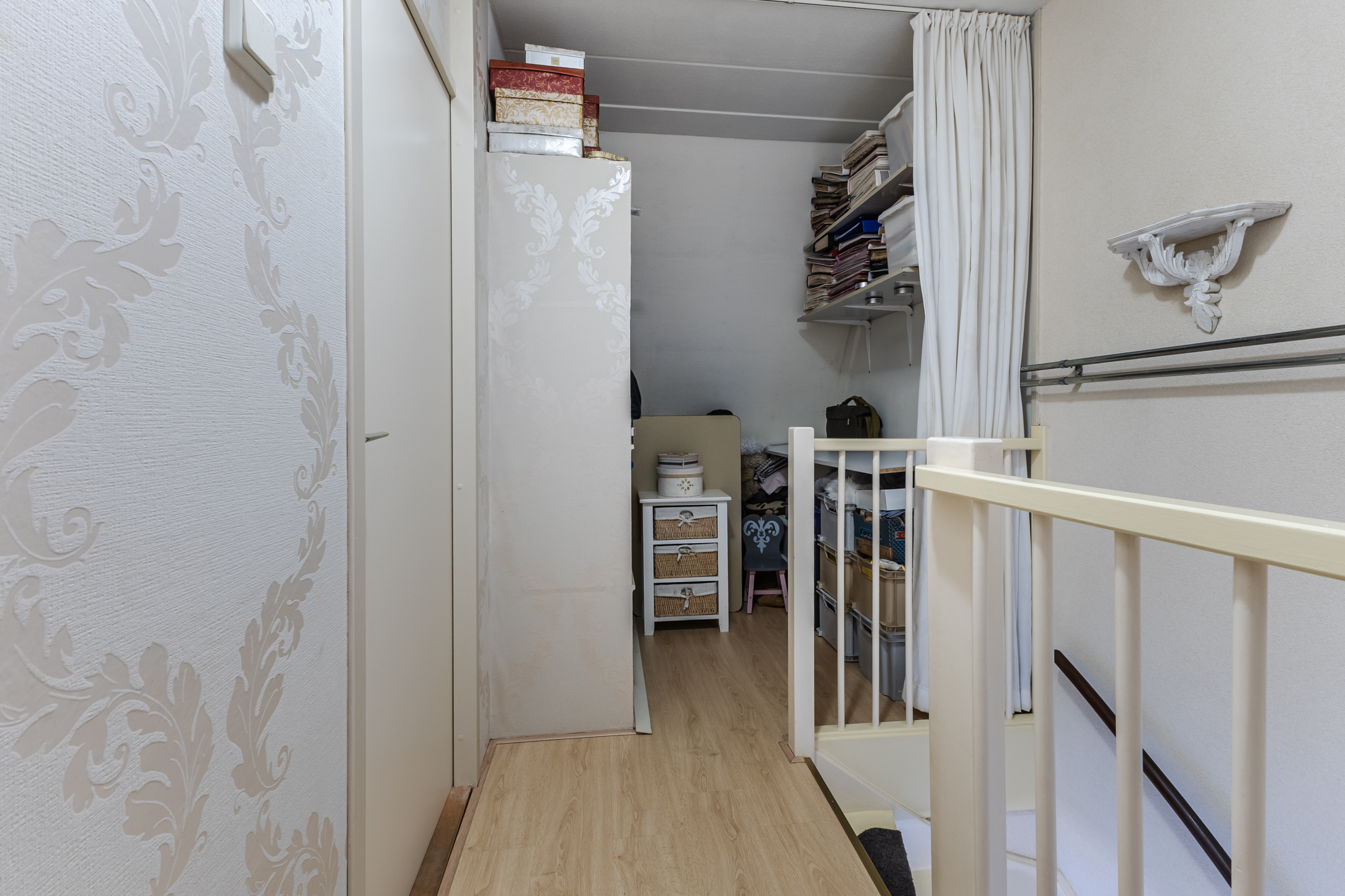 Via een vaste trap bereik je de overloop met de witgoedaansluitingen, de omvormer van de zonnepanelen en de opstelplaats van de cv-ketel Remeha (2012). De derde slaapkamer heeft toegang tot het dakterras, bergruimte achter de knieschotten en ook hier ligt een laminaatvloer.