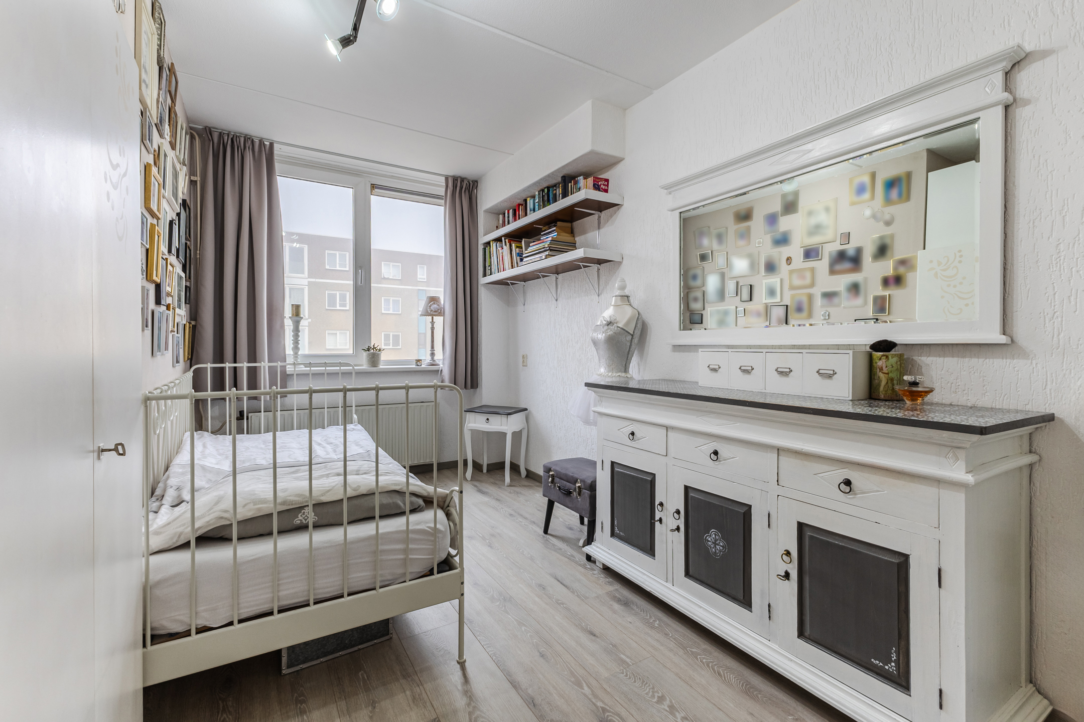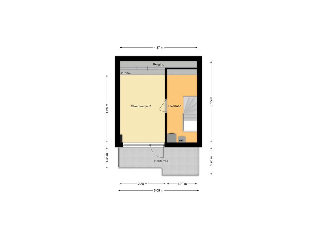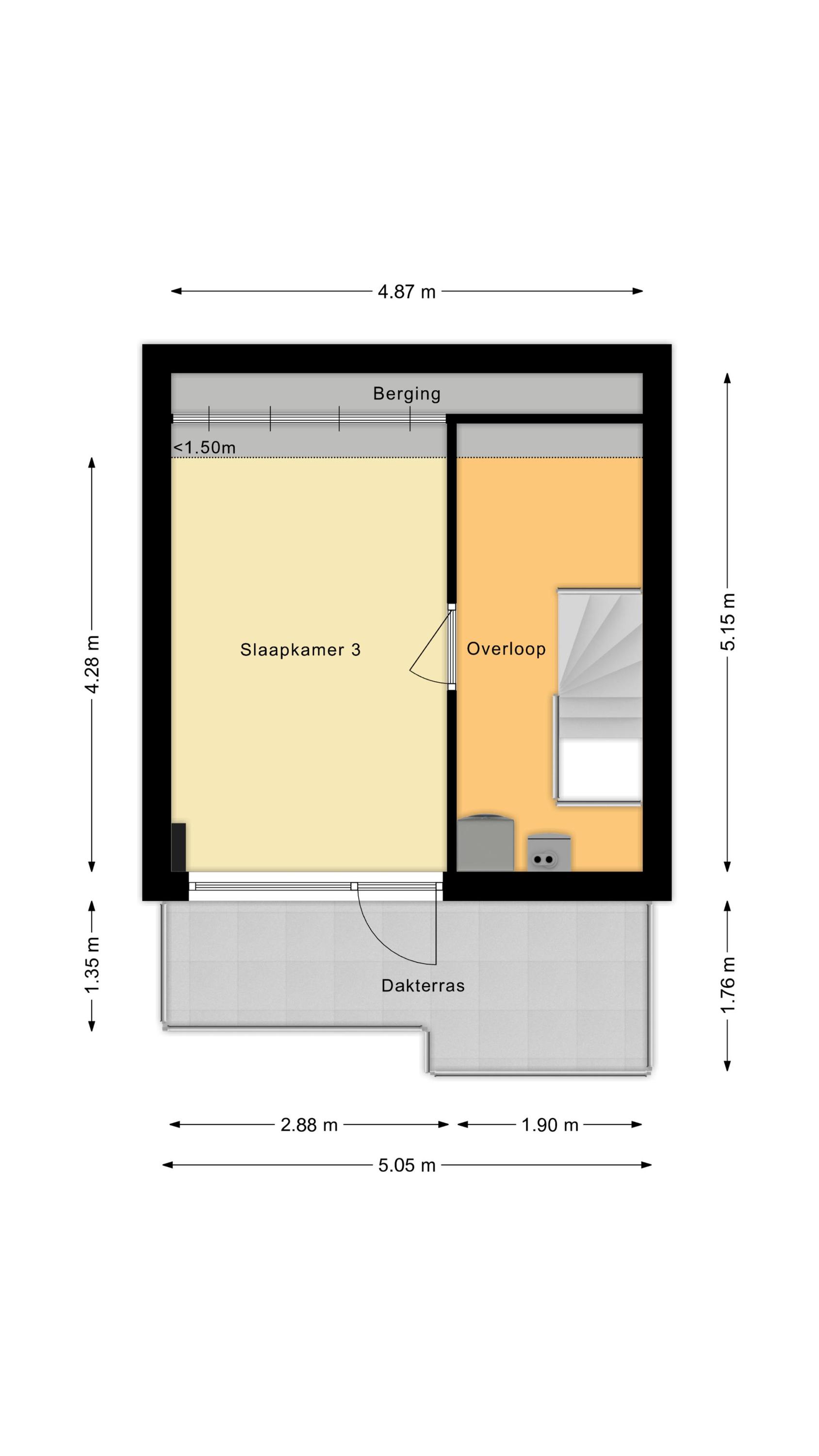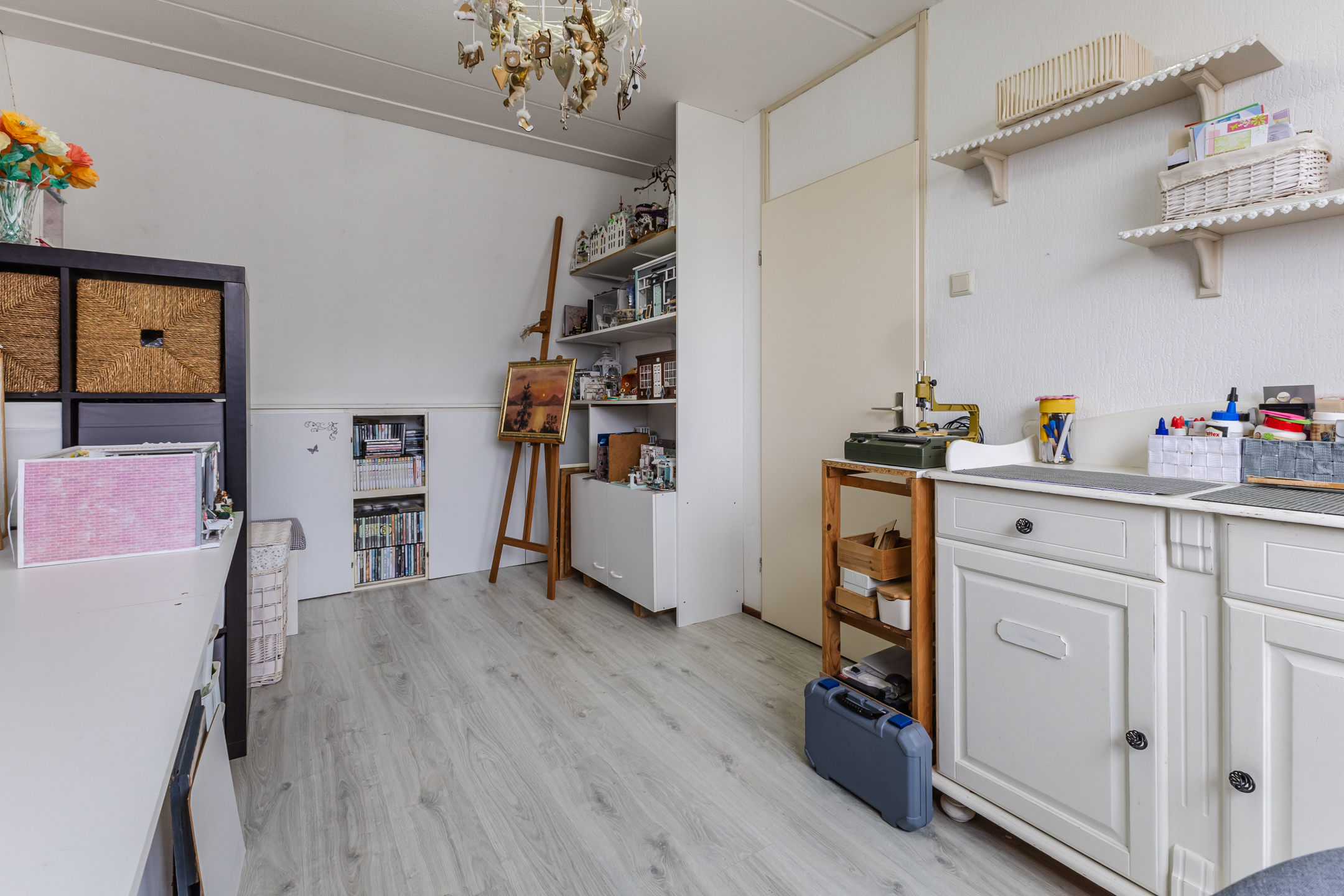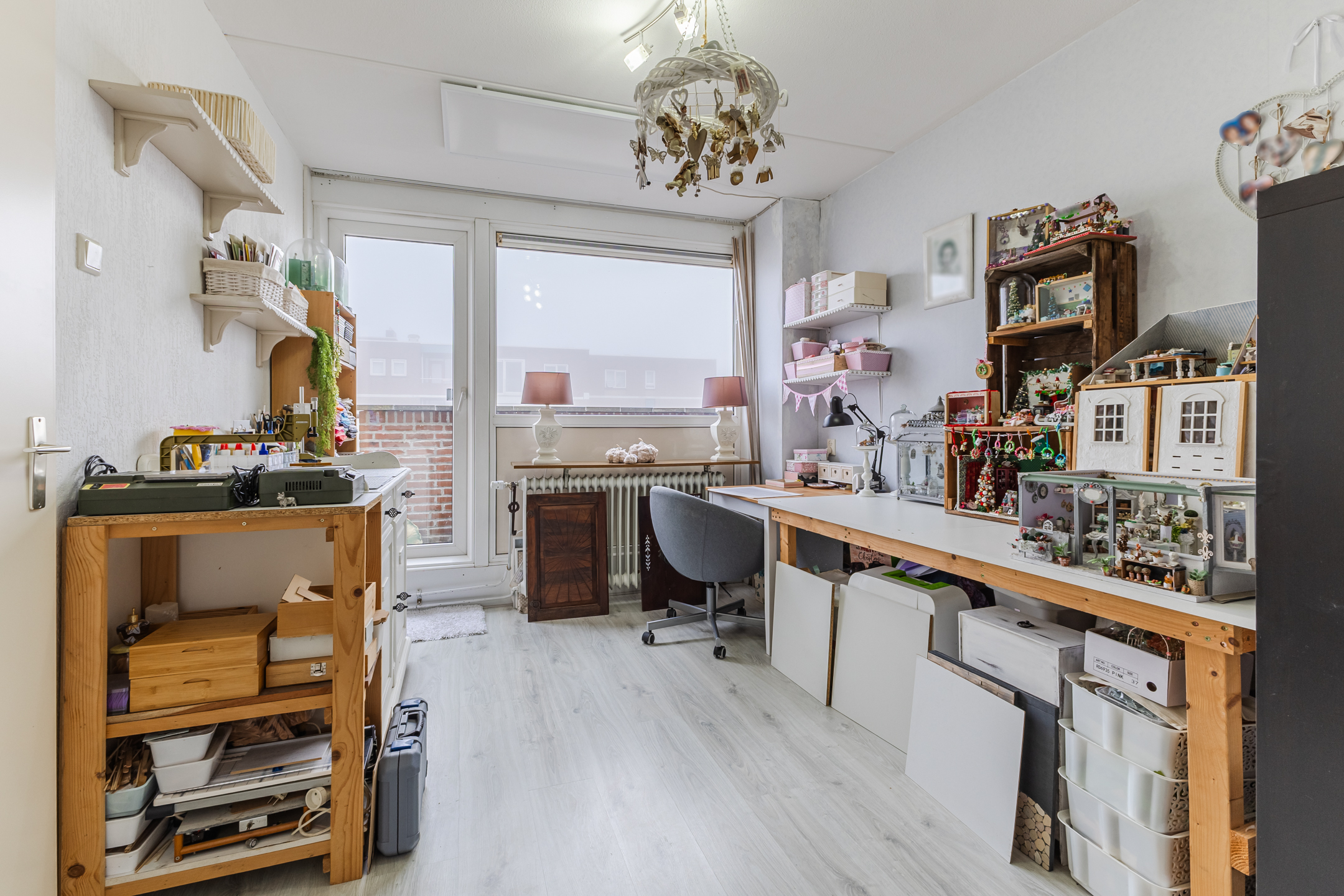 Via een vaste trap bereik je de overloop met de witgoedaansluitingen, de omvormer van de zonnepanelen en de opstelplaats van de cv-ketel Remeha (2012). De derde slaapkamer heeft toegang tot het dakterras, bergruimte achter de knieschotten en ook hier ligt een laminaatvloer.