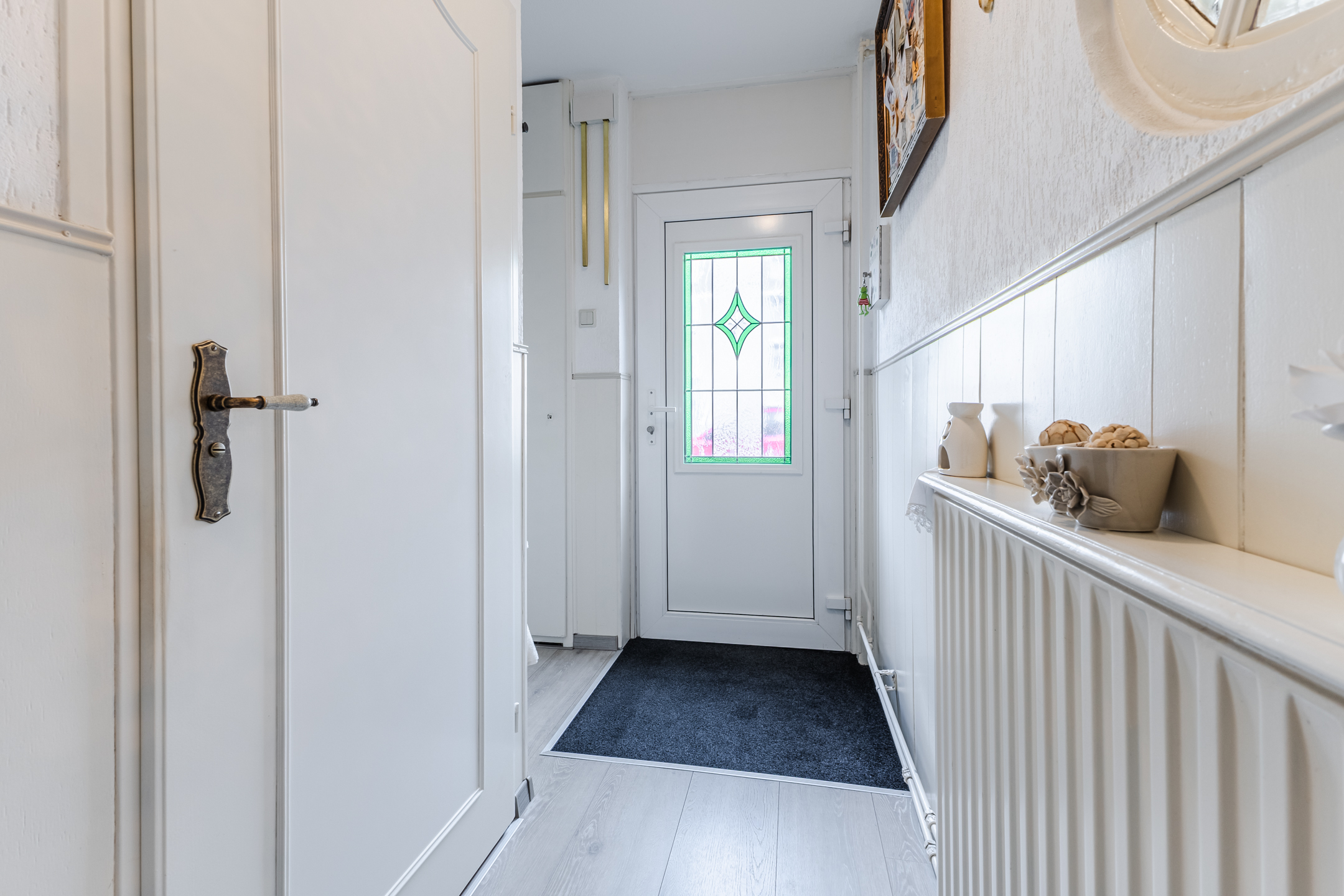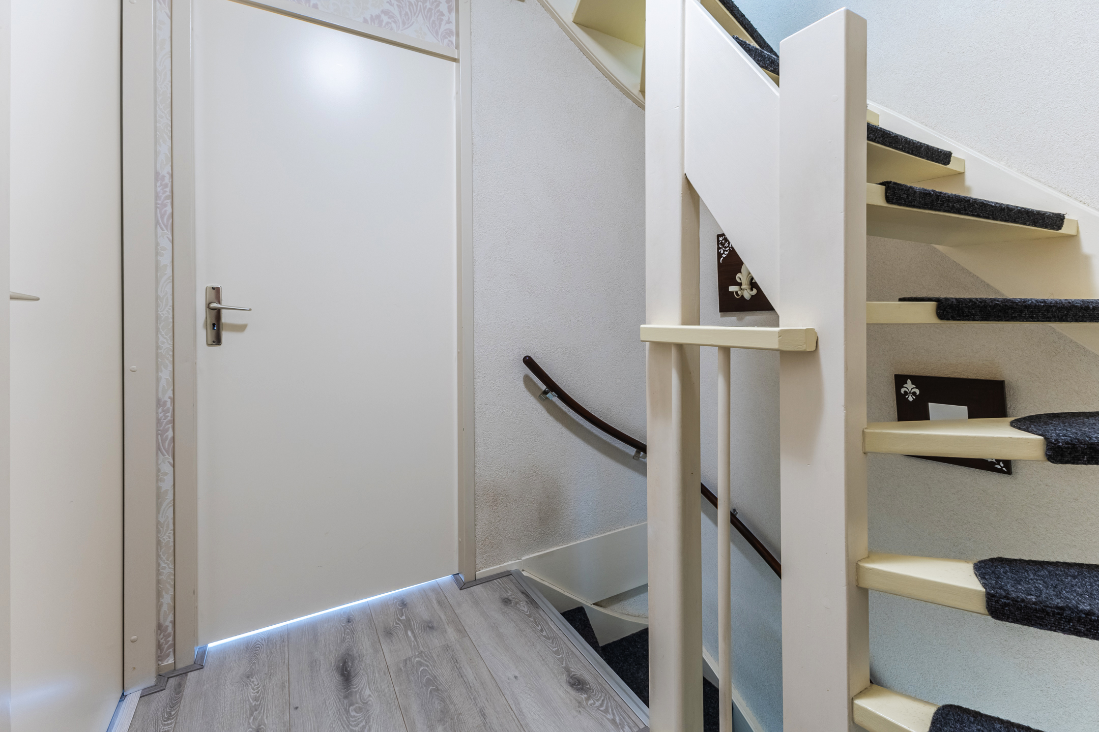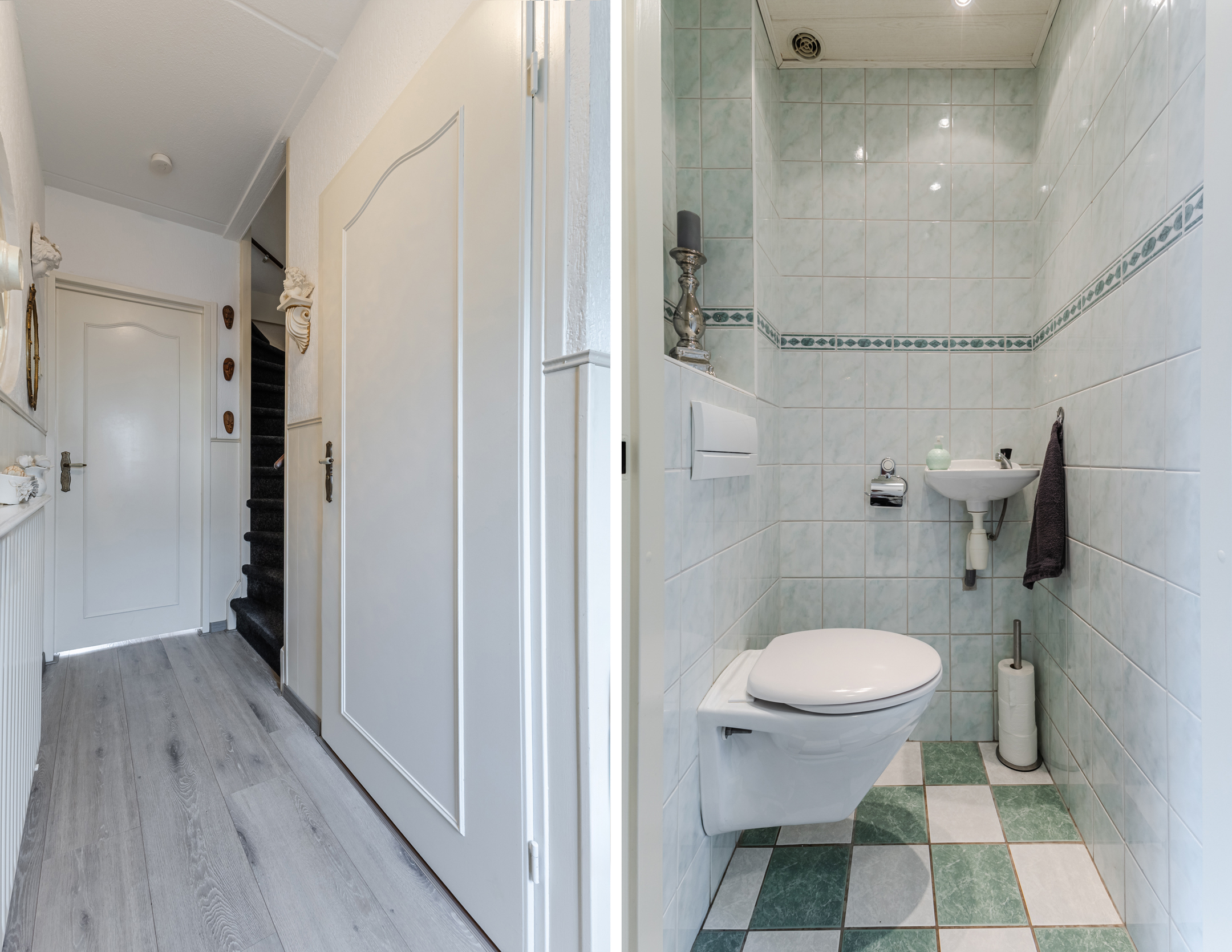 Hal/entree met de vernieuwde meterkast, trapopgang en de geheel betegelde toiletruimte met inbouwcloset en handwasbakje.