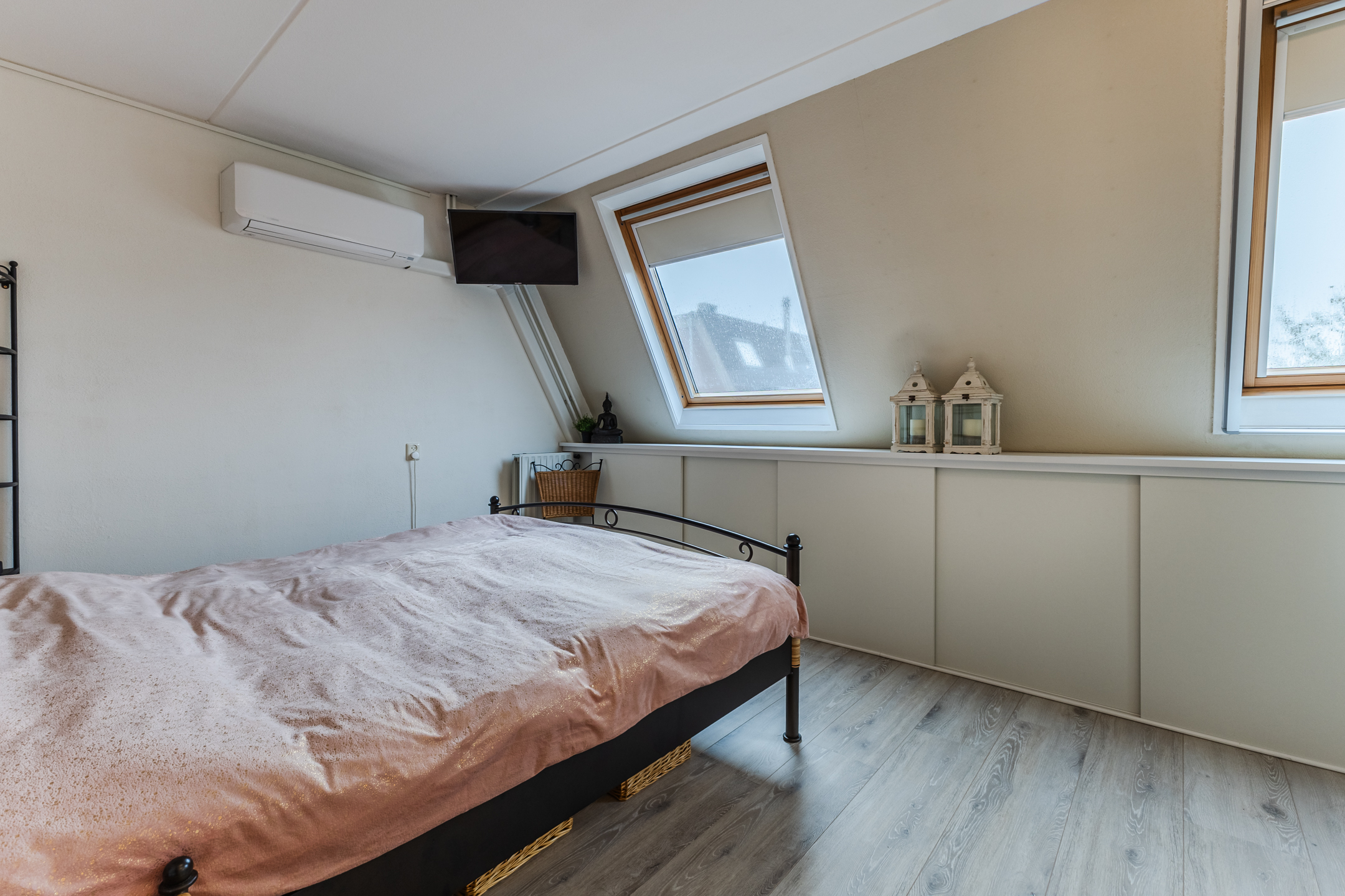 Overloop met toegang tot twee slaapkamers en de badkamer. De grootste slaapkamer heeft twee grote dakramen, bergruimte achter de knieschotten, een schuifwandkast en airconditioning. De tweede slaapkamer ligt aan de andere kant van de woning en heeft, net als de rest van de verdieping, een laminaatvloer.