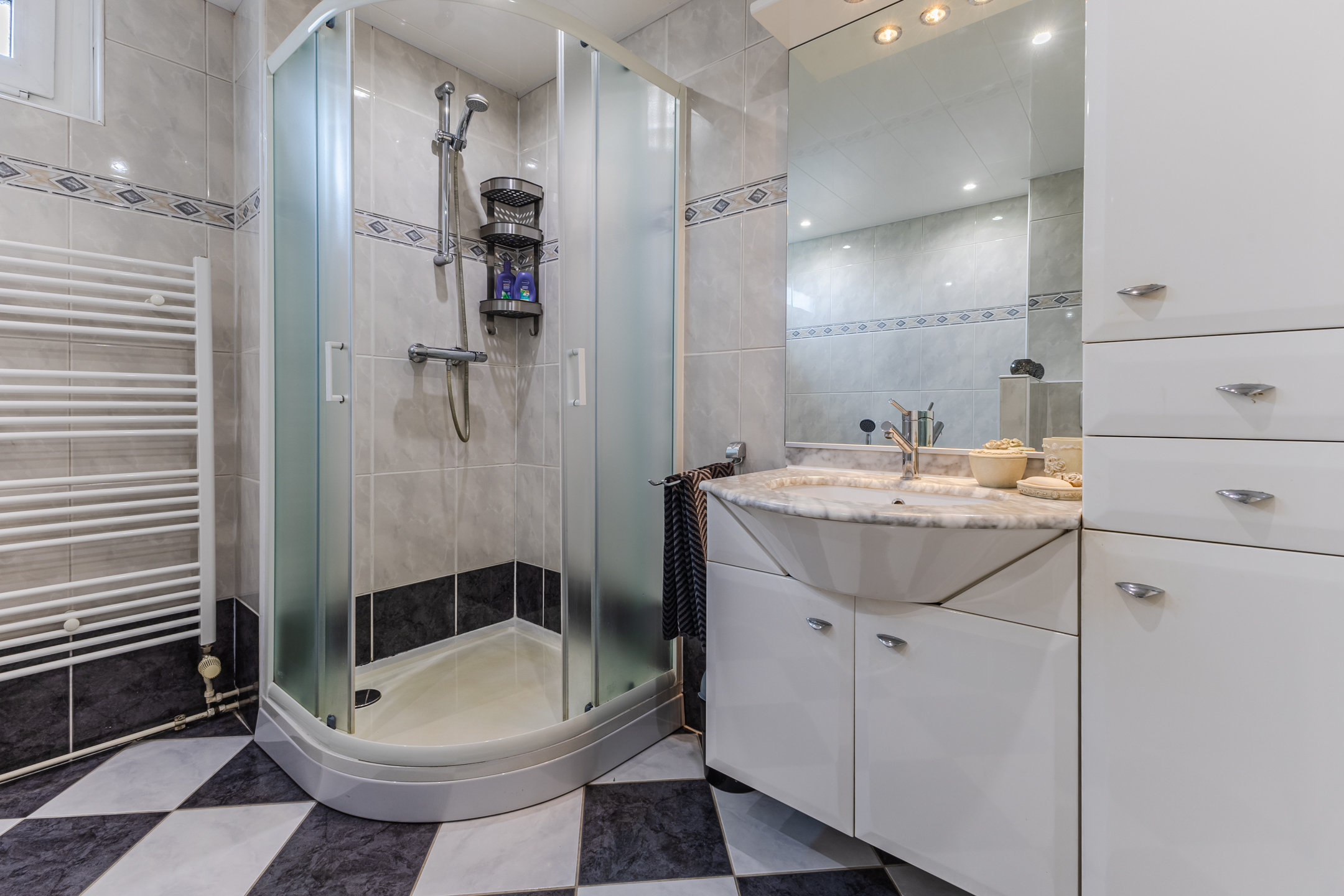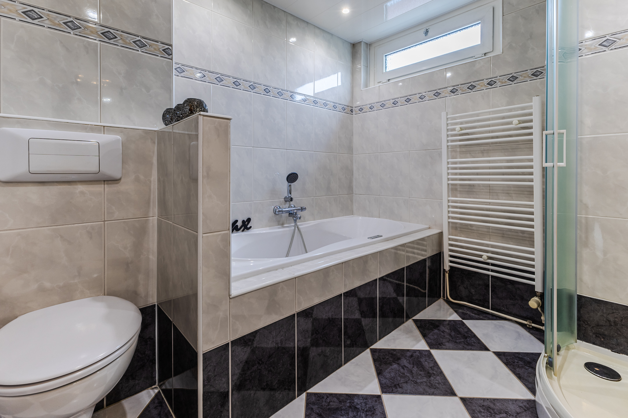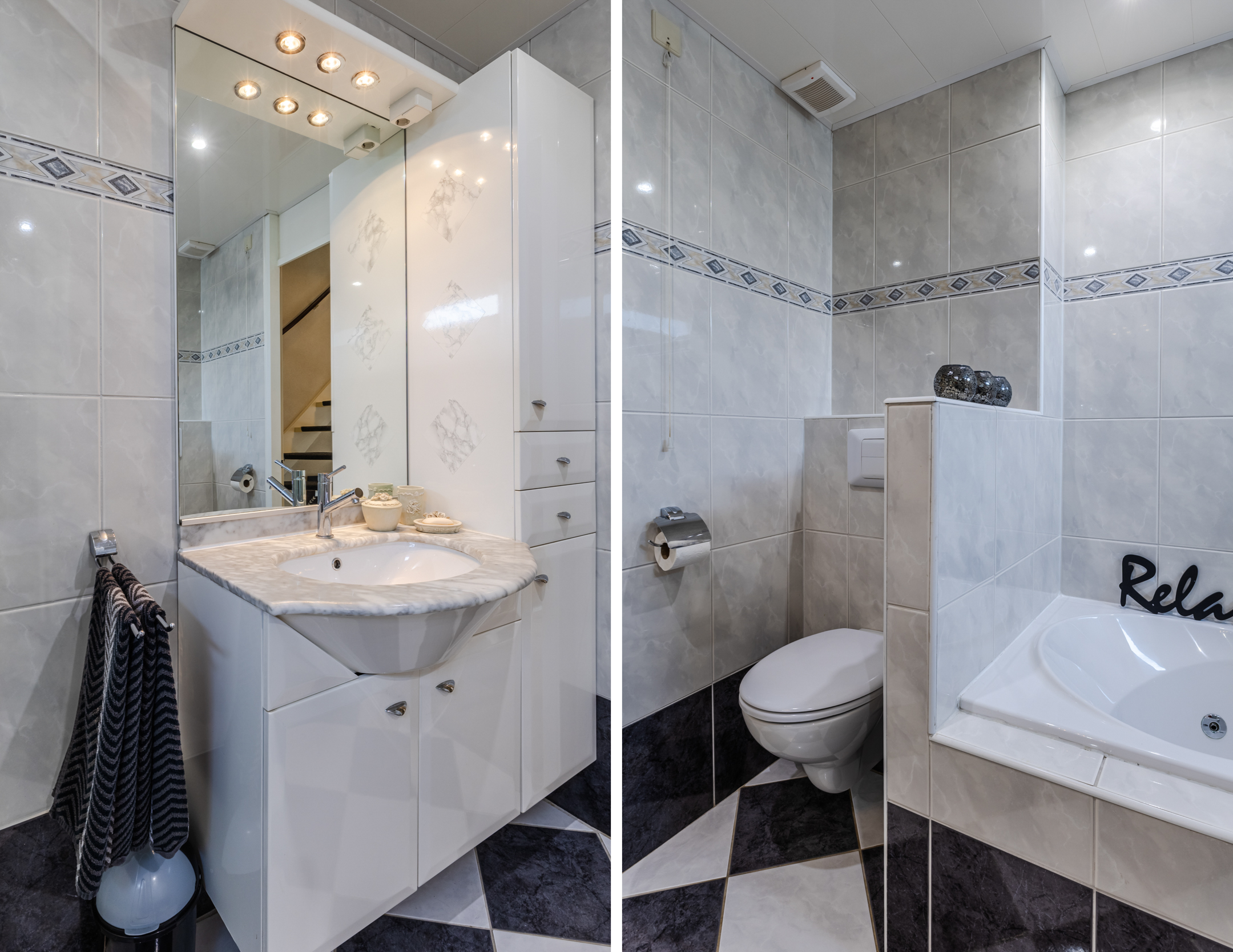 De badkamer is ruim en volledig betegeld, en is ingericht met een douchecabine, een ligbad, een tweede inbouwtoilet, een wastafelmeubel en een handdoekradiator.