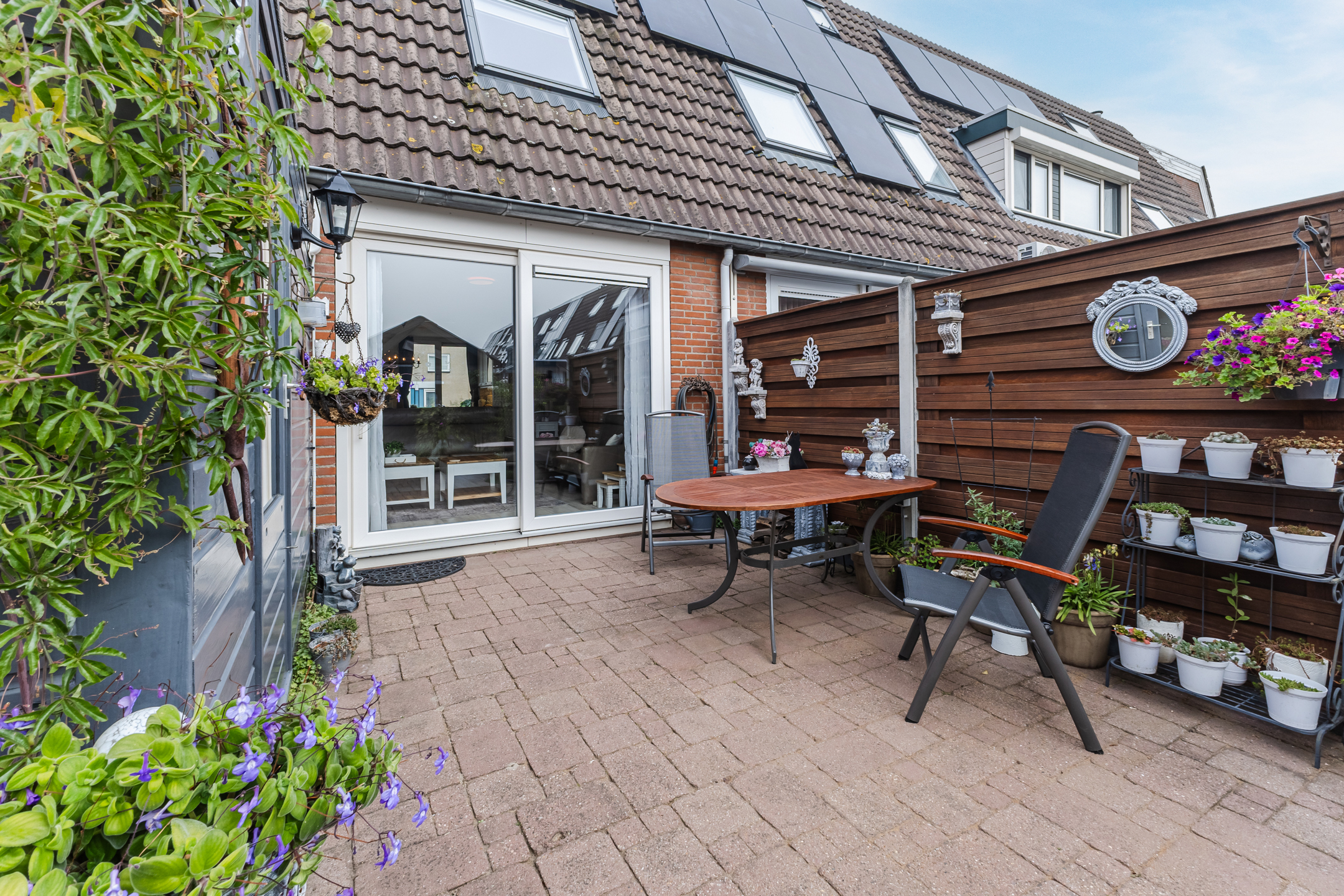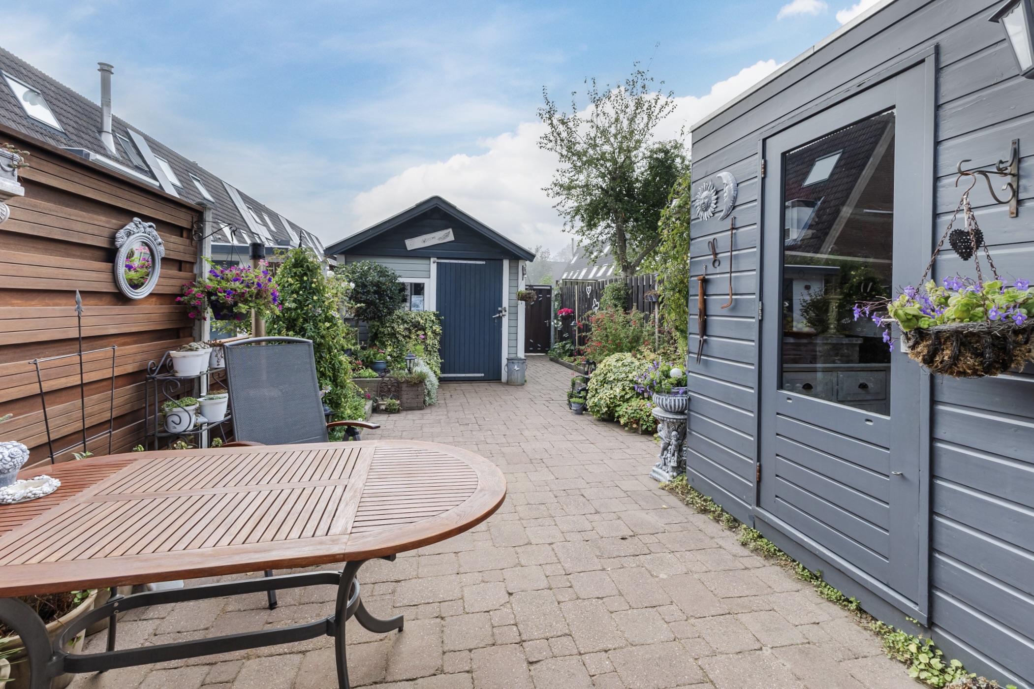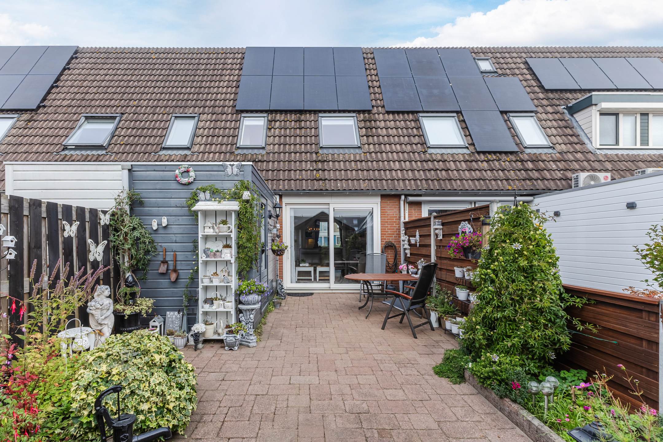 De achtertuin is onderhoudsvriendelijk en toch sfeervol aangelegd met sierbestrating, plantenborders en goede schuttingen. Er is een aangebouwde berging en een vrijstaande berging achter in de tuin. De tuin is achterom bereikbaar, wat ideaal is voor het gemakkelijk binnenzetten van de fietsen of de scooter!
