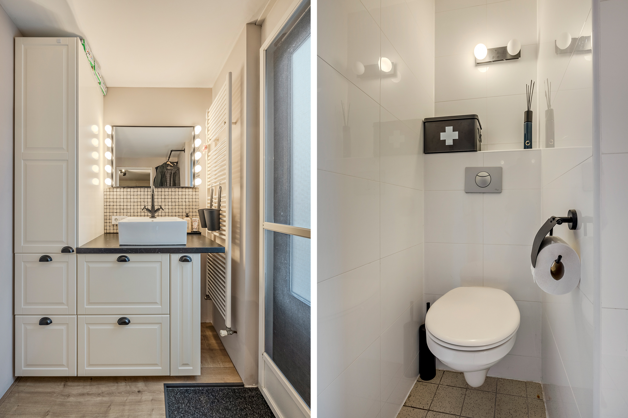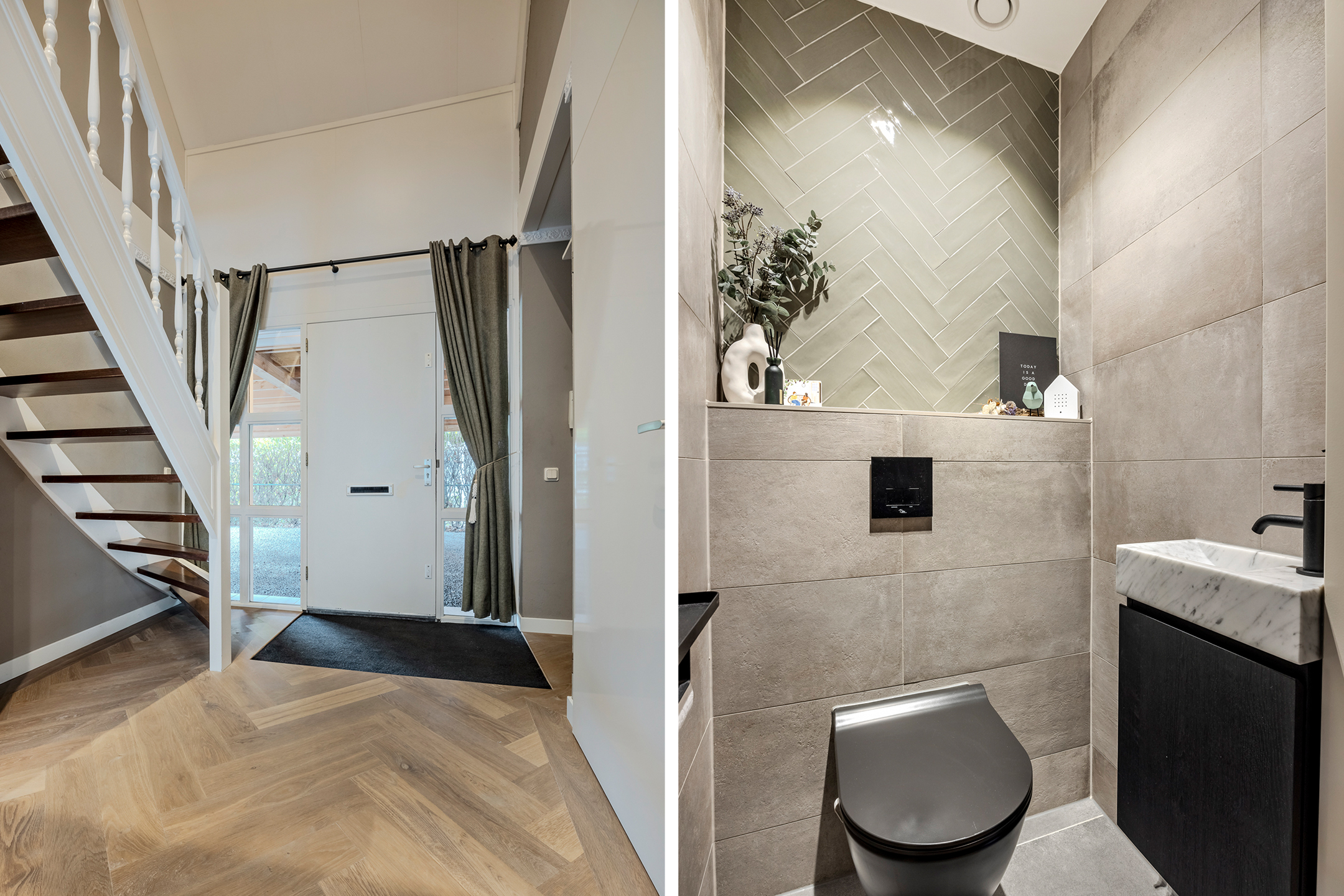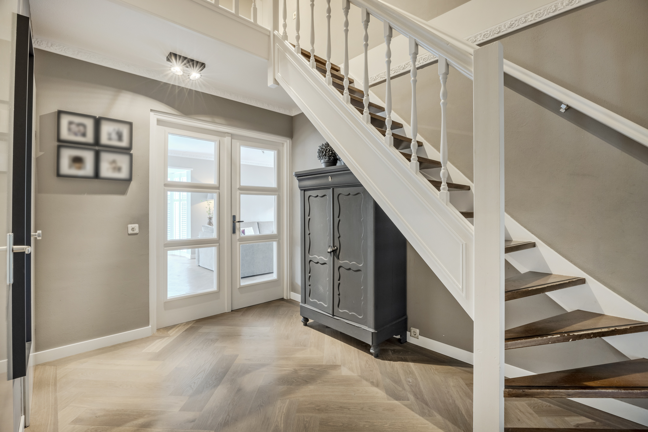 Ruime hal/entree met een open trapopgang en vide, de meterkast, praktische vaste kast en de moderne geheel betegelde toiletruimte met inbouwcloset en handwasbakje. Vanuit de hal komt u binnen in de living, de vele raampartijen en erkers zorgen ervoor dat dit een aangenaam lichte ruimte is, en de openslaande deuren in de woonkamer en de keuken geven een mooie verbinding met de tuin.