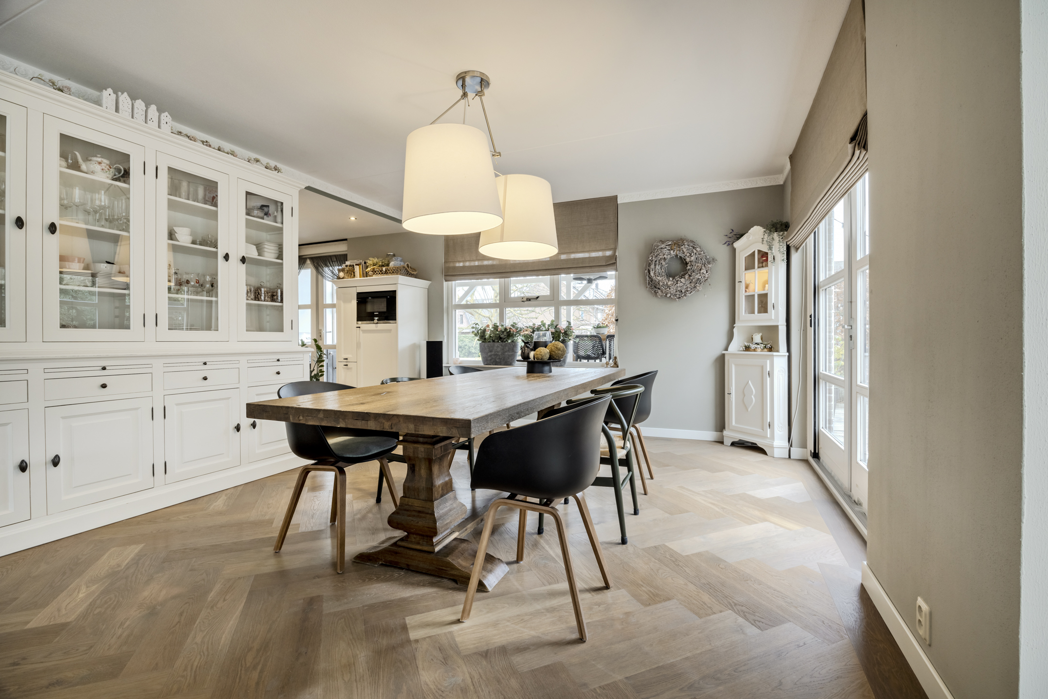De luxe keuken is compleet met inbouwapparatuur als: 5-pits (Falcon) kooktoestel met 3 ovens, afzuigkap, magnetron, vaatwasser, grote Amerikaanse koel-/vriescombinatie en een Quooker kokend waterkraan. De gehele begane grond (kantoorruimte uitgezonderd) heeft een mooie houten visgraatvloer met vloerverwarming.
