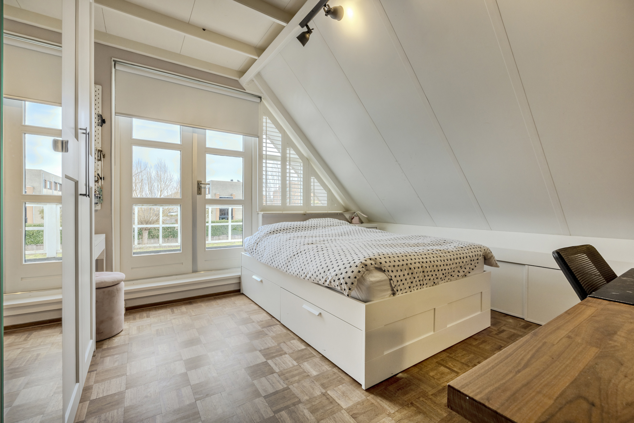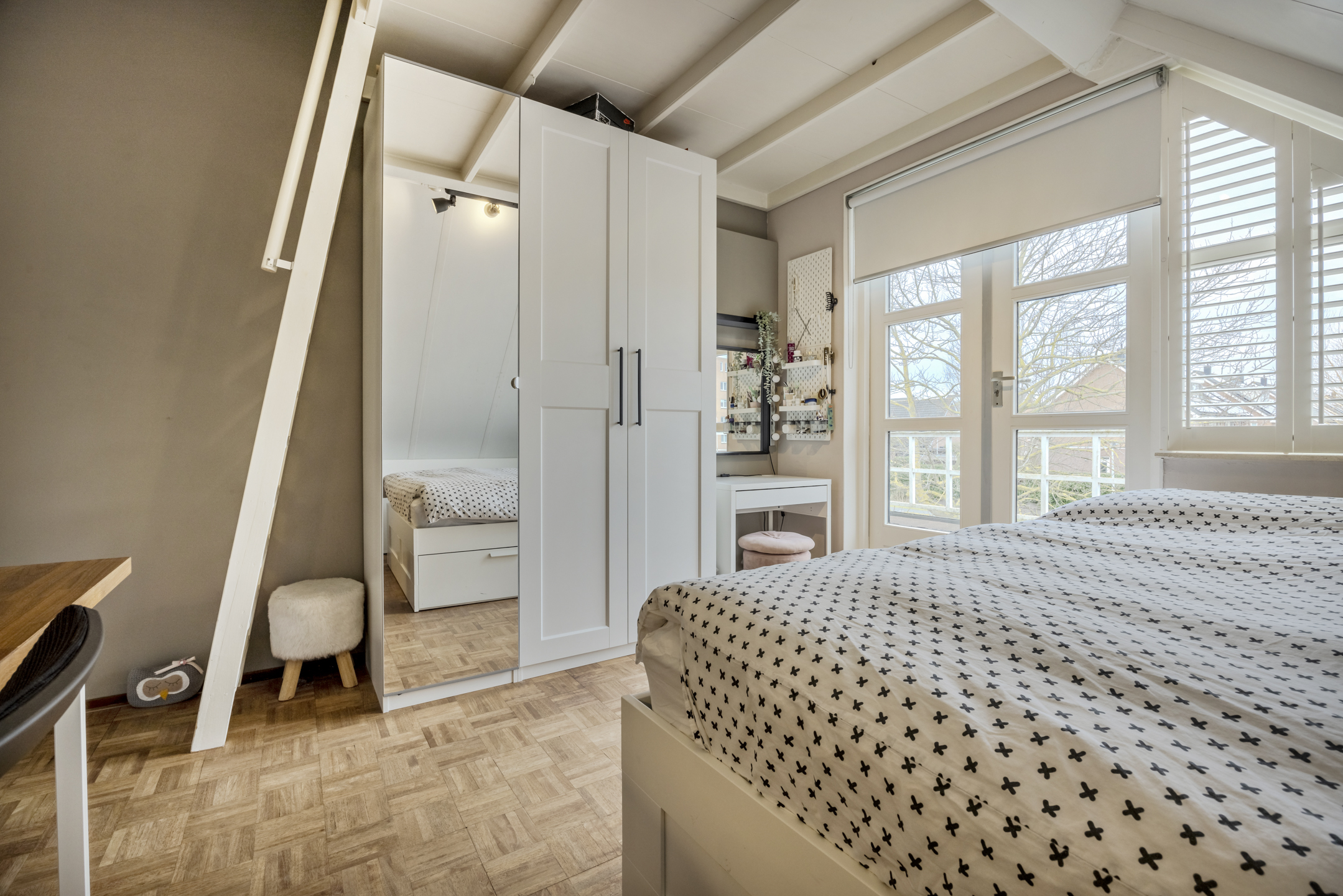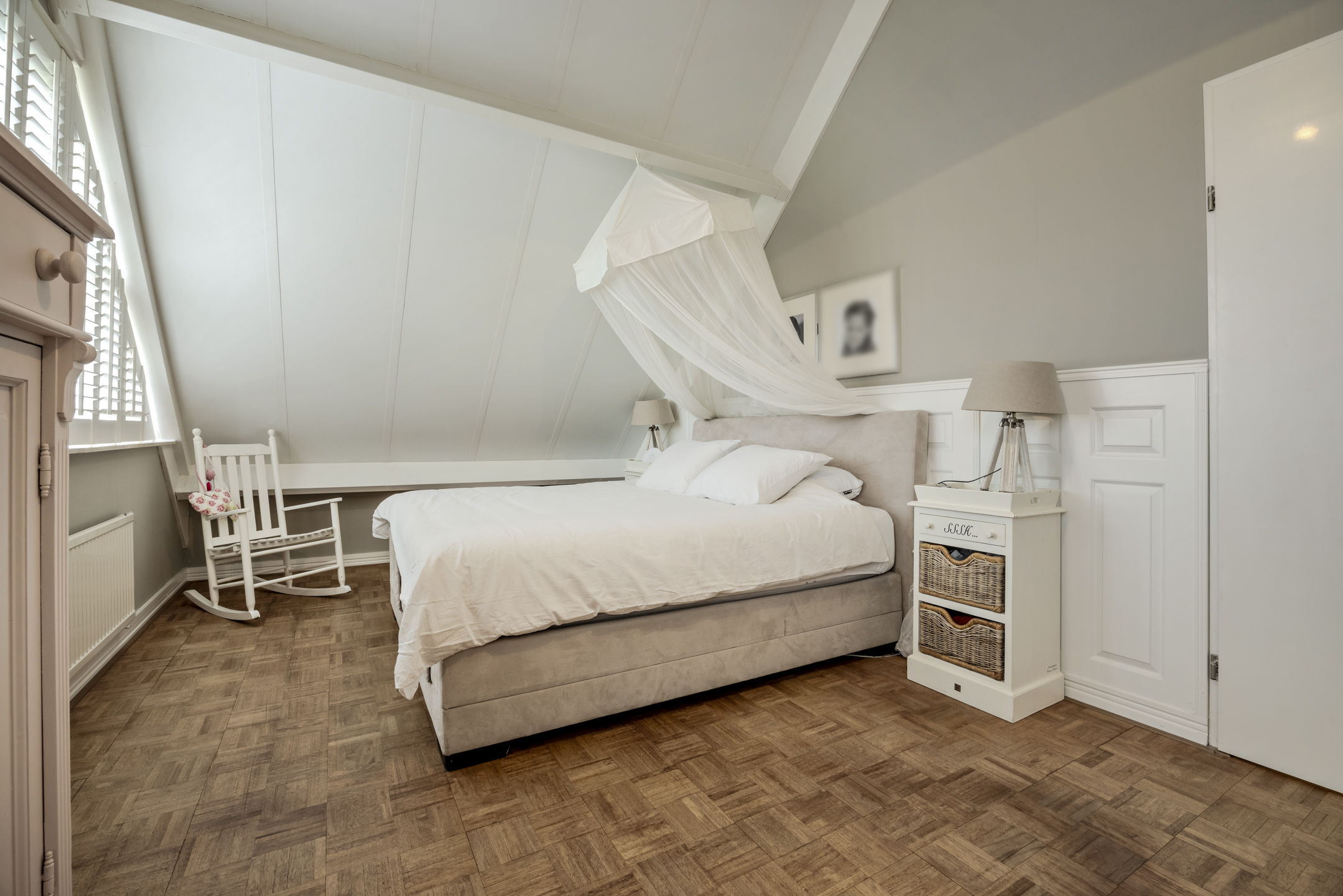 Overloop met vide en toegang tot 3 slaapkamers, de badkamer en de bergzolder met opstelplaats van de cv-combiketel (2022) en de omvormer van de zonnepanelen. De ‘masterbedroom’ aan de voorzijde beslaat de volledige breedte van de woning en beschikt over een vaste schuifwandkast. De twee slaapkamers aan de achterzijde zijn identiek qua afmeting en beschikken beide over een slaapzolder; één van deze kamers heeft openslaande deuren naar het dakterras. De luxe, volledig betegelde badkamer is ingericht met een inloopdouche met hand- en stortdouche, een dubbel wastafelmeubel en een derde inbouwtoilet.