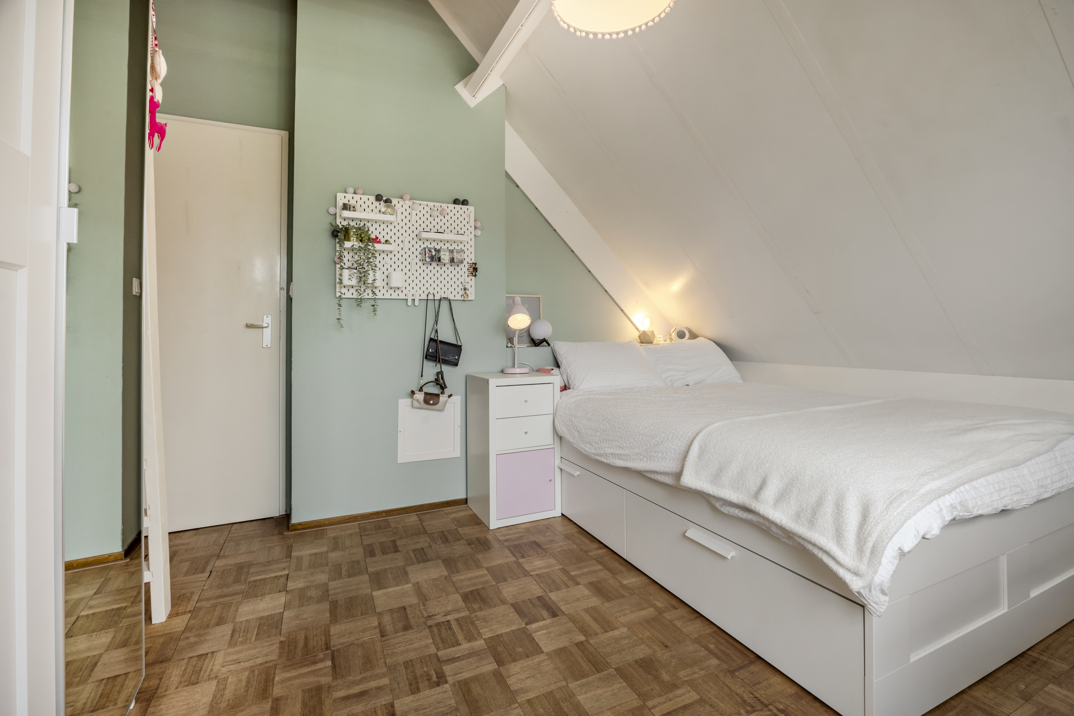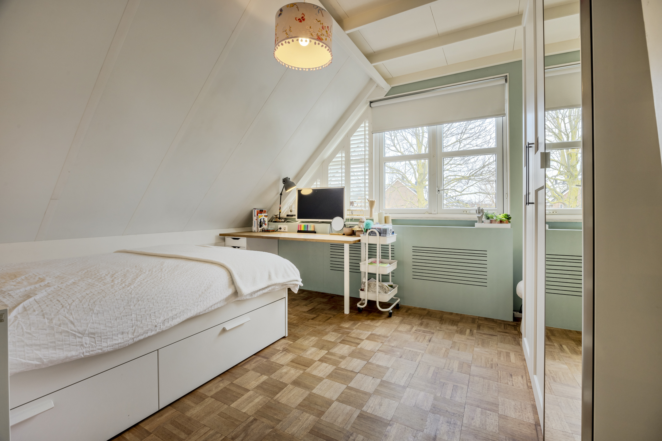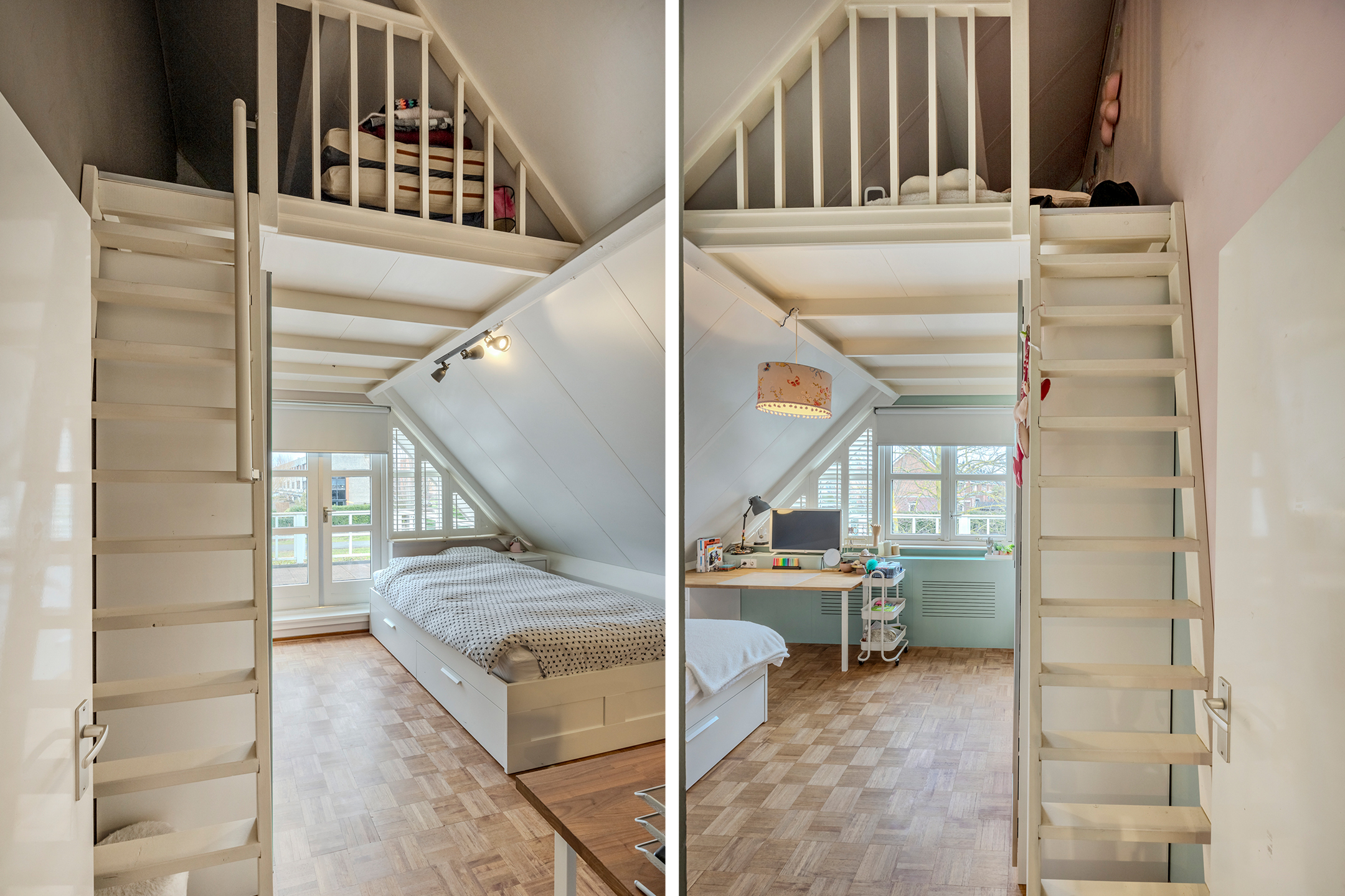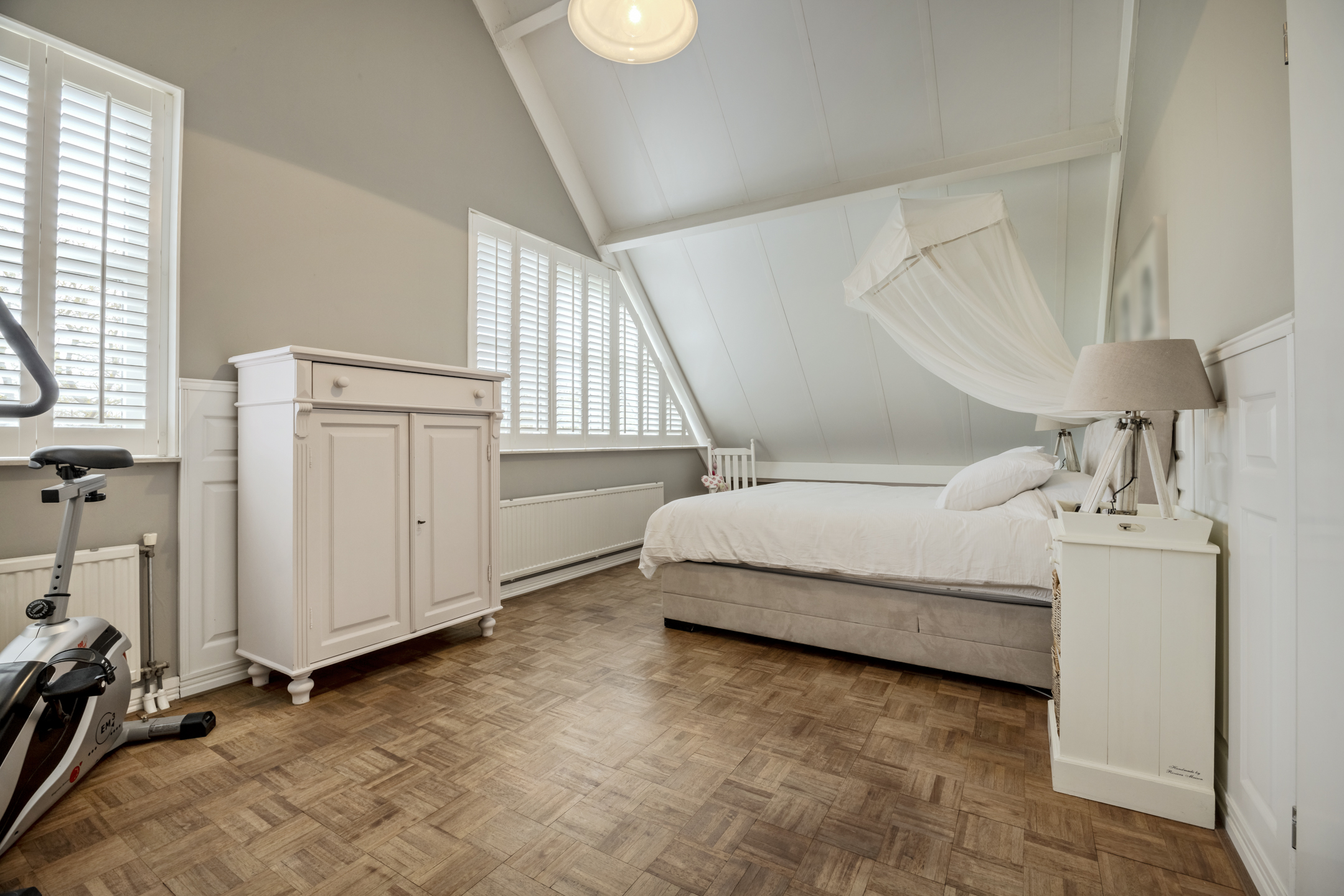 Overloop met vide en toegang tot 3 slaapkamers, de badkamer en de bergzolder met opstelplaats van de cv-combiketel (2022) en de omvormer van de zonnepanelen. De ‘masterbedroom’ aan de voorzijde beslaat de volledige breedte van de woning en beschikt over een vaste schuifwandkast. De twee slaapkamers aan de achterzijde zijn identiek qua afmeting en beschikken beide over een slaapzolder; één van deze kamers heeft openslaande deuren naar het dakterras. De luxe, volledig betegelde badkamer is ingericht met een inloopdouche met hand- en stortdouche, een dubbel wastafelmeubel en een derde inbouwtoilet.