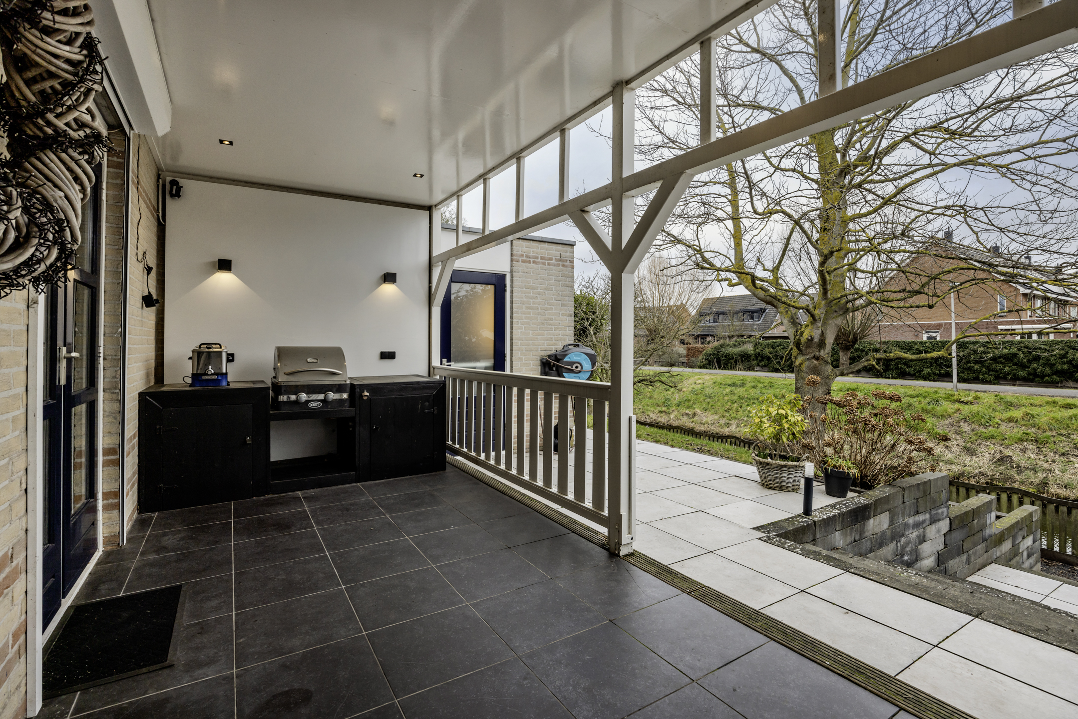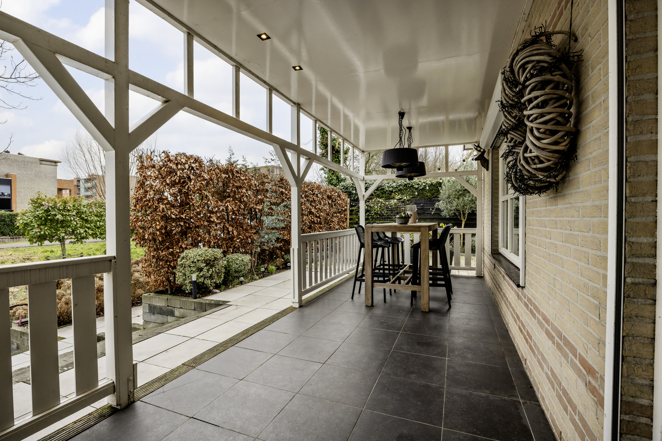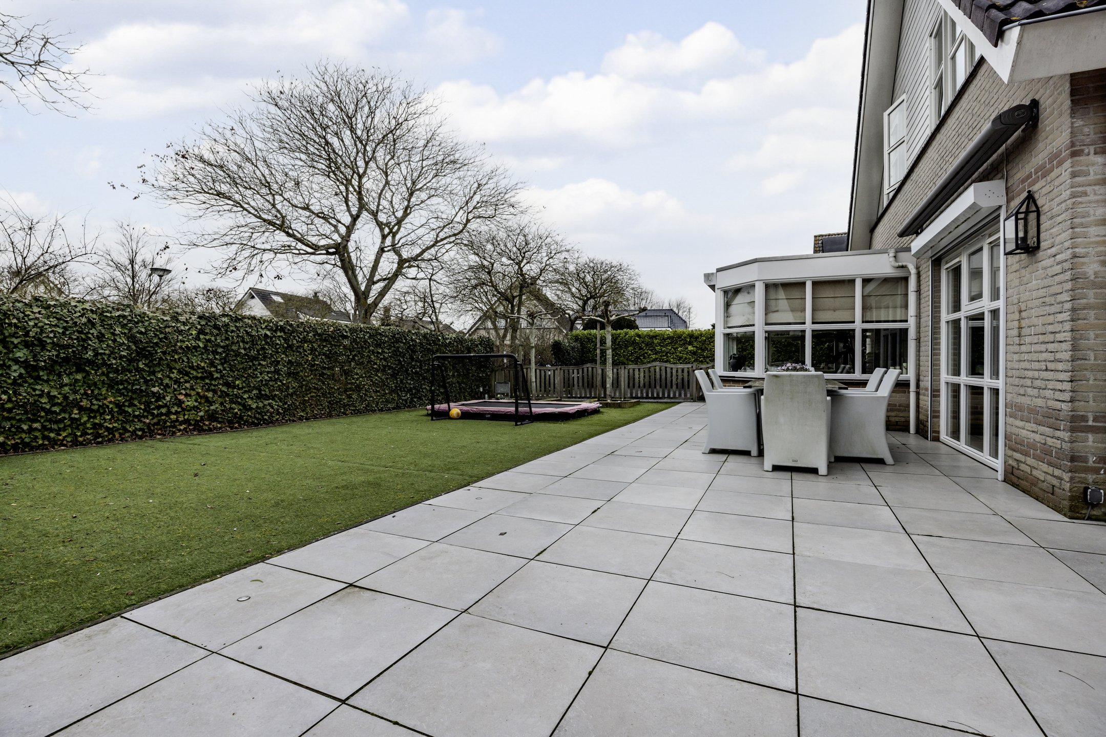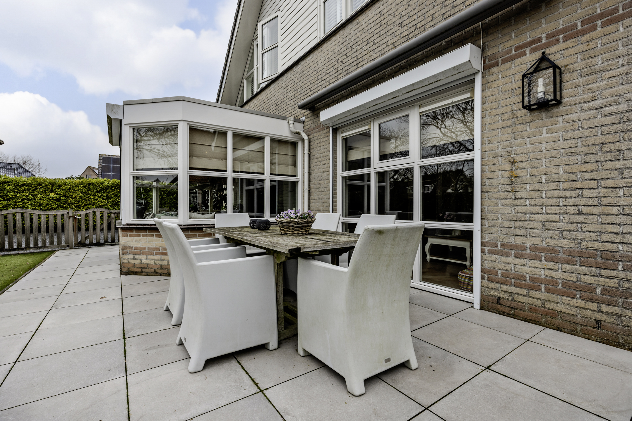 De keurig aangelegde en verzorgde tuin is rondom de woning gelegen. De overkapping biedt een heerlijke plek om ’s avonds of op zonnige dagen te vertoeven, en door de verschillende terrassen/zitjes rondom de woning met elektrische zonneschermen, 1 aan de voorkant en 1 aan de zijkant van de woning, kunt u hier altijd een plekje in de zon- of juist in de schaduw vinden.