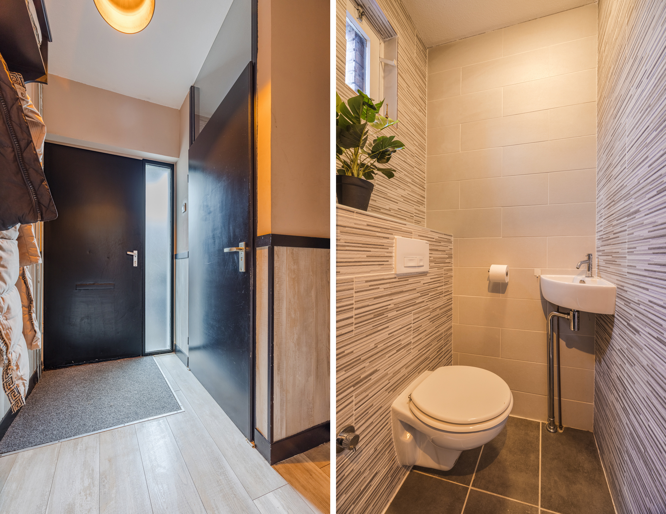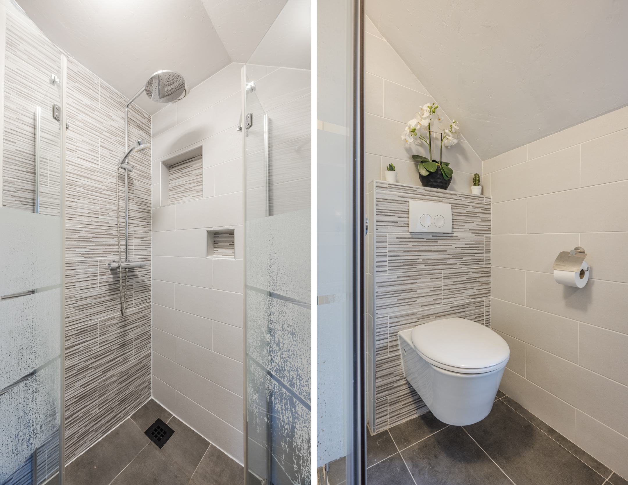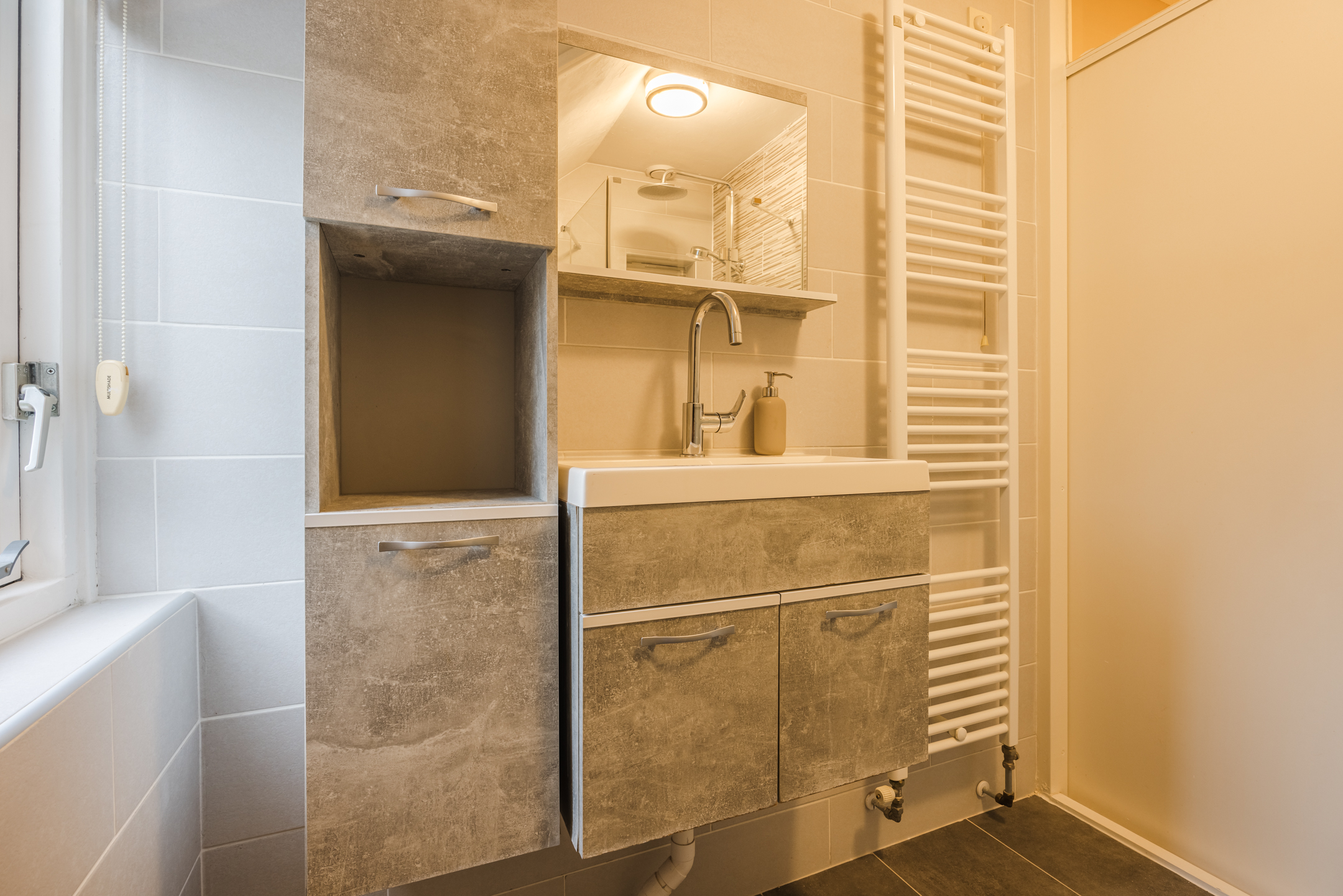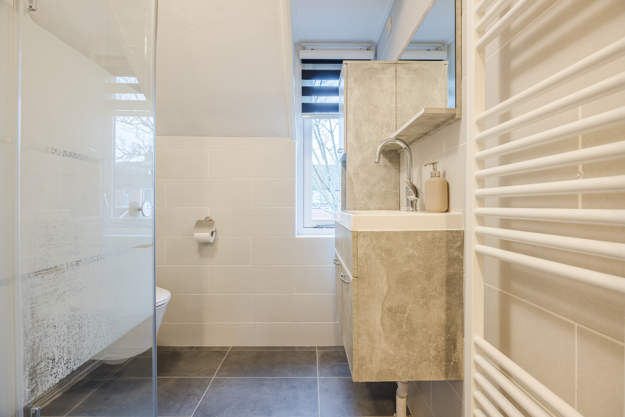Overloop met toegang tot de 3 slaapkamers en moderne badkamer. Alle slaapkamers profiteren van een dakkapel en hebben een laminaatvloer. De badkamer is in dezelfde moderne stijl afgewerkt als het toilet en is ingericht met een douchecabine, een wastafelmeubel, 2e inbouwtoilet, handdoekradiator en er is een raam voor daglicht en natuurlijke ventilatie.