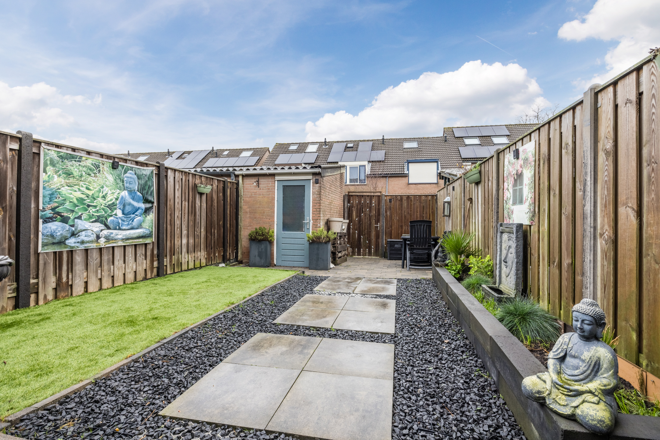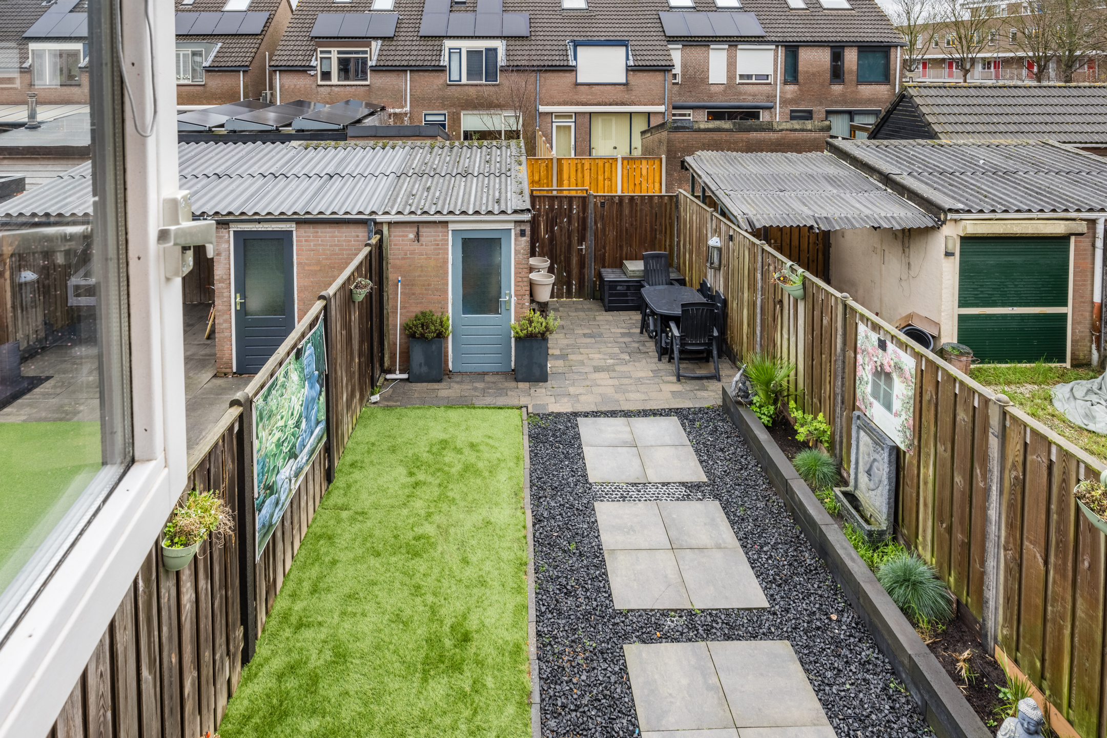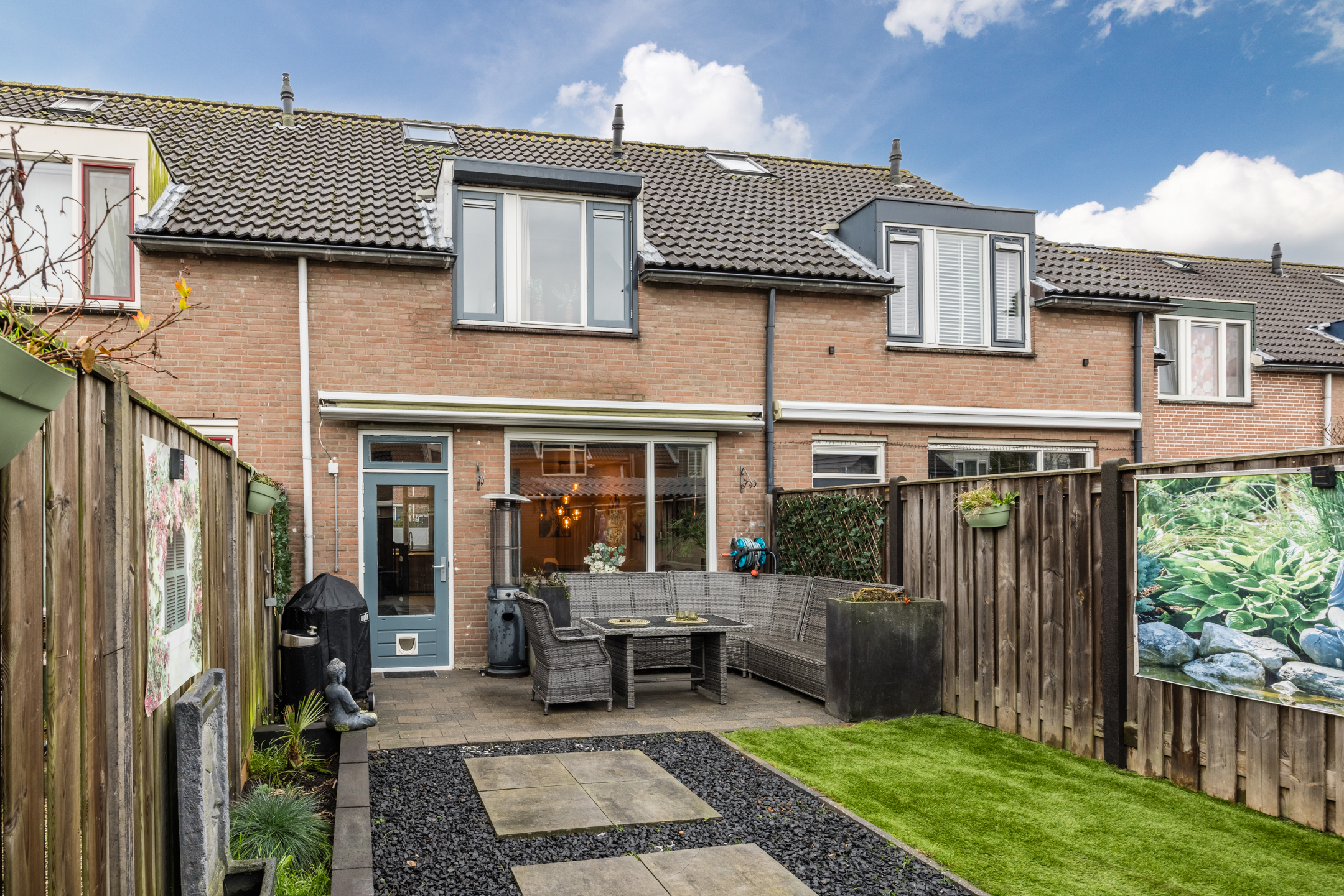De achtertuin ligt op het oosten en is diep genoeg om zowel van zon als van schaduw te genieten. Fraai aangelegd met een terras van sierbestrating en een zonnescherm aan de woning, plantenborder, kunstgras. Daarnaast is er een stenen berging en de tuin is bereikbaar via een achterom.