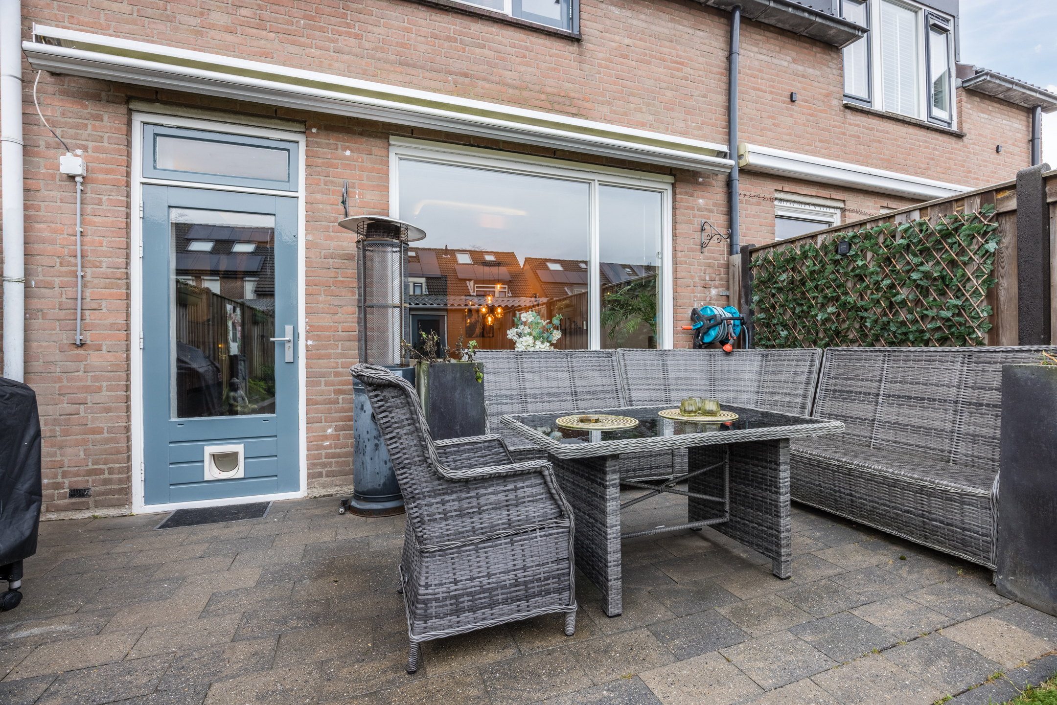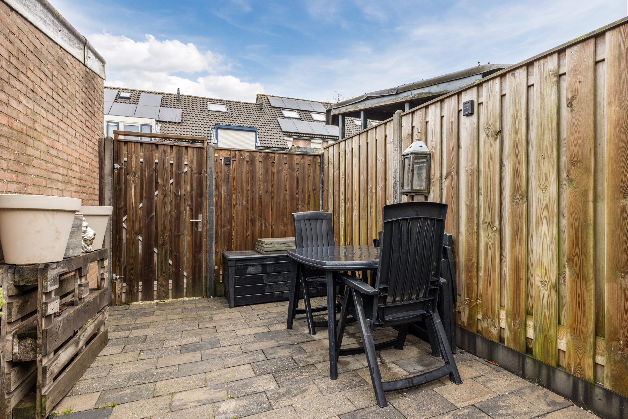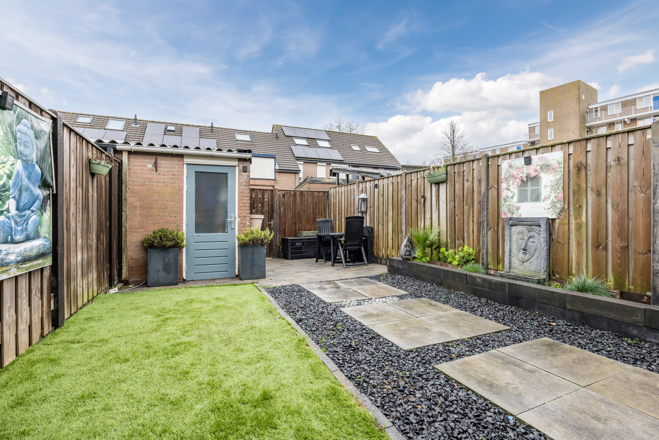 De achtertuin ligt op het oosten en is diep genoeg om zowel van zon als van schaduw te genieten. Fraai aangelegd met een terras van sierbestrating en een zonnescherm aan de woning, plantenborder, kunstgras. Daarnaast is er een stenen berging en de tuin is bereikbaar via een achterom.