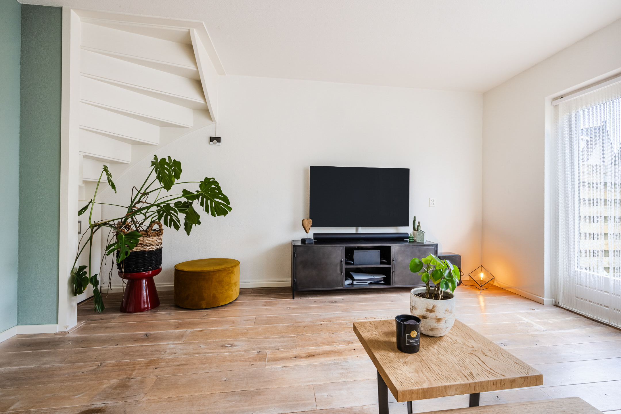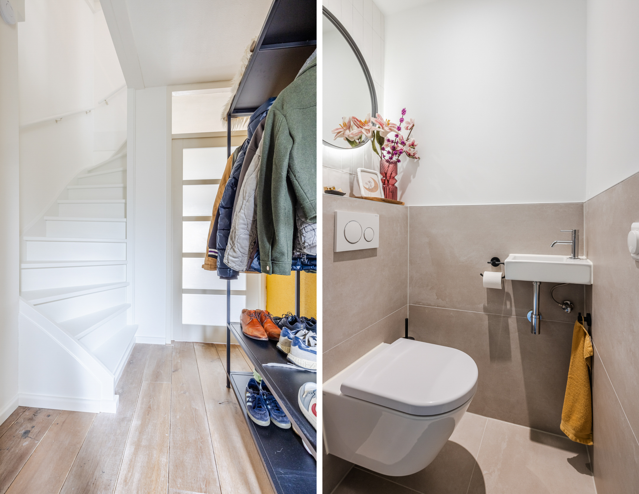 Hal/entree met een moderne toiletruimte (2024) met handwasbakje en inbouwcloset, de meterkast en de trapopgang naar de eerste verdieping. De woonkamer is aangenaam licht, beschikt over een praktische trapkast en via een deur is er toegang tot de achtertuin.