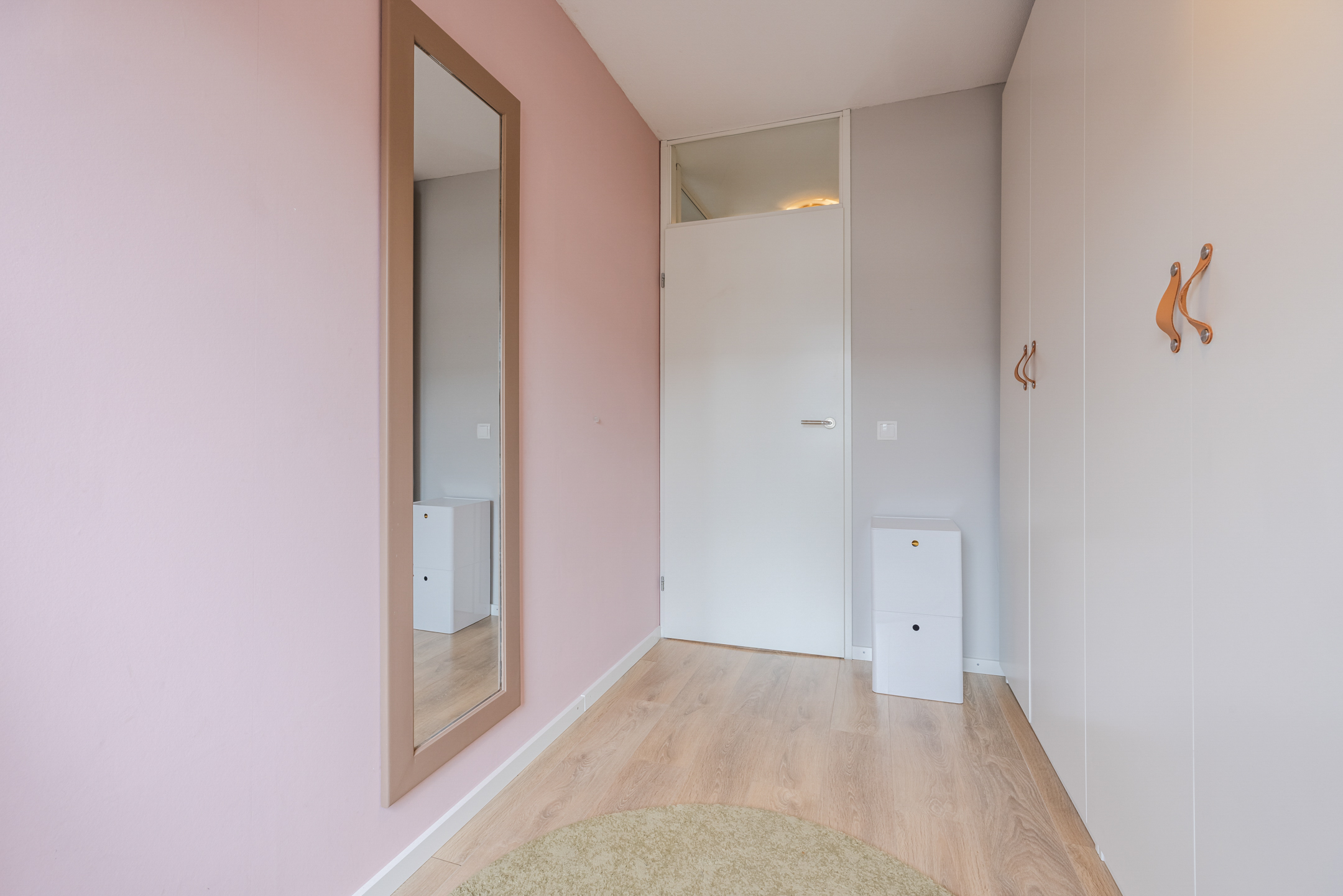 Overloop met toegang tot drie slaapkamers en de badkamer. Alle slaapkamers hebben strakke wanden en een keurig doorgelegde laminaatvloer over de gehele verdieping. De luxe badkamer (2024) is volledig betegeld en uitgerust met een ruime douchecabine met hand- en regendouche, een tweede inbouwtoilet, een wastafelmeubel met twee waskommen en spiegels met verlichting. Daarnaast zorgt de elektrische vloerverwarming voor extra comfort.