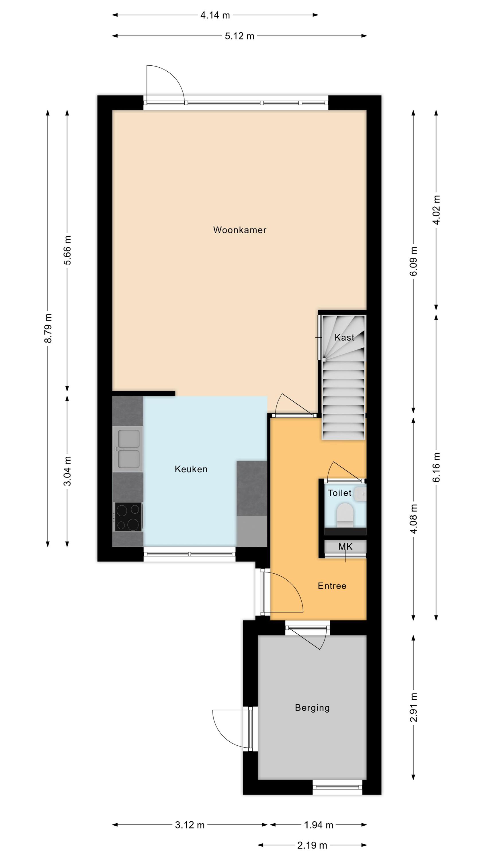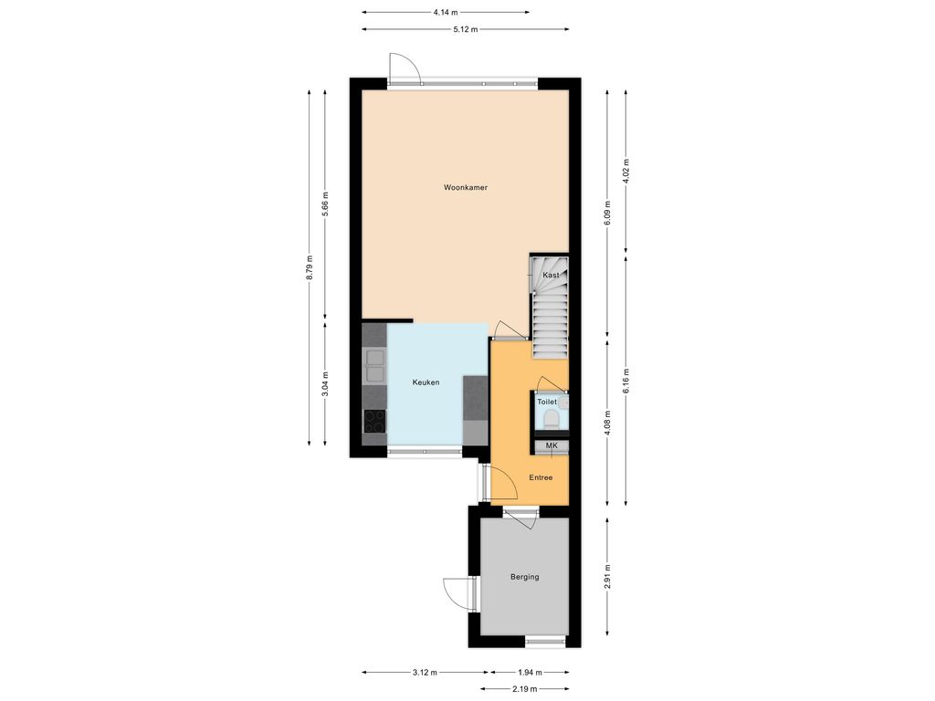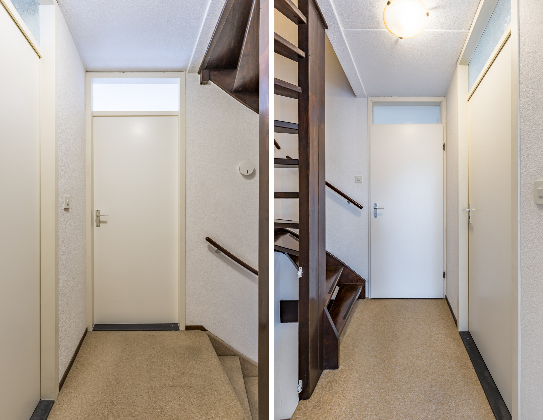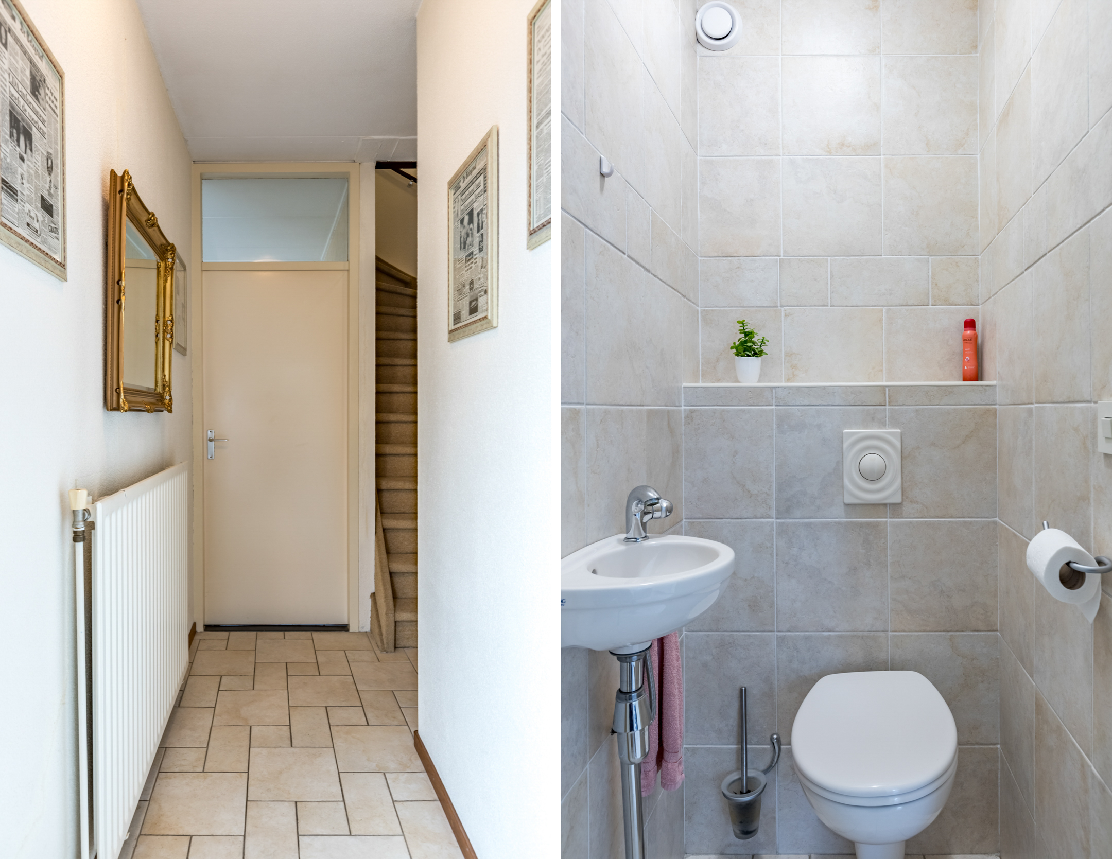 Entree/hal met meterkast, trapopgang, toegang tot de berging en de geheel betegelde toiletruimte met handwasbakje en inbouwcloset.