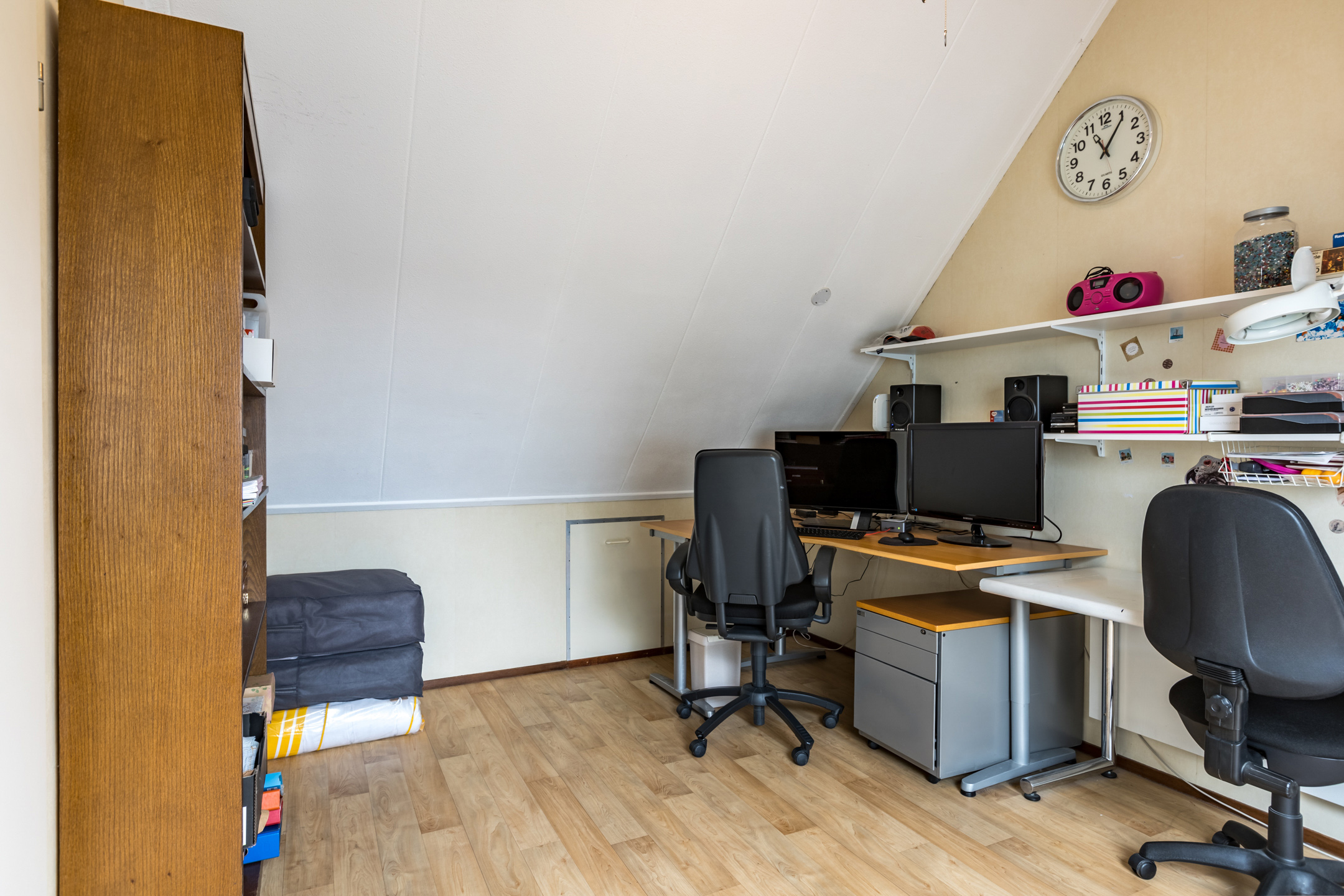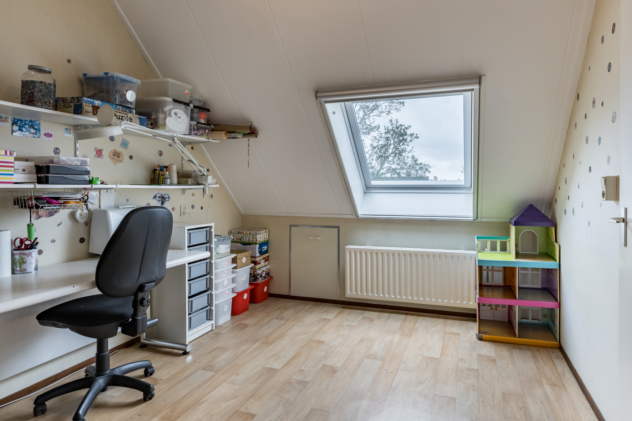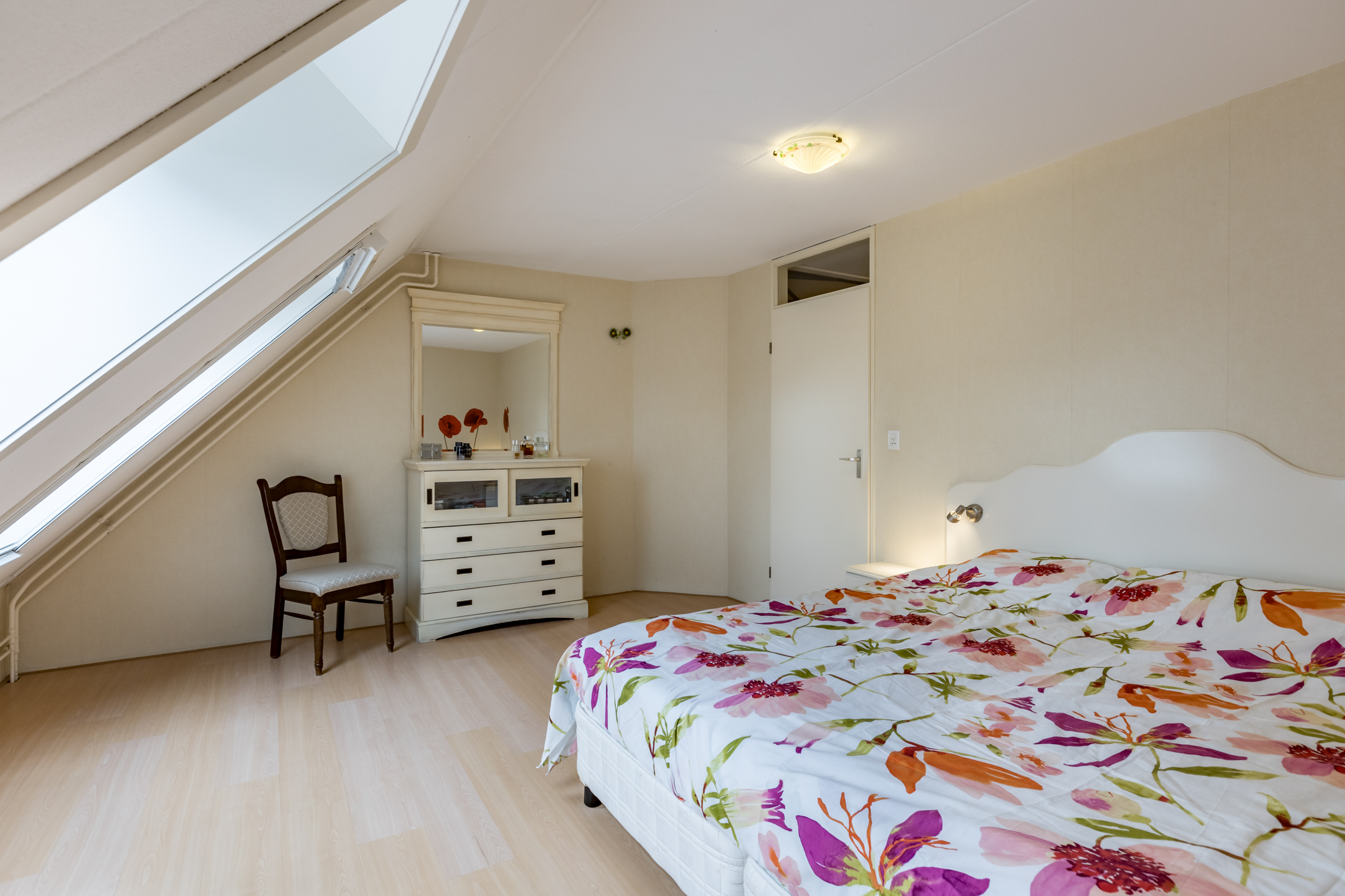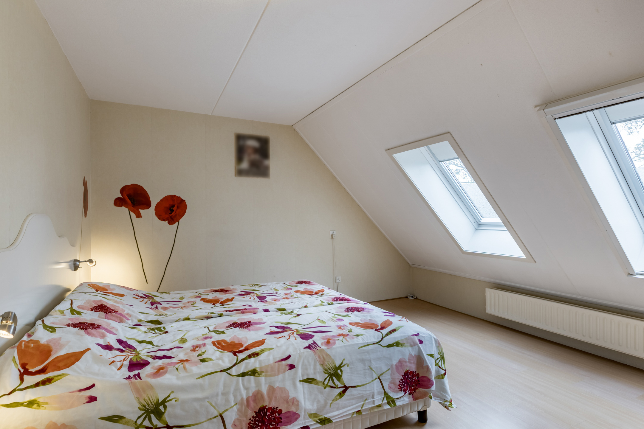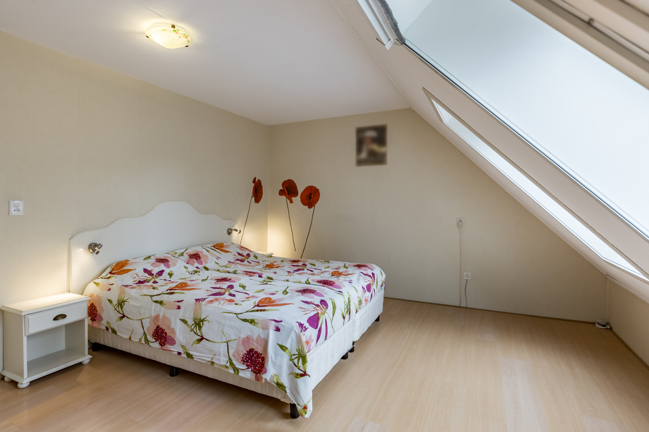 De derde slaapkamer heeft een groot kunststof Velux dakraam met rolhor en verduisterend rolgordijn. Achter de knieschotten bevindt zich extra bergruimte, wat zorgt voor een praktische indeling van de zolderverdieping.