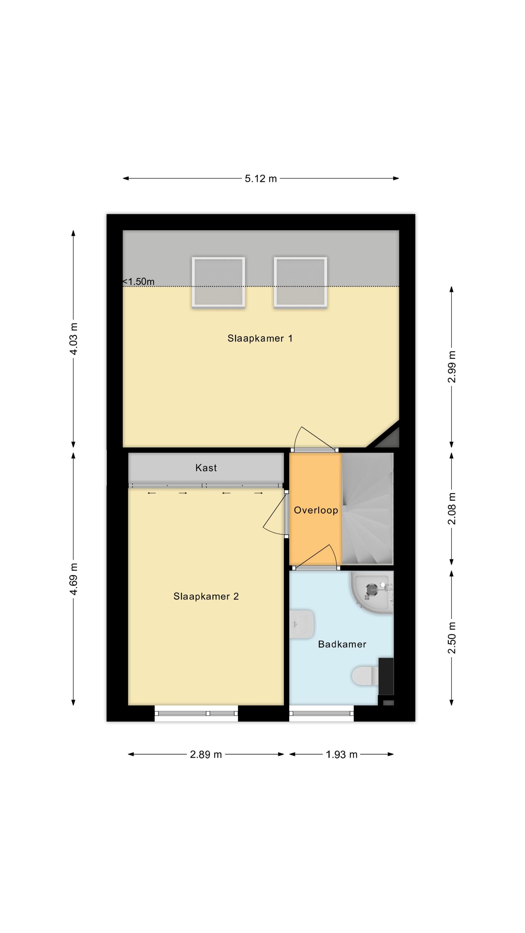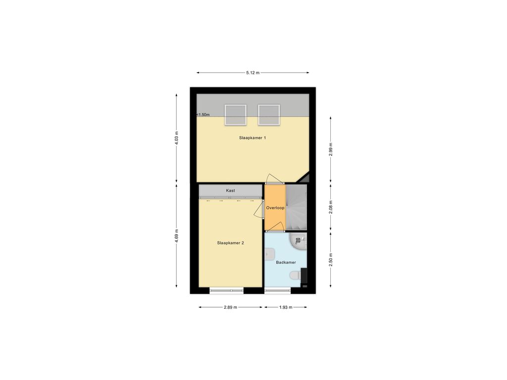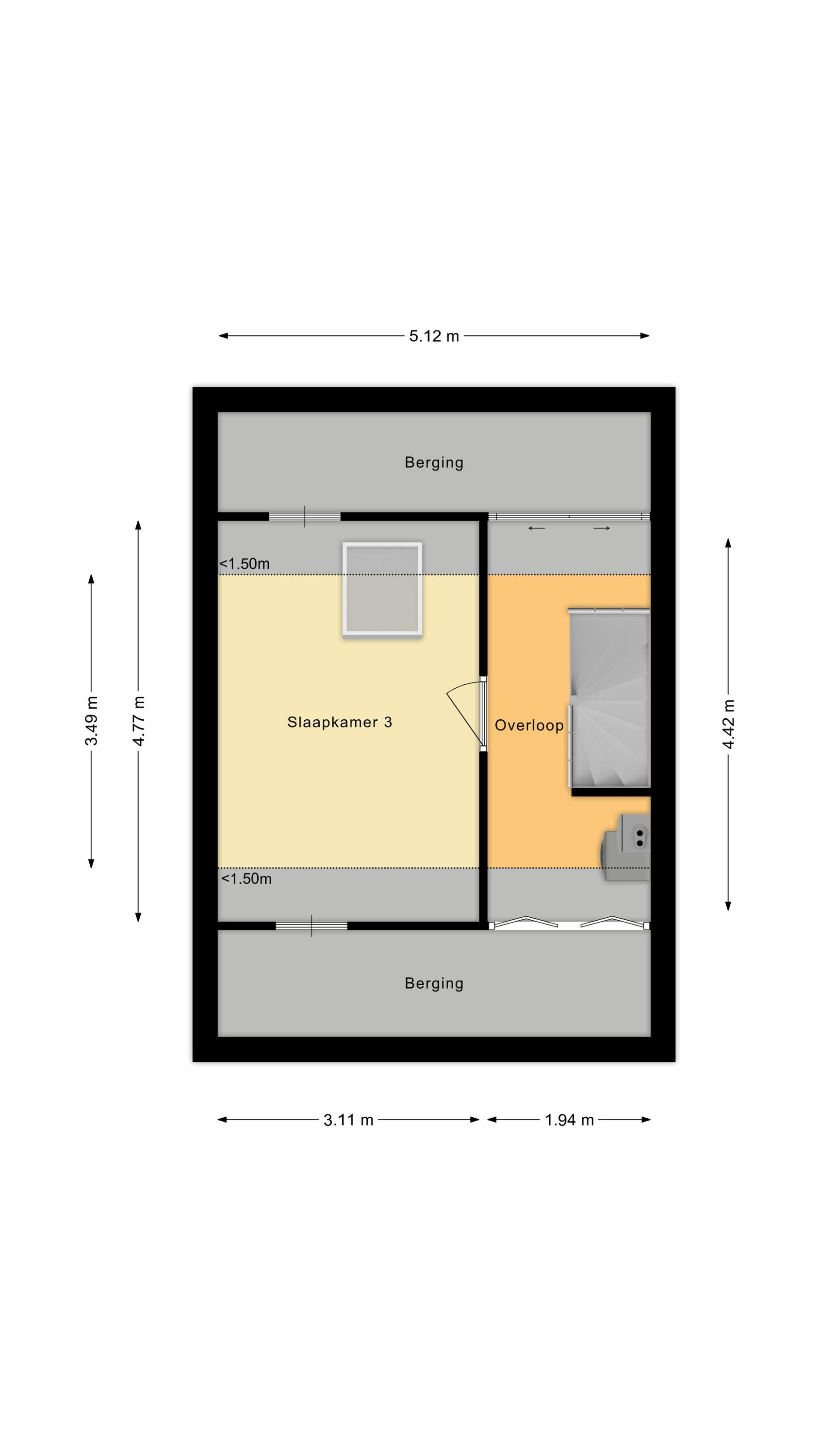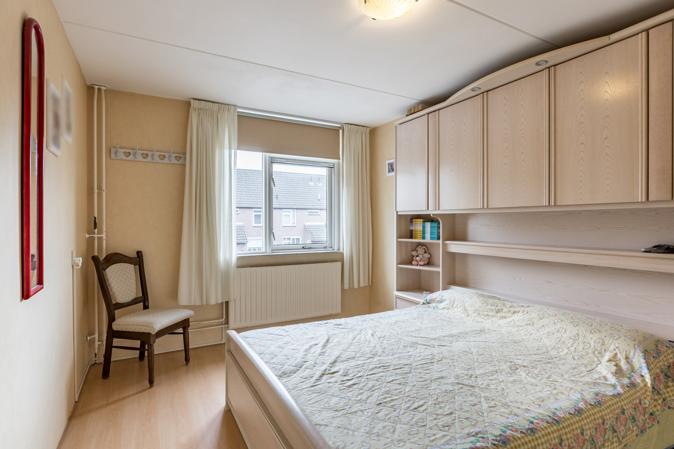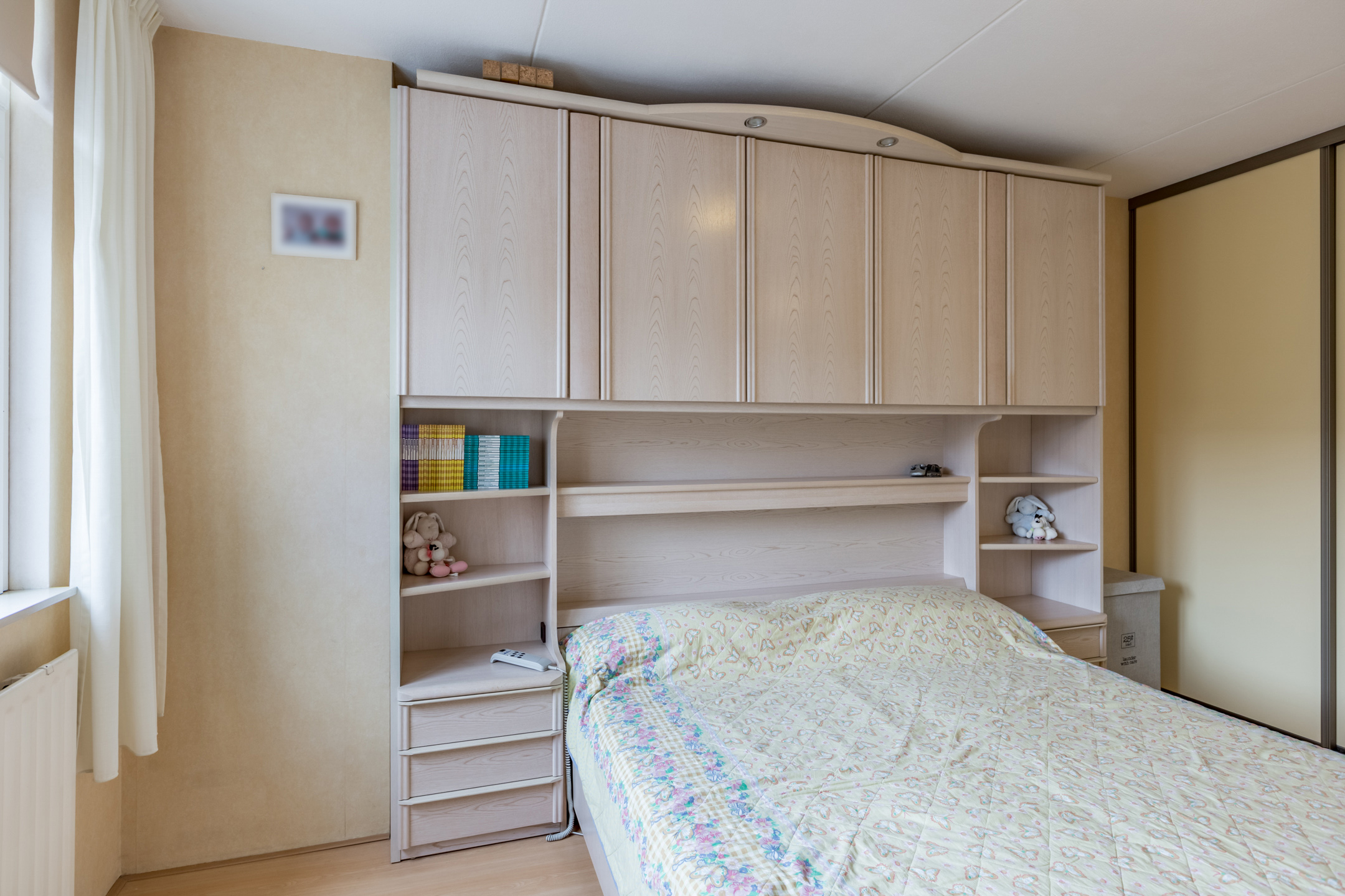 De derde slaapkamer heeft een groot kunststof Velux dakraam met rolhor en verduisterend rolgordijn. Achter de knieschotten bevindt zich extra bergruimte, wat zorgt voor een praktische indeling van de zolderverdieping.