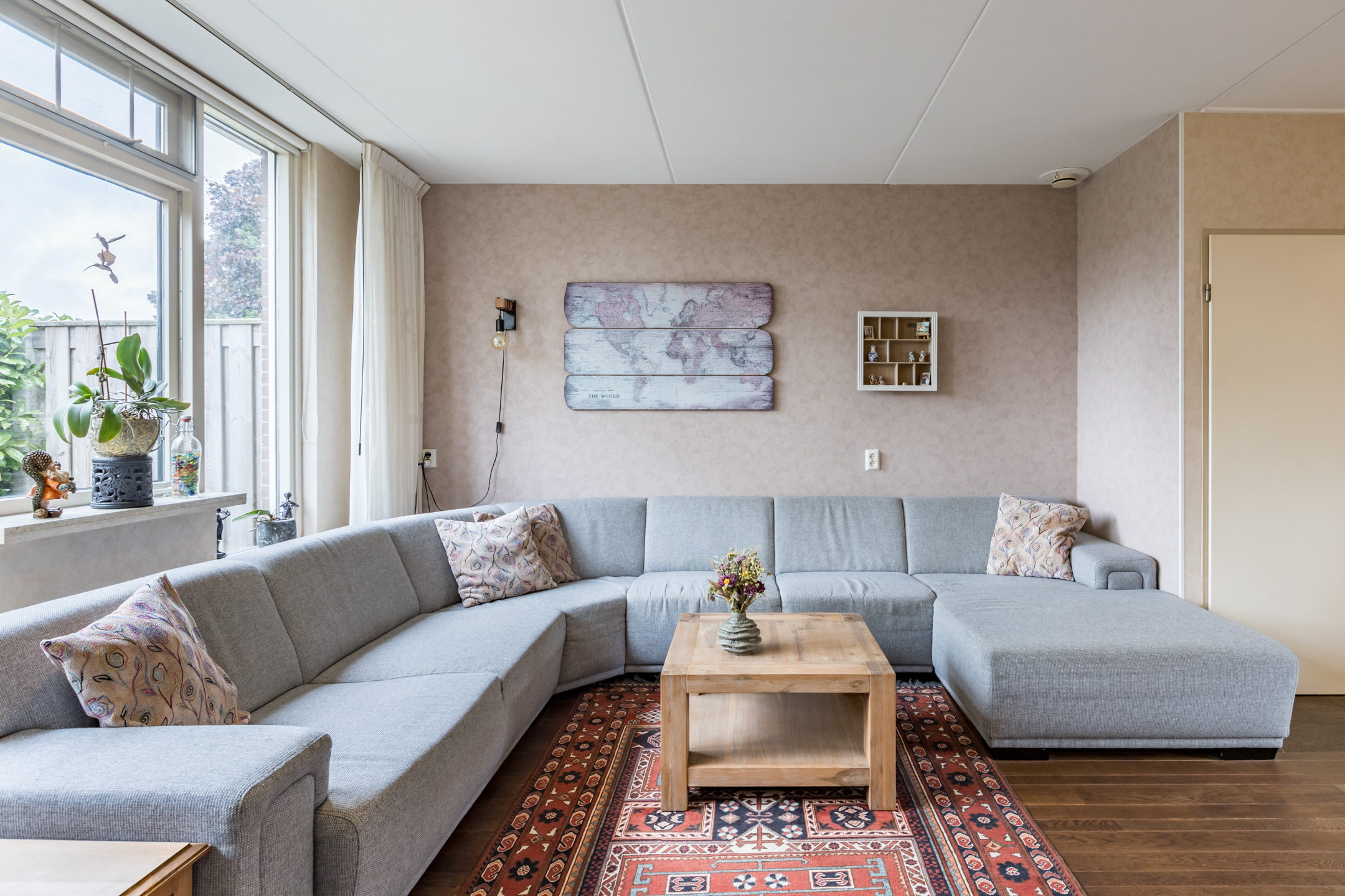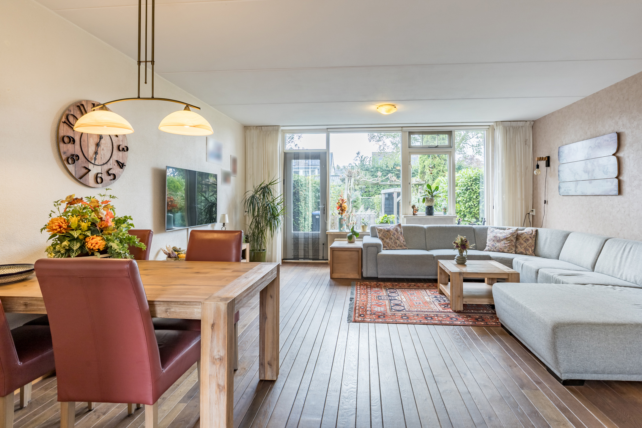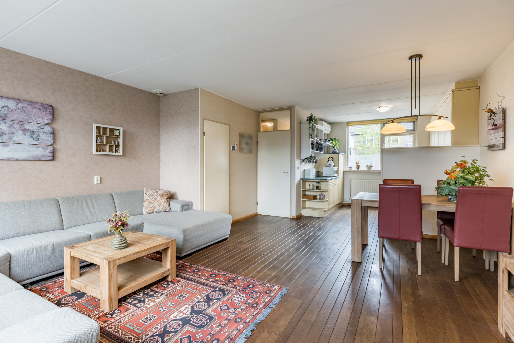 De woonkamer is aangenaam licht, heeft massief houten vloerdelen en er is een praktische trapkast.