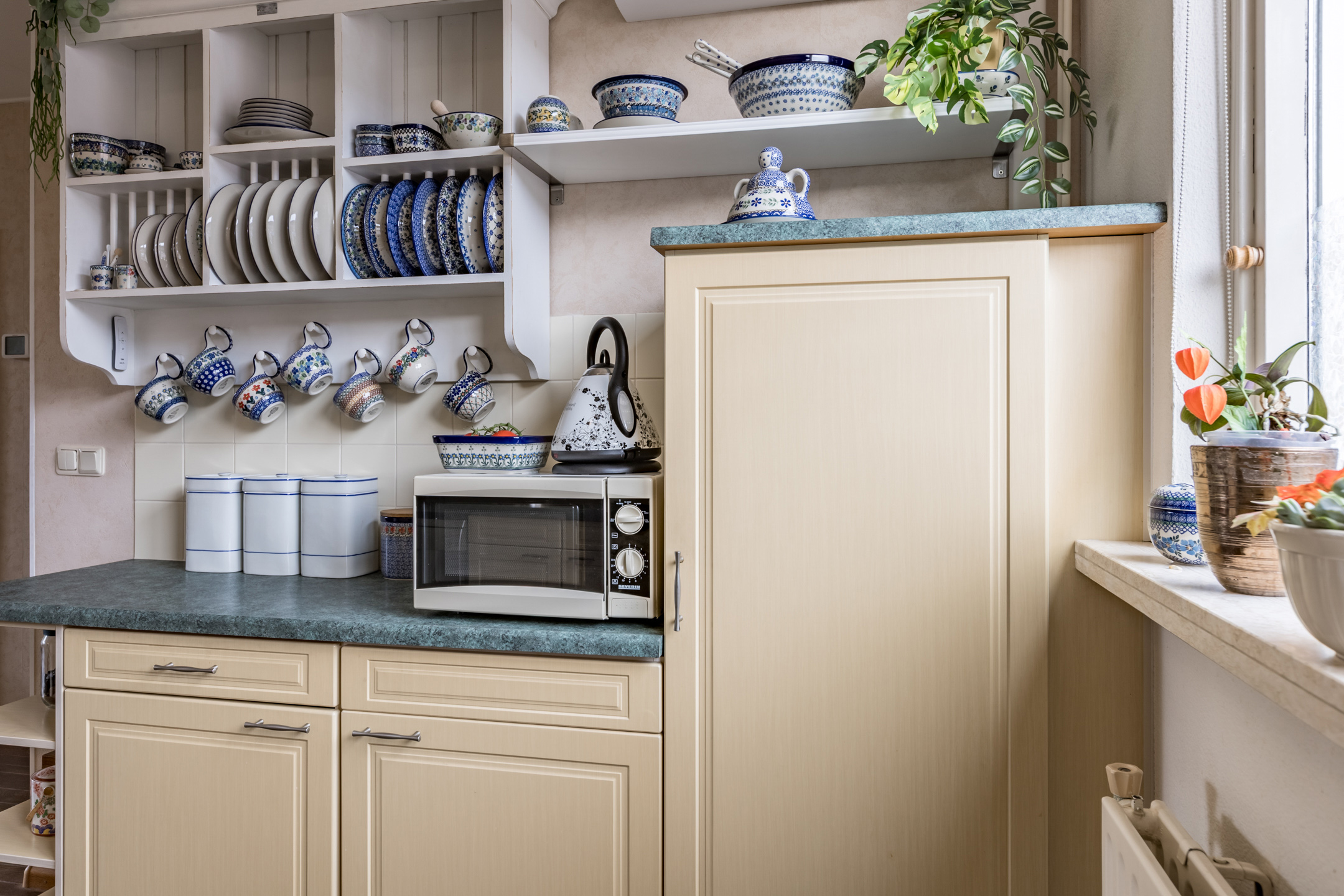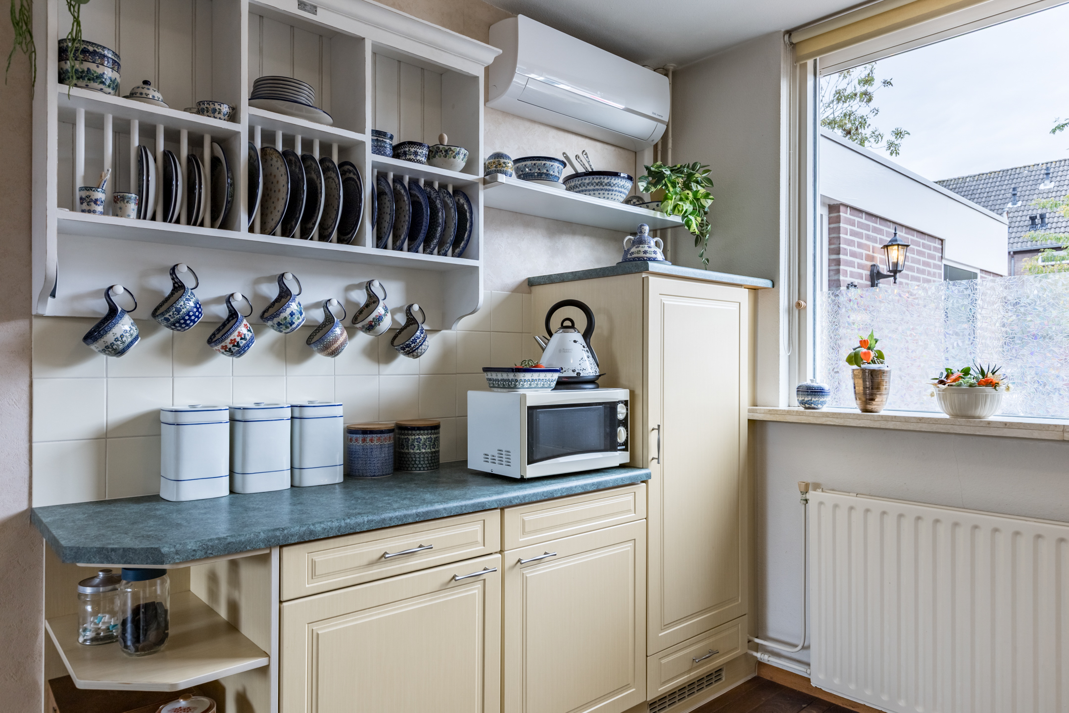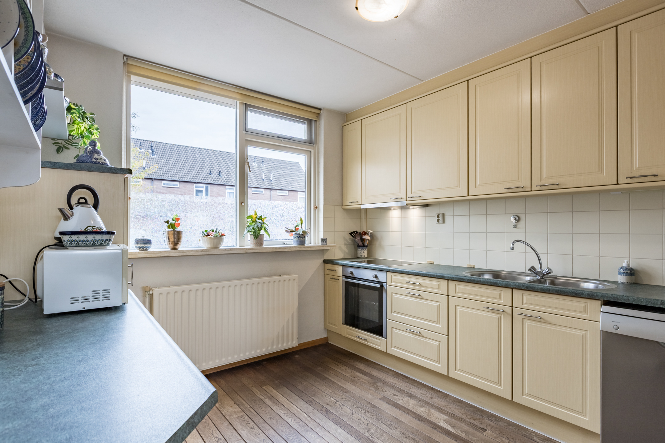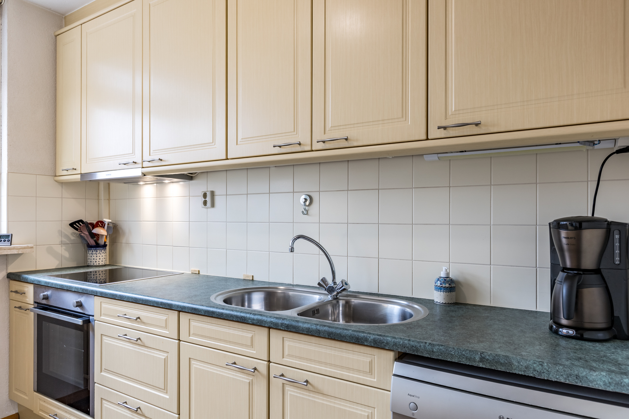 De open keuken bevindt zich aan de voorzijde van de woning en is uitgerust met diverse inbouwapparatuur, waaronder een inductiekookplaat, oven, afzuigkap en koelkast. De vaatwasser is los geplaatst en er is ook een plintboiler aanwezig.