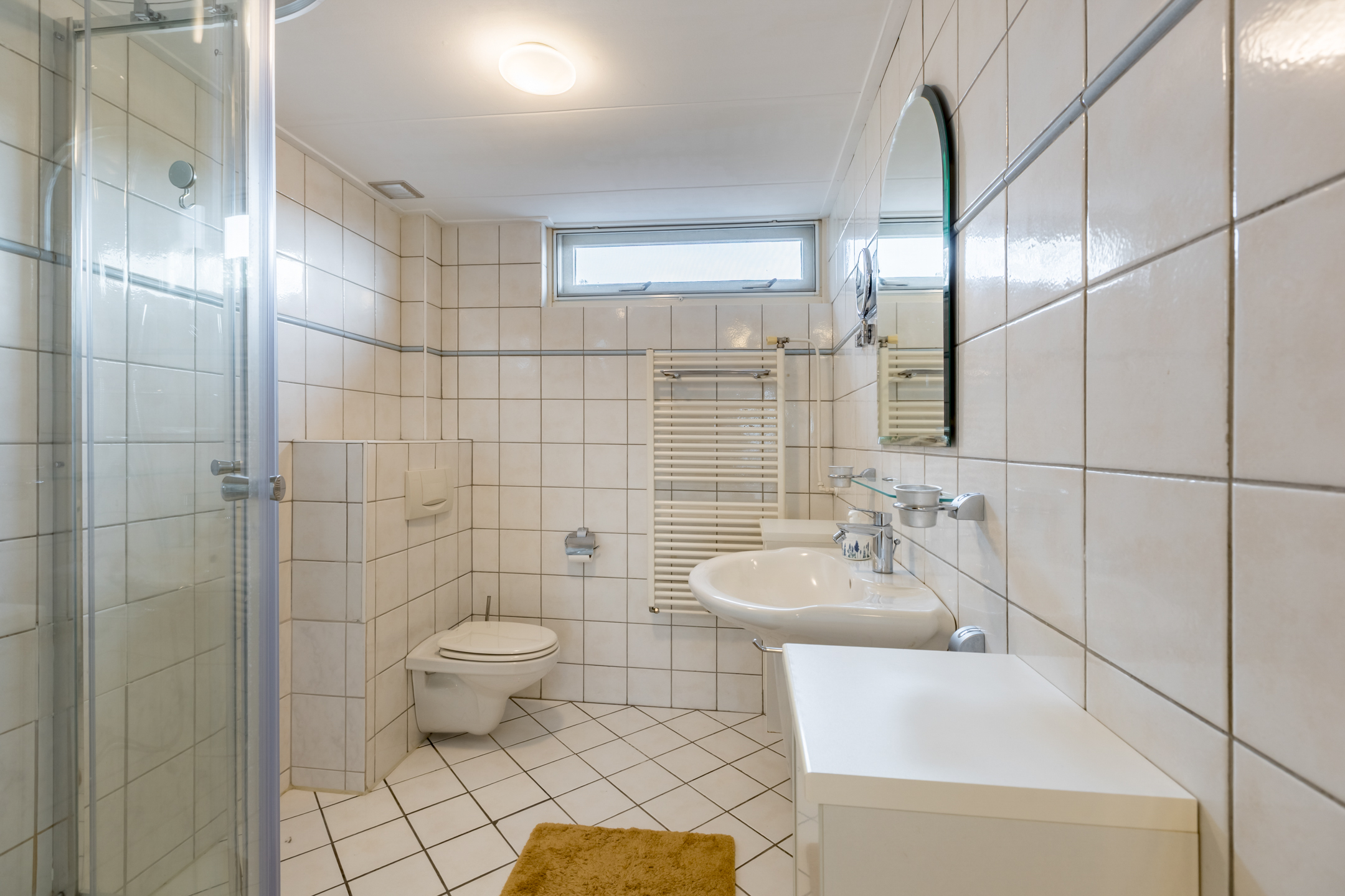 De badkamer is volledig betegeld en ingericht met een douchecabine met handdouche en regendouche, een wastafel, 2e toilet, een handdoekradiator en een raam.