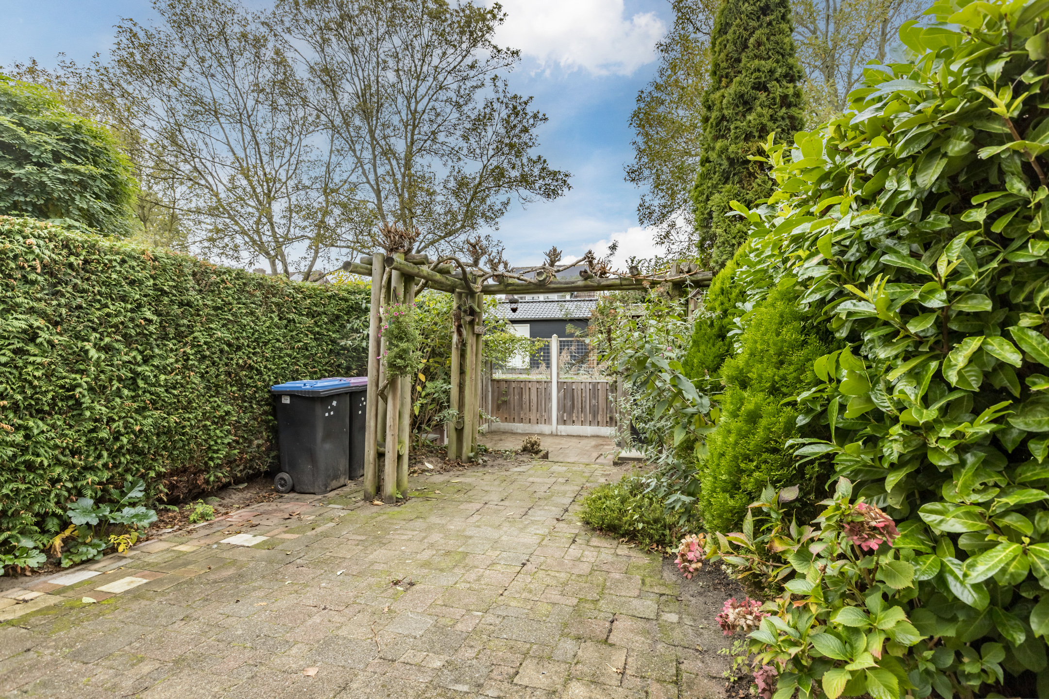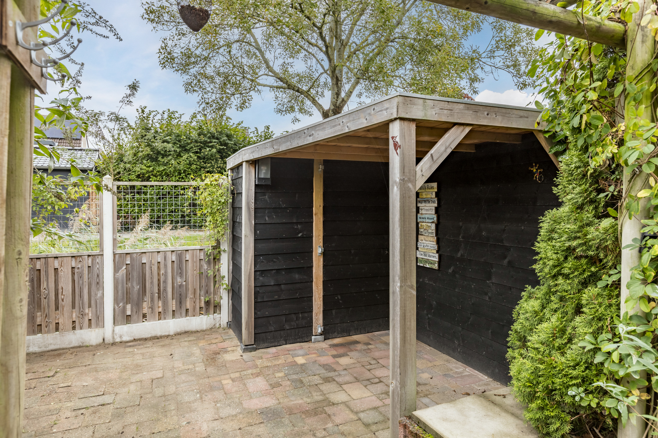 De sfeervolle achtertuin is netjes onderhouden en biedt voldoende privacy, waardoor het hier heerlijk vertoeven is. In 2021 is aan de achterzijde een nieuwe schutting geplaatst en een extra berging met overkapping gerealiseerd — een fijne plek om beschut buiten te zitten. Aan de achtergevel is ook een elektrisch bedienbaar zonnescherm.