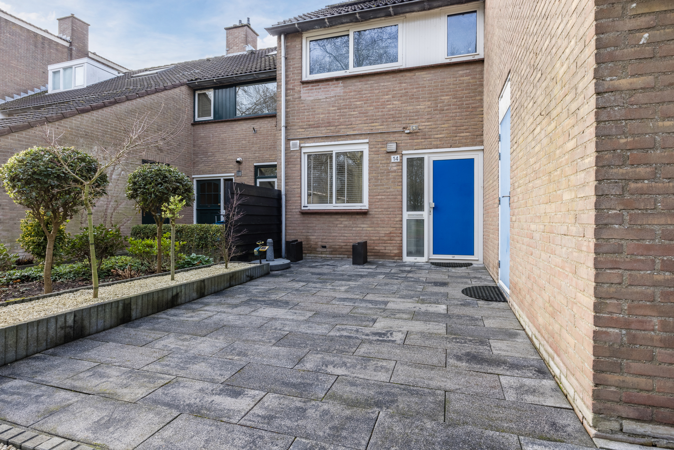 Ruime, volledig bestraatte voortuin met toegang tot de aangebouwde berging (circa 7 m2) met tegelvloer; ideaal voor de fietsen, kinderwagen of extra opslag.