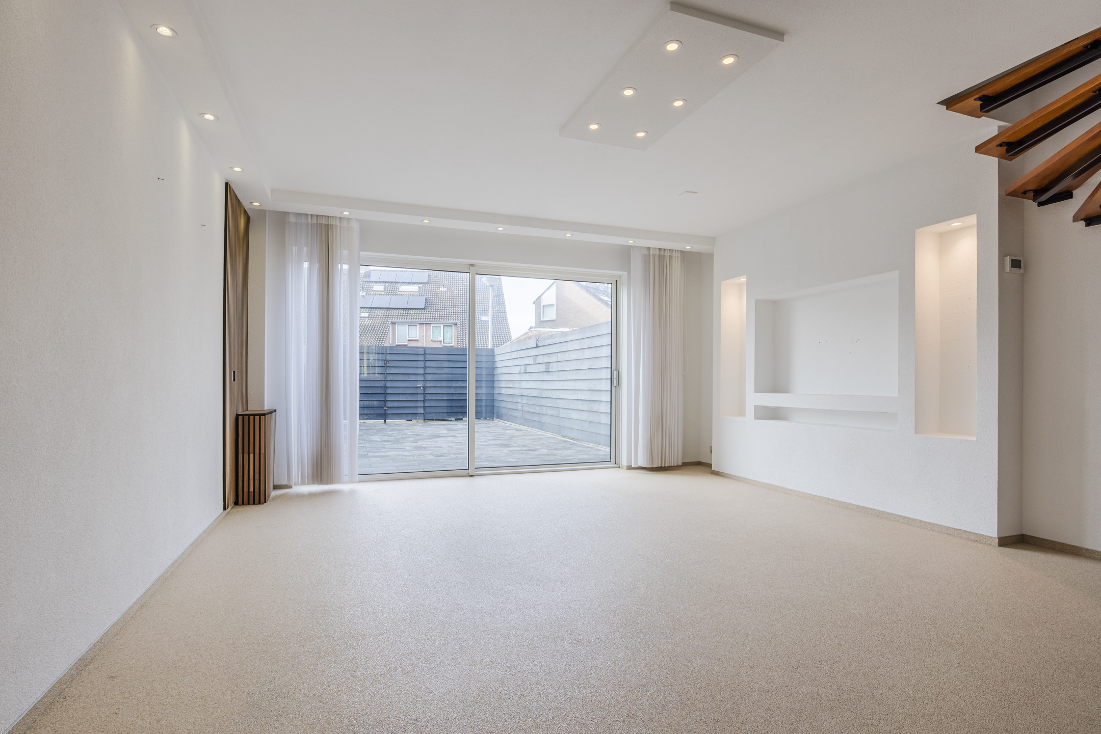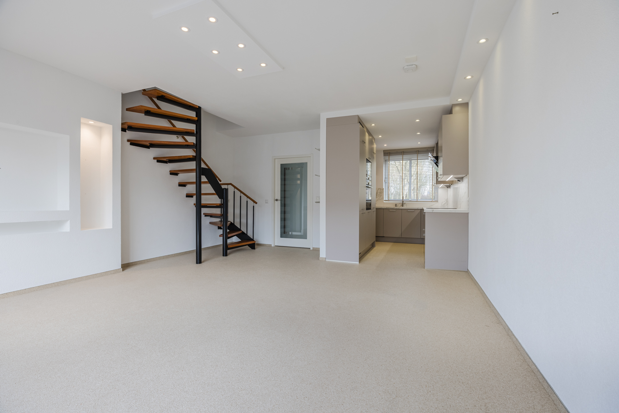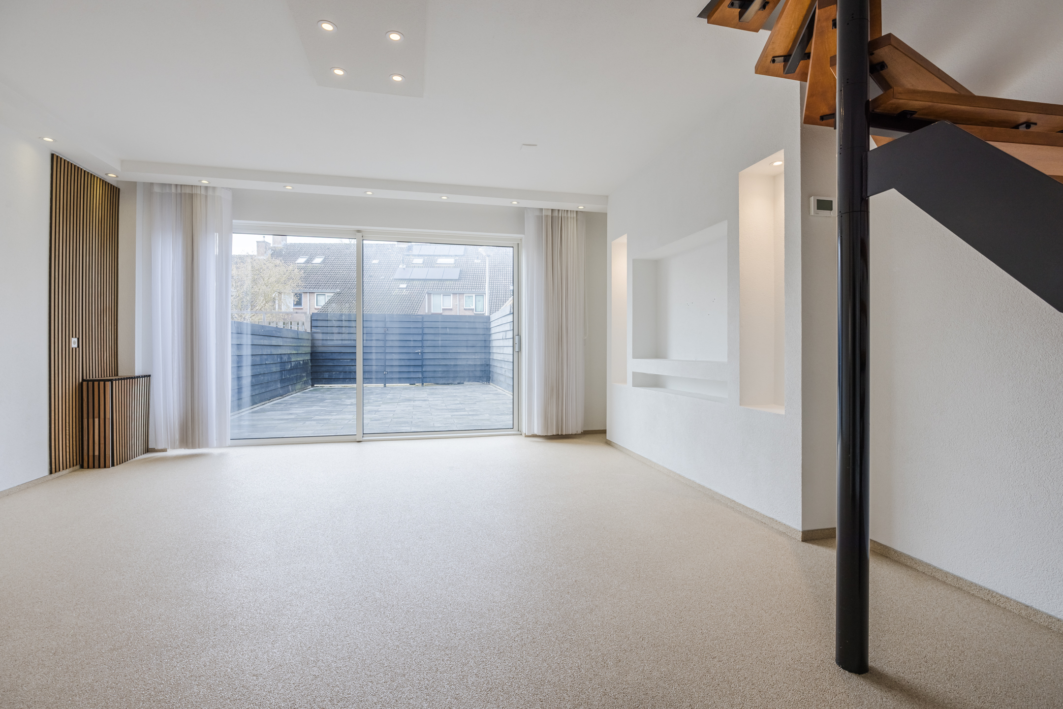 Aan de voorzijde ligt de moderne keuken, compleet uitgerust met een 5-pits inductiekookplaat, design afzuigkap, koelkast, Quooker, oven, magnetron en vaatwasser. De open spiltrap brengt je naar de verdieping.