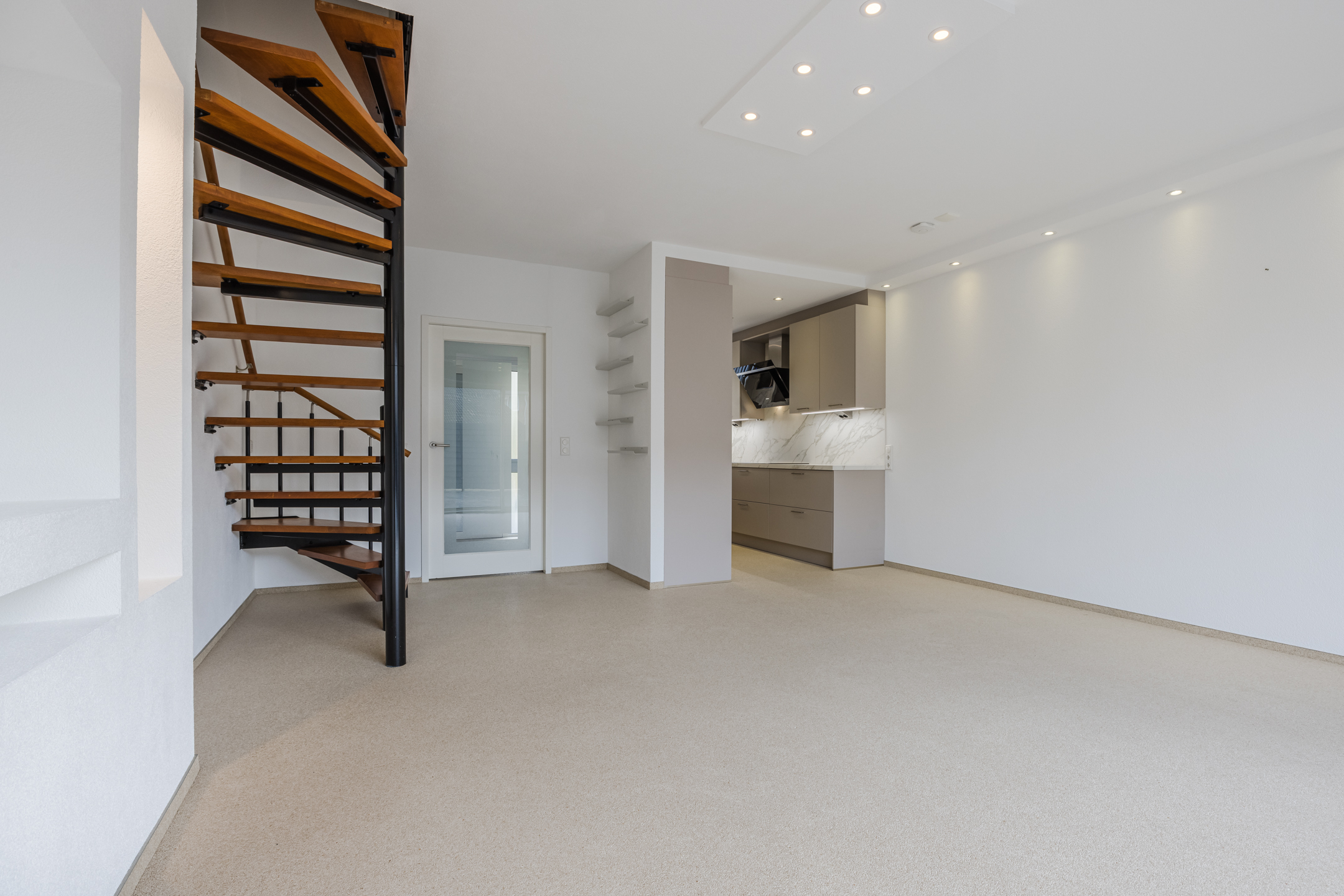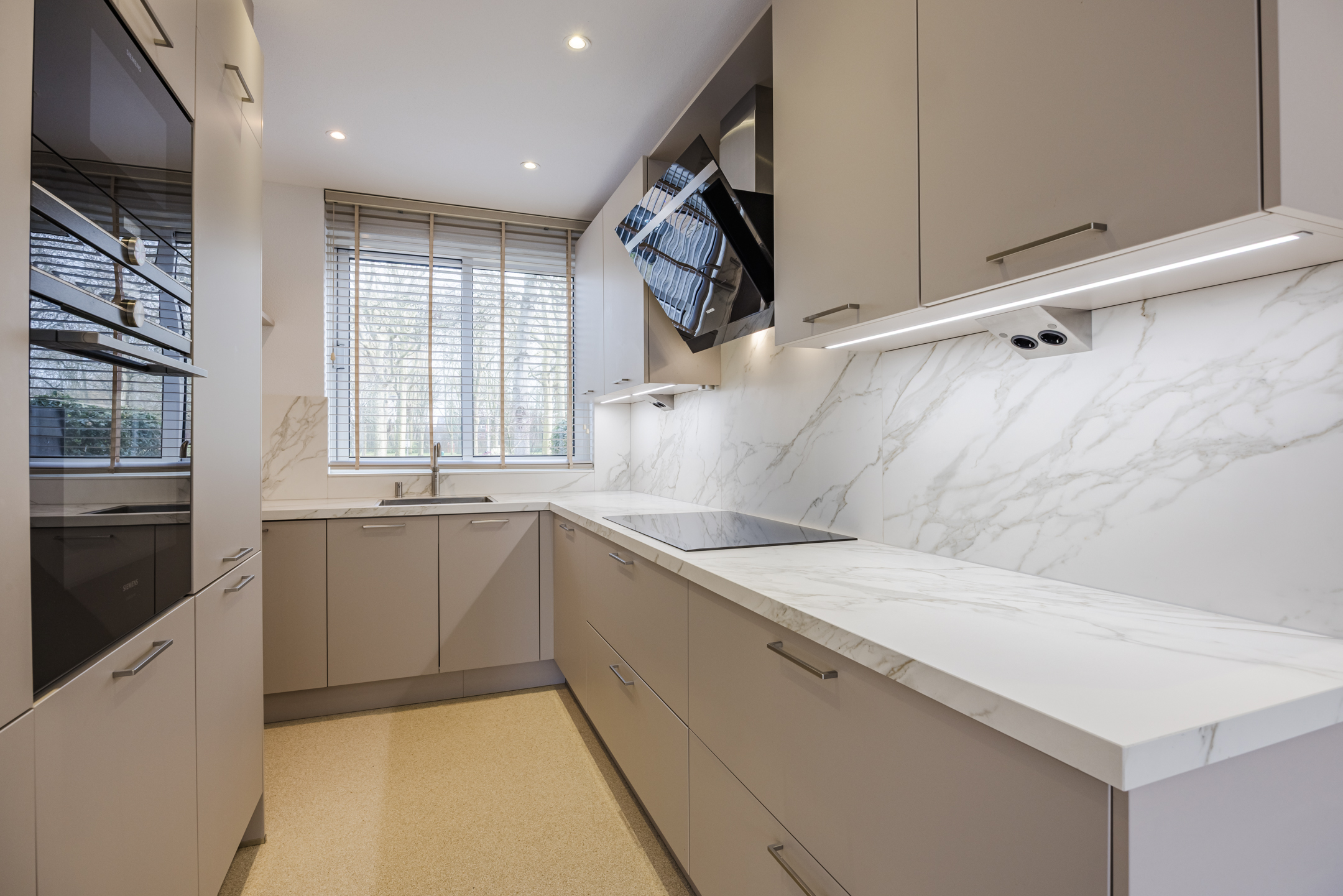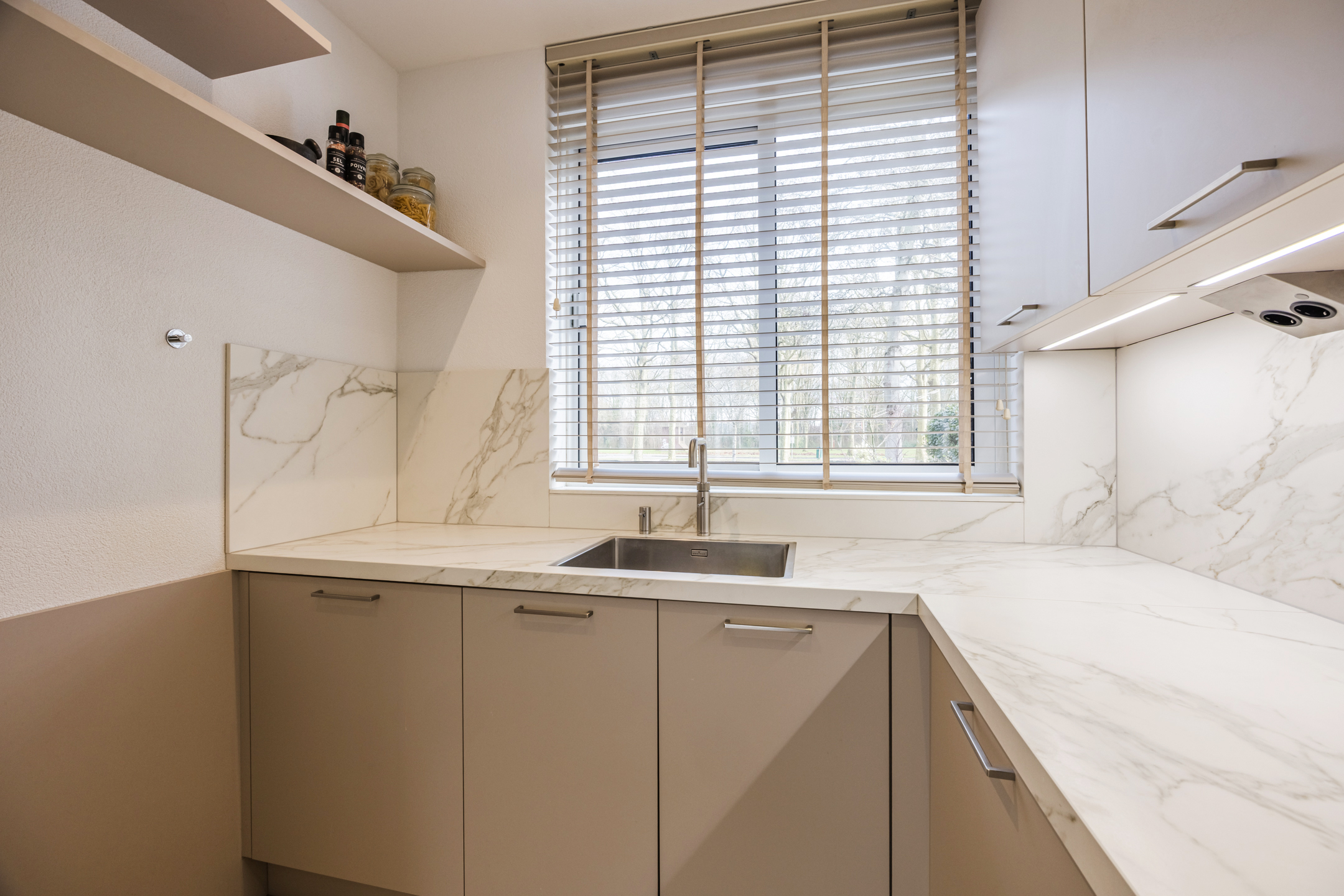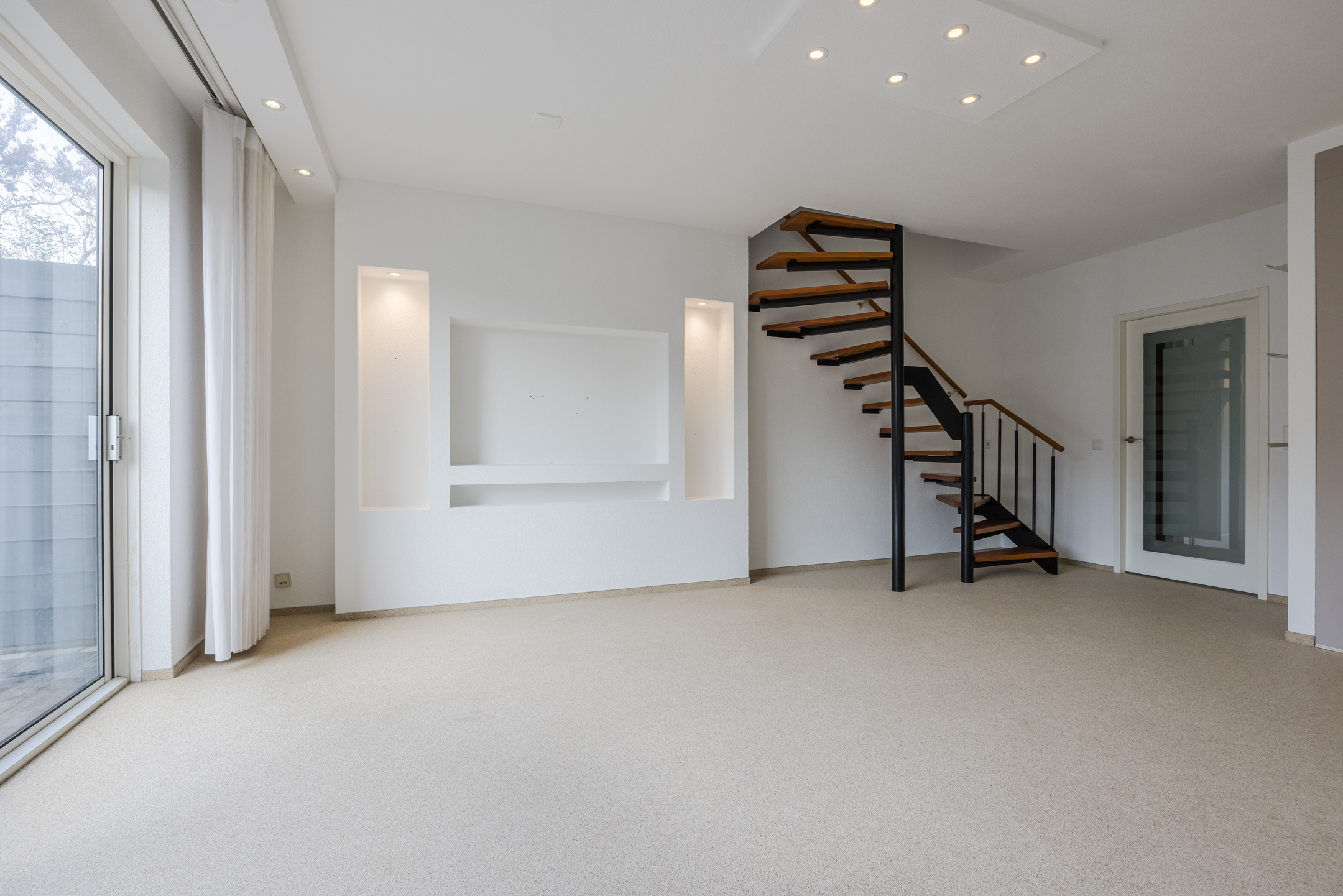 Aan de voorzijde ligt de moderne keuken, compleet uitgerust met een 5-pits inductiekookplaat, design afzuigkap, koelkast, Quooker, oven, magnetron en vaatwasser. De open spiltrap brengt je naar de verdieping.