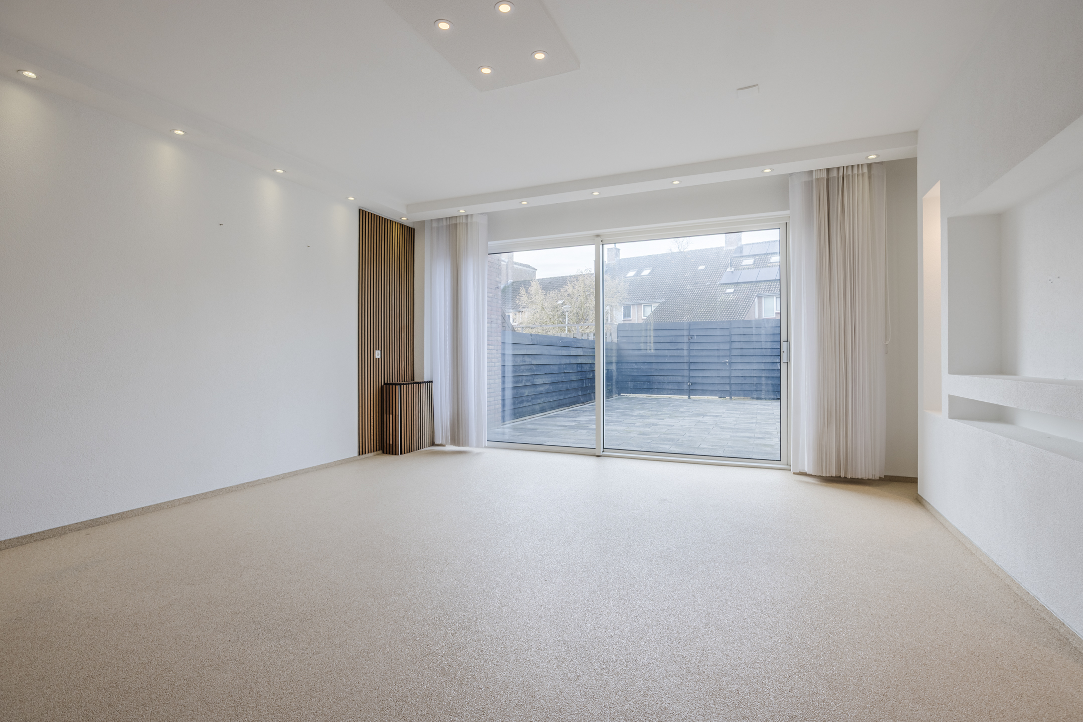 Entree/hal met meterkast en een moderne, geheel betegelde toiletruimte met inbouwtoilet en handwasbakje. De tuingerichte woonkamer is heerlijk licht dankzij de brede schuifpui. De gesealde siergrind vloer met vloerverwarming en de inbouwverlichting zorgen voor een strakke, moderne uitstraling.