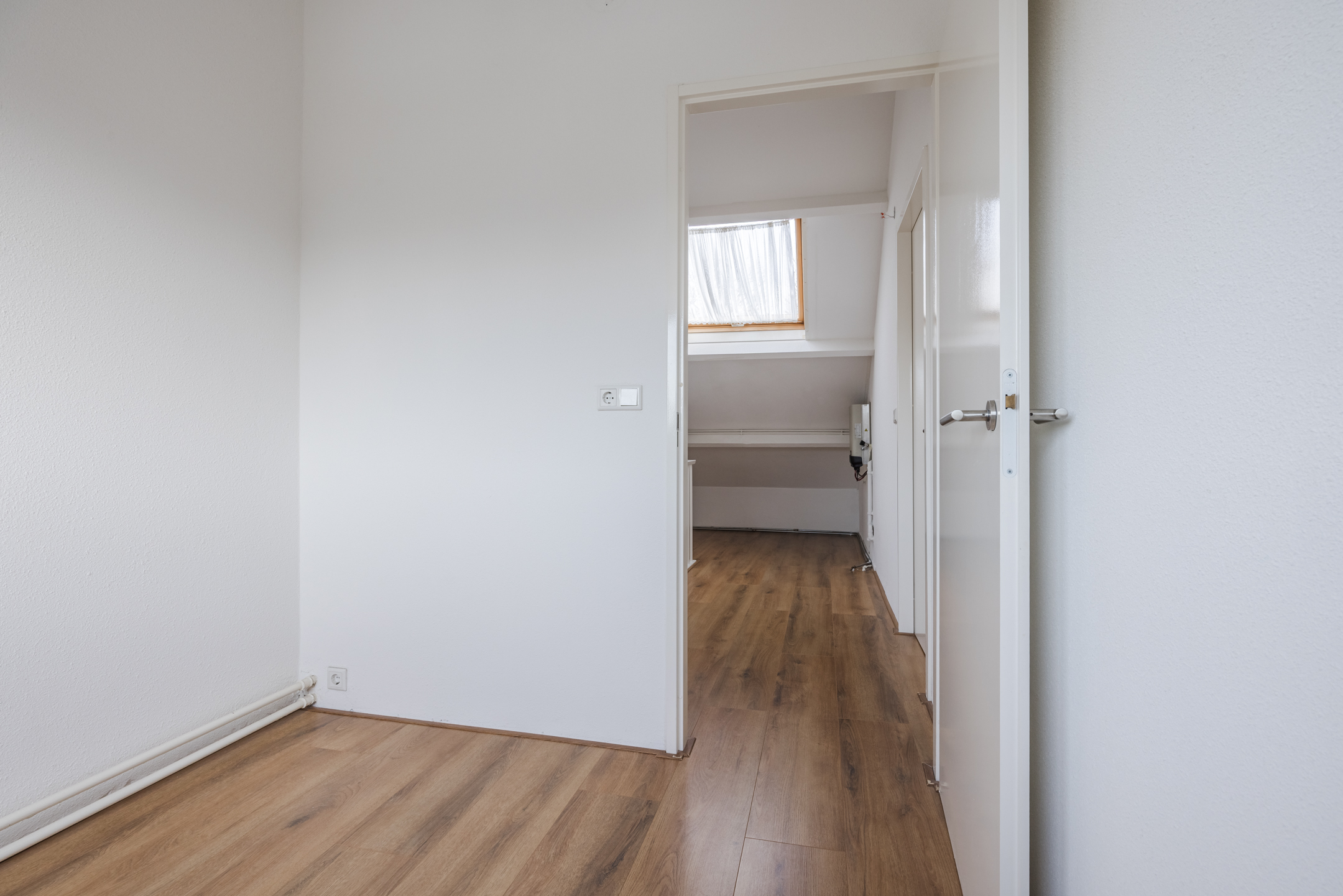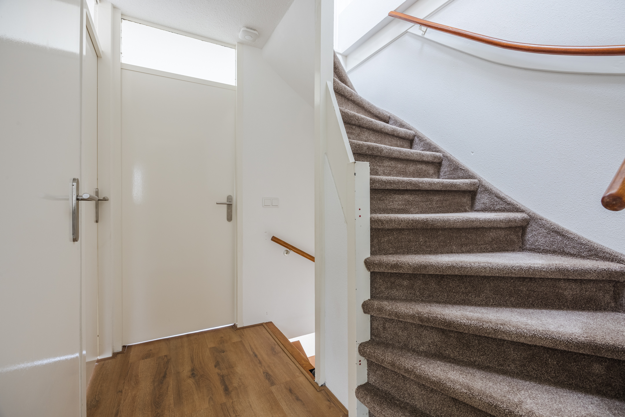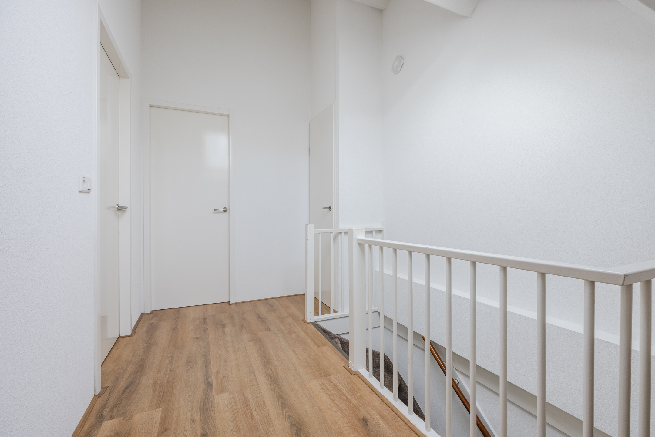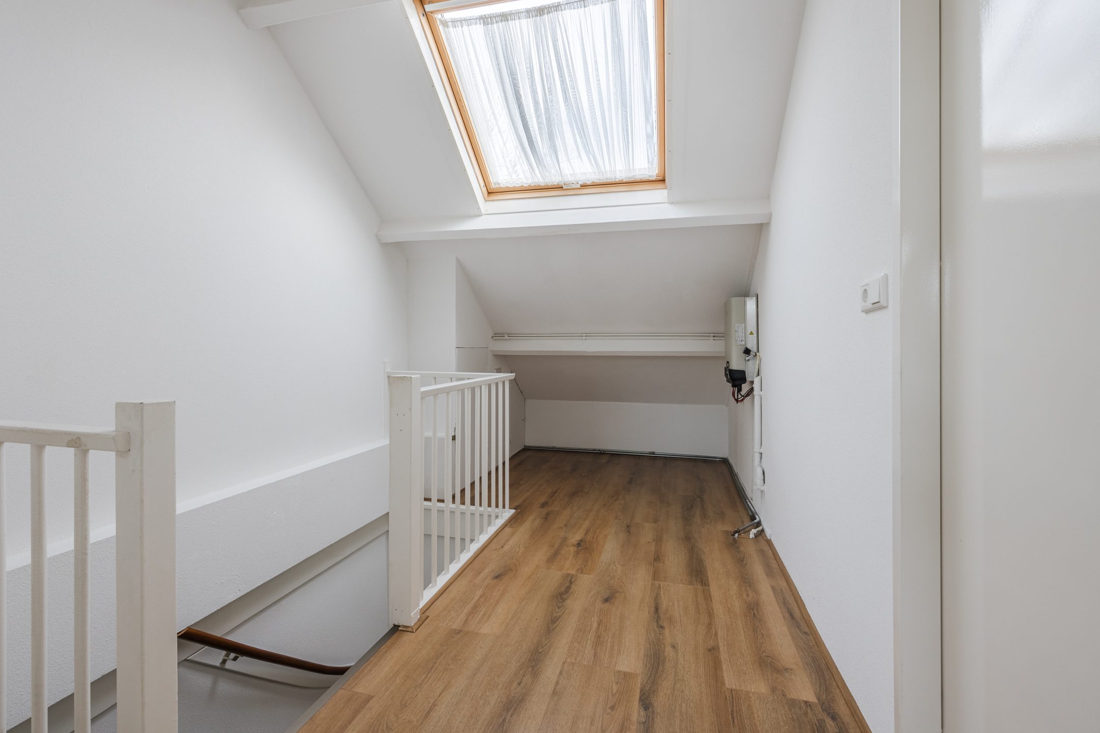 Via de vaste trap bereik je de voorzolder met de witgoedaansluitingen, de omvormer van de zonnepanelen, Velux dakraam en de cv-combiketel is netjes weggewerkt in een kast. Daarnaast is hier voldoende bergruimte.