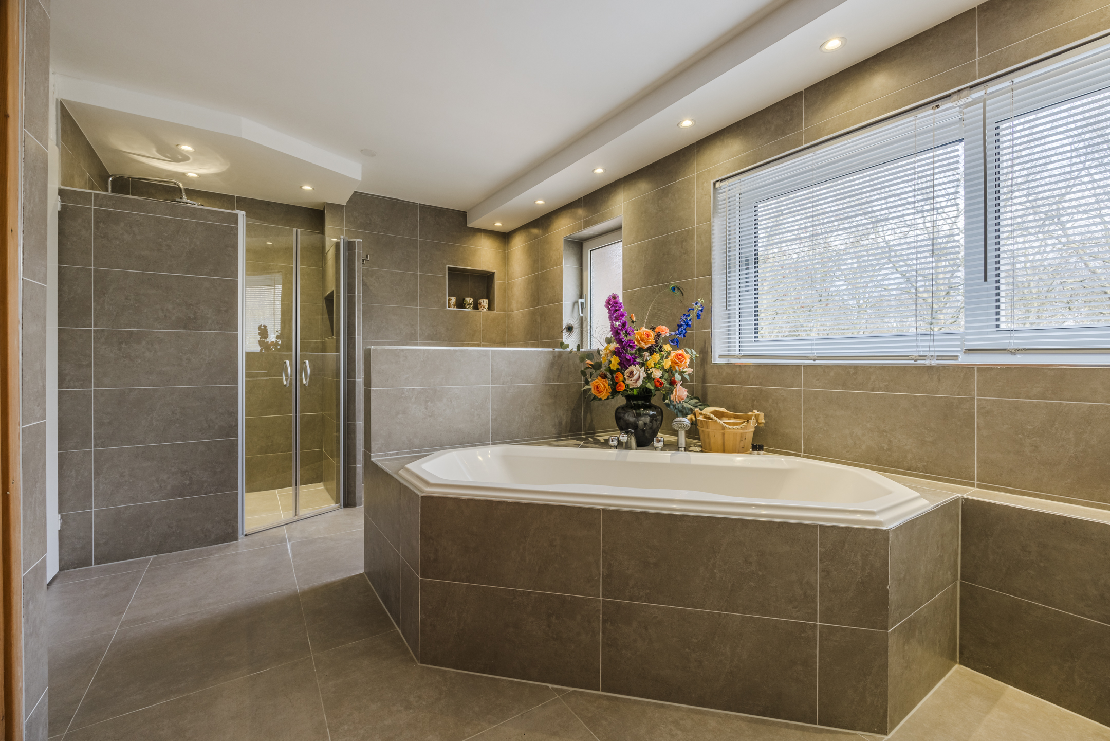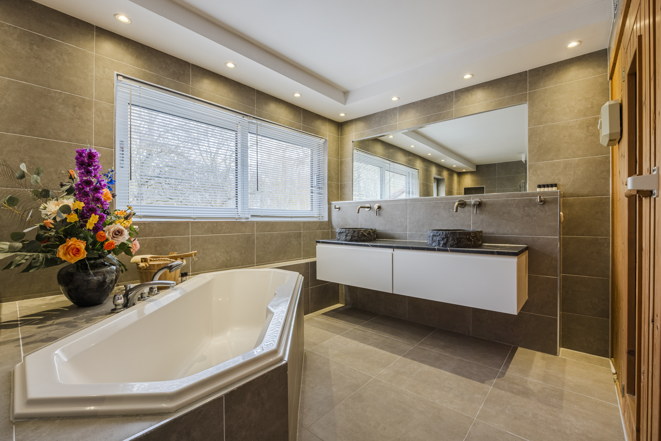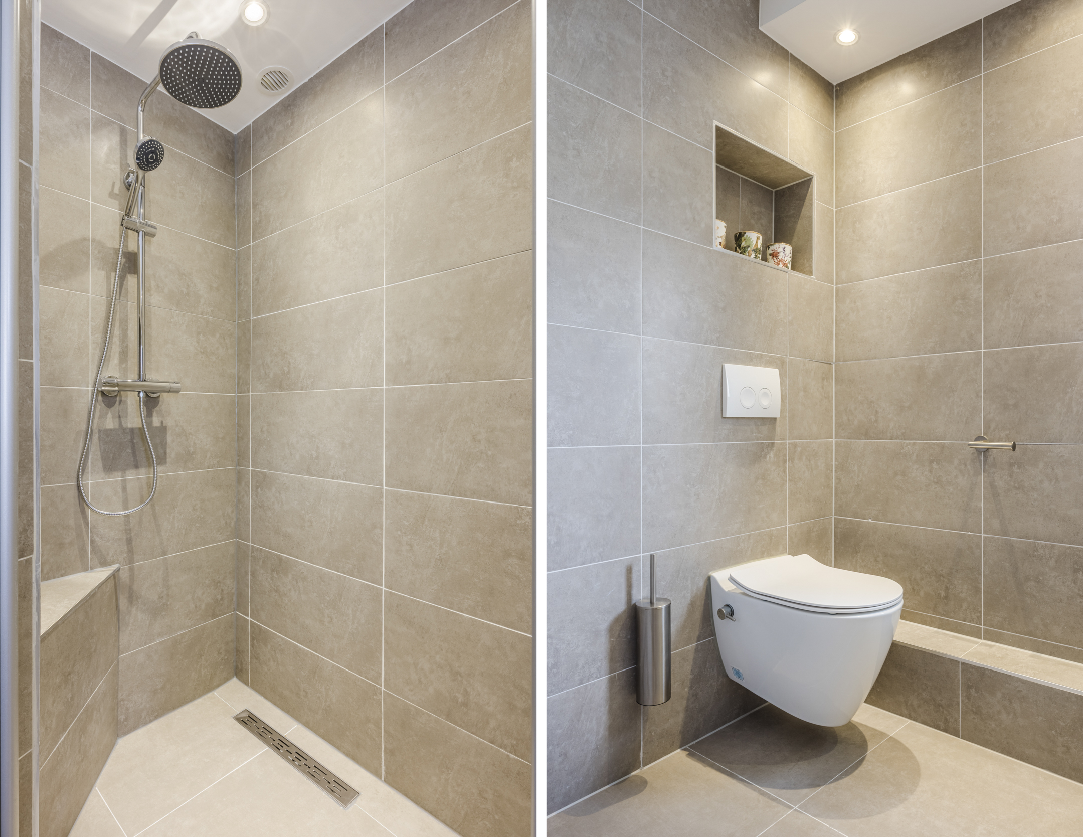 Overloop met toegang tot 2 ruime slaapkamers en de badkamer. Op de overloop en in de slaapkamers is de laminaatvloer doorgelegd. De badkamer is een echte eyecatcher: ruim, luxe en volledig betegeld, ingericht met een ligbad, douchecabine met regendouche en handdouche, meubel met dubbele waskom en inbouwkranen, 2e inbouwtoilet, vloerverwarming en zelfs een sauna.