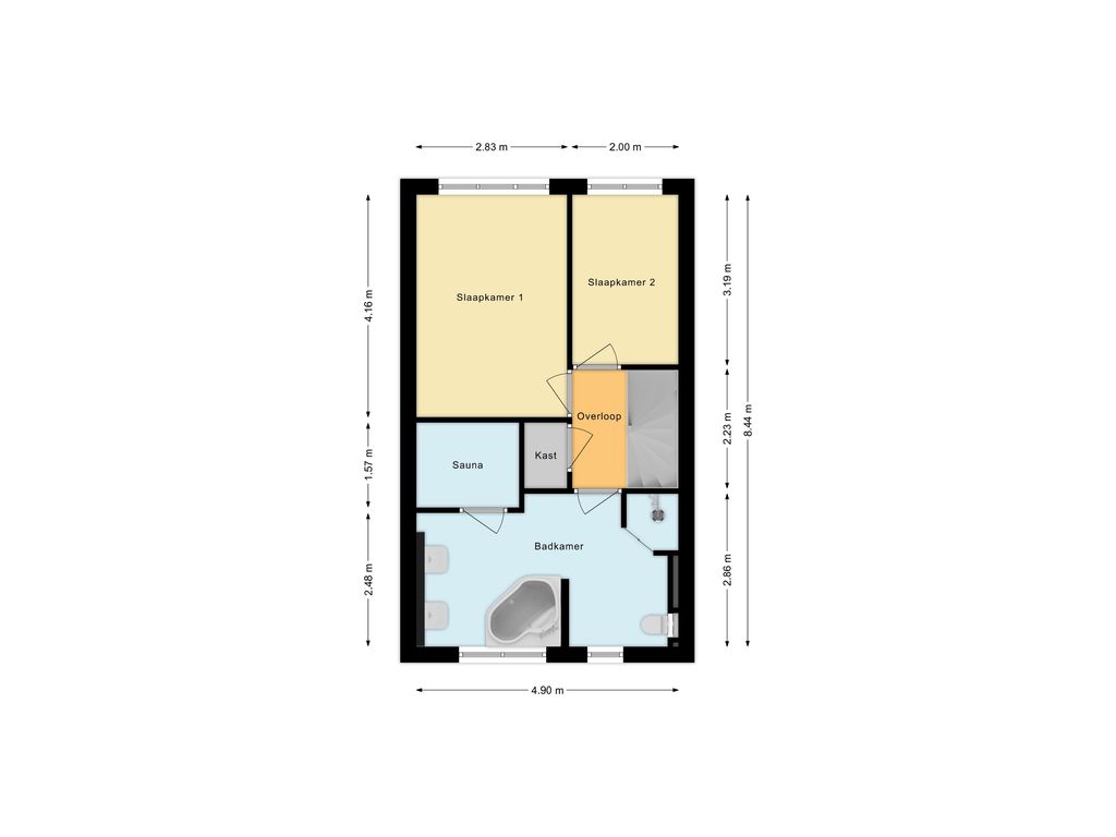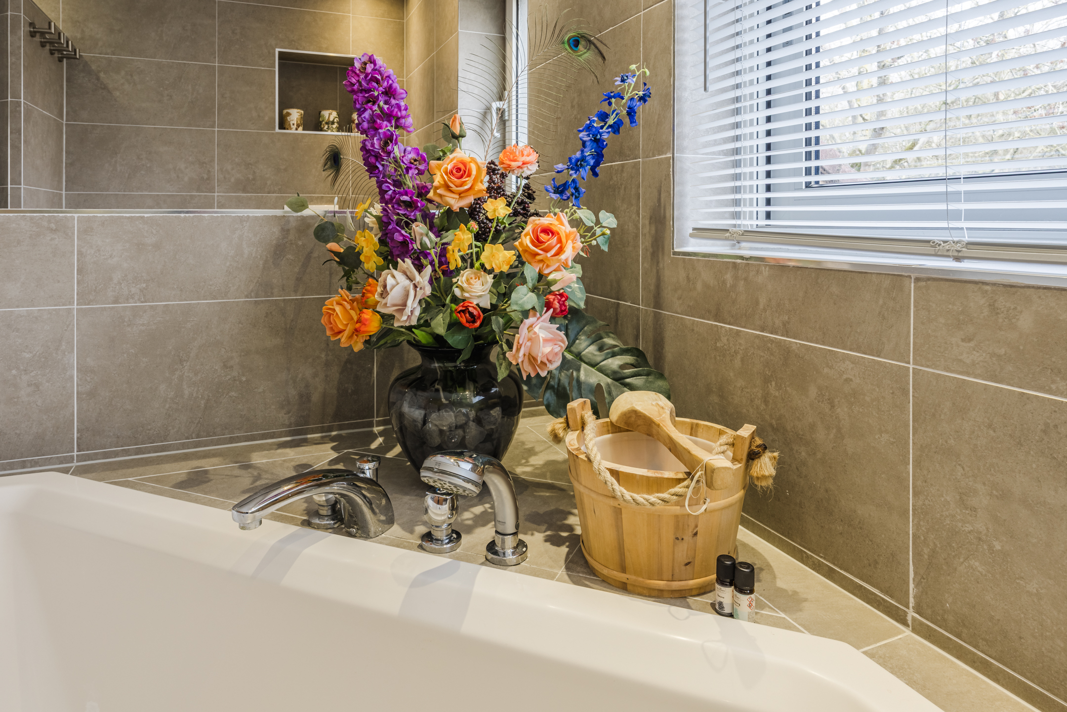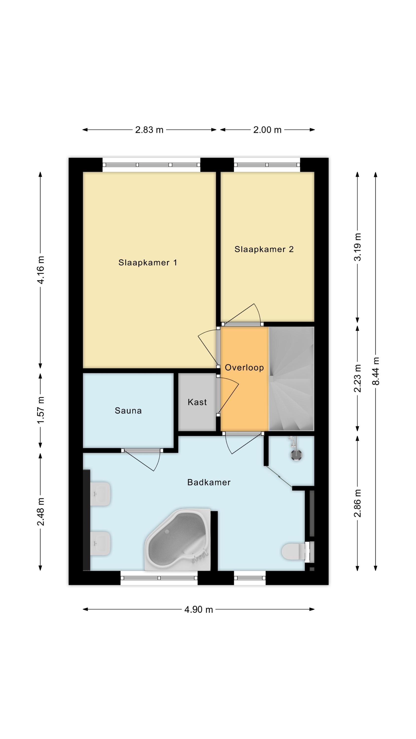 Overloop met toegang tot 2 ruime slaapkamers en de badkamer. Op de overloop en in de slaapkamers is de laminaatvloer doorgelegd. De badkamer is een echte eyecatcher: ruim, luxe en volledig betegeld, ingericht met een ligbad, douchecabine met regendouche en handdouche, meubel met dubbele waskom en inbouwkranen, 2e inbouwtoilet, vloerverwarming en zelfs een sauna.