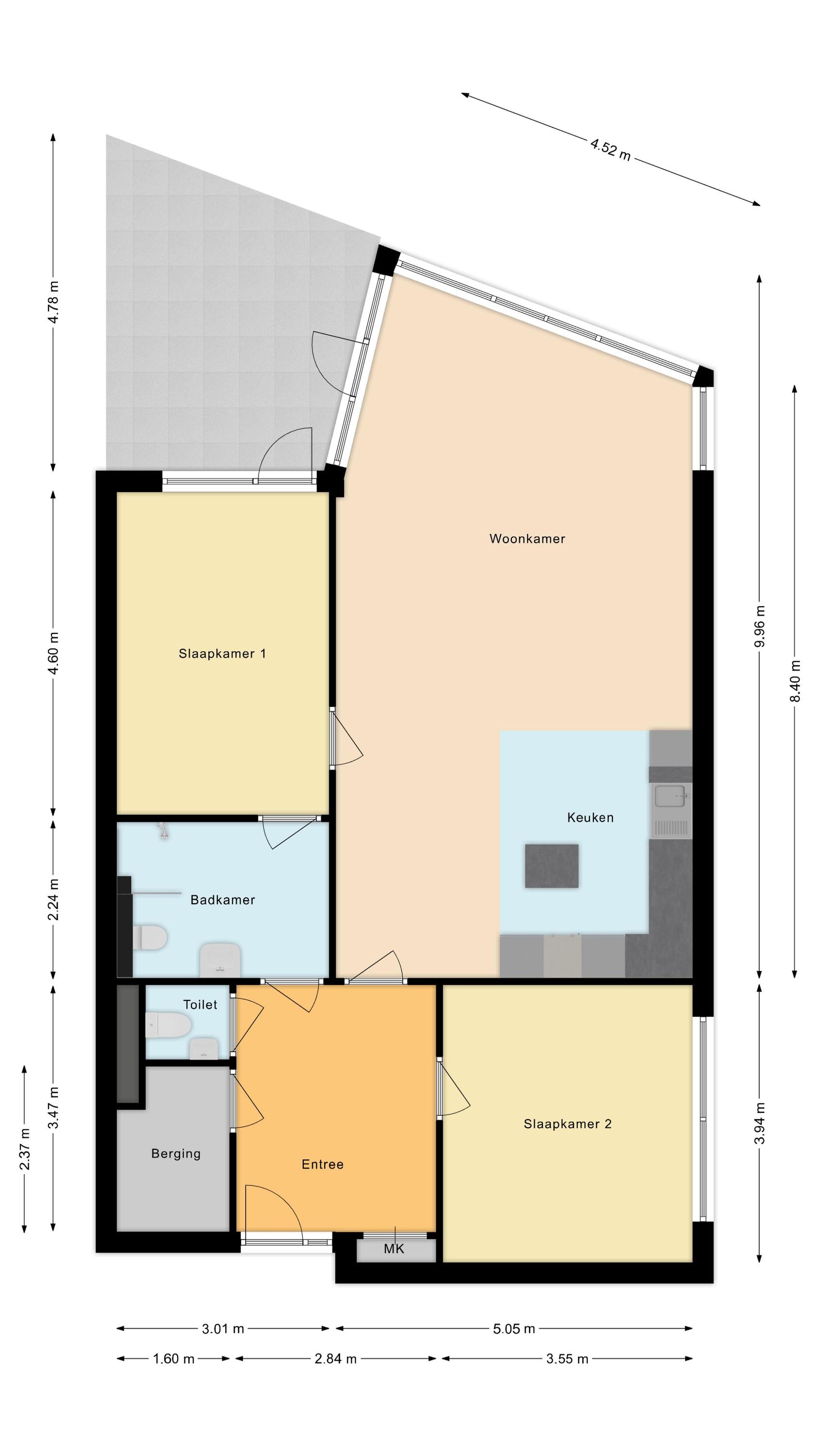 - Woonkamer incl keuken: 5.05 x 8.40 / 9.96