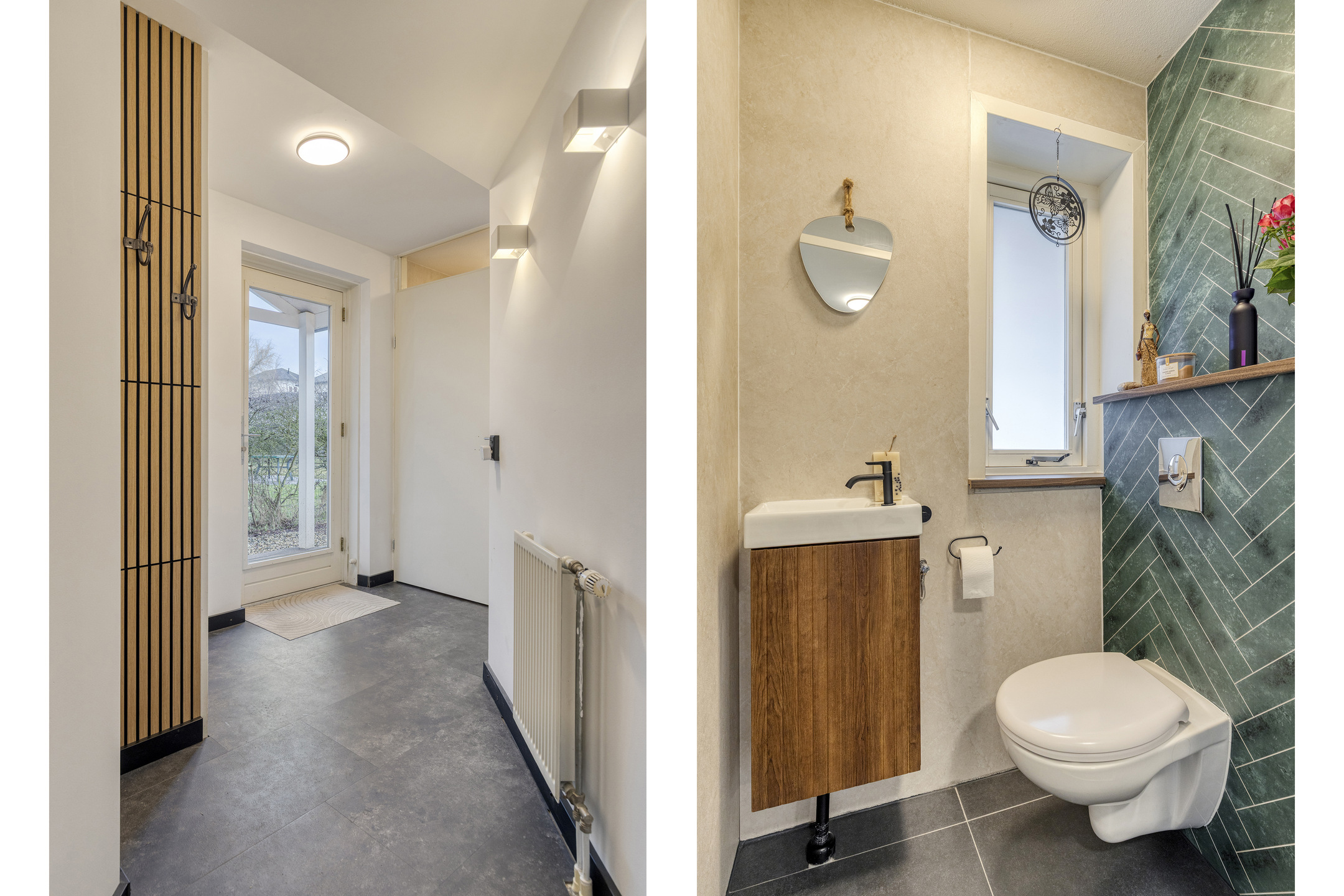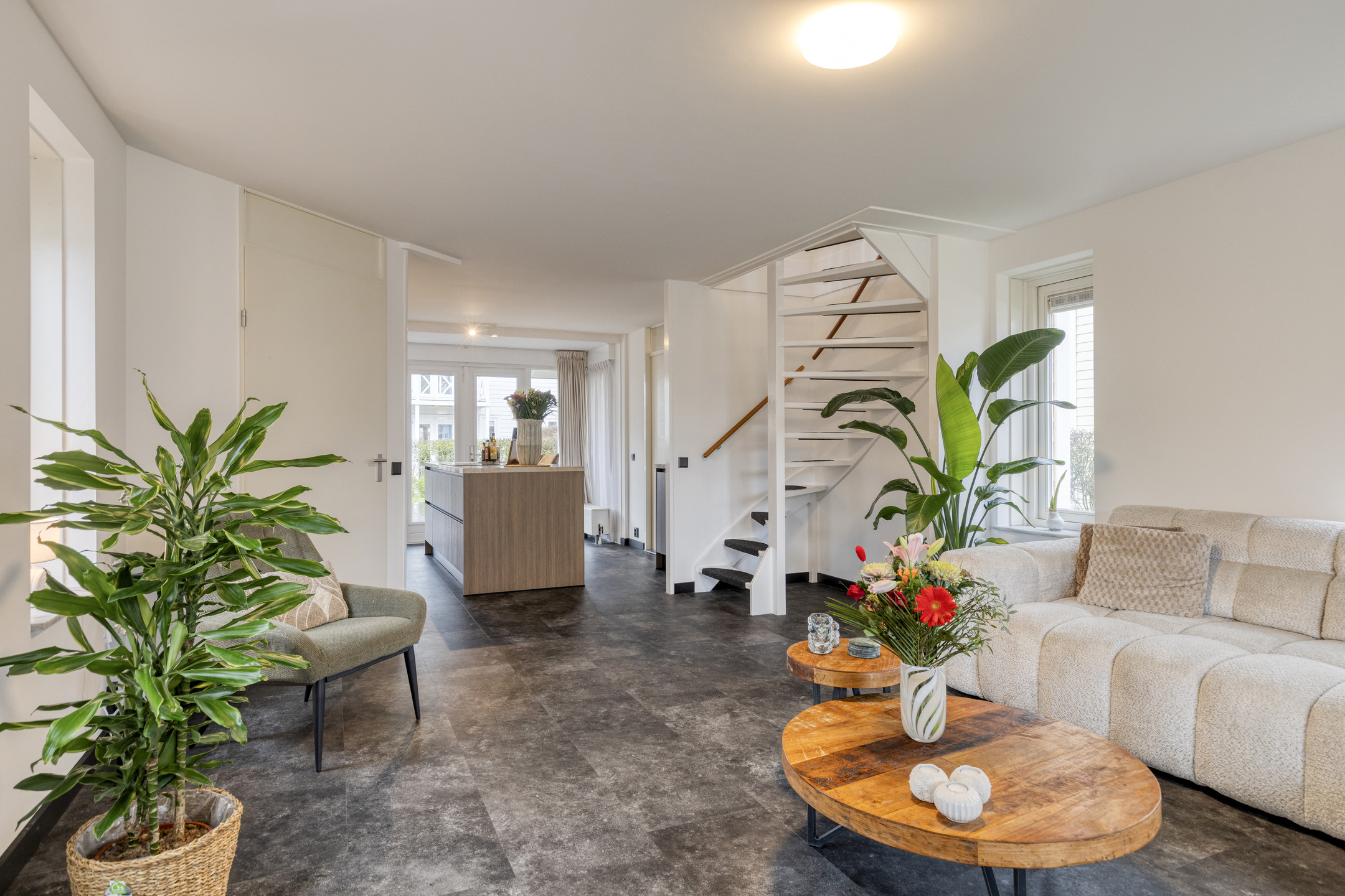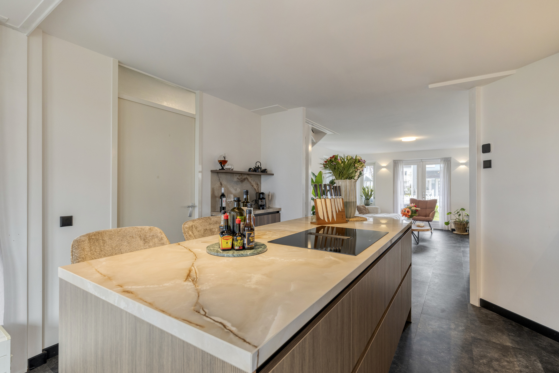 Hal/entree met de moderne toiletruimte met inbouwcloset en handwasbakje met kastje. De woonkamer met vloerverwarming heeft openslaande deuren naar de veranda’s aan de voor- en achterzijde en de ramen rondom zorgen voor veel lichtinval. De moderne keuken is in 2025 geplaatst, heeft veel opbergruimte in de kastjes en lades, en is compleet met inbouwapparatuur als: een inductiekookplaat met afzuiging, een combioven, vaatwasser en een kokend waterkraan. De keuken heeft een deur naar de praktische bijkeuken met hier een Amerikaanse koel-/vriescombinatie. De bijkeuken is zowel vanaf binnen als vanaf buiten bereikbaar, hier zijn ook de witgoedaansluitingen en de opstelplaats van de cv-combiketel (Intergas, 2024).
