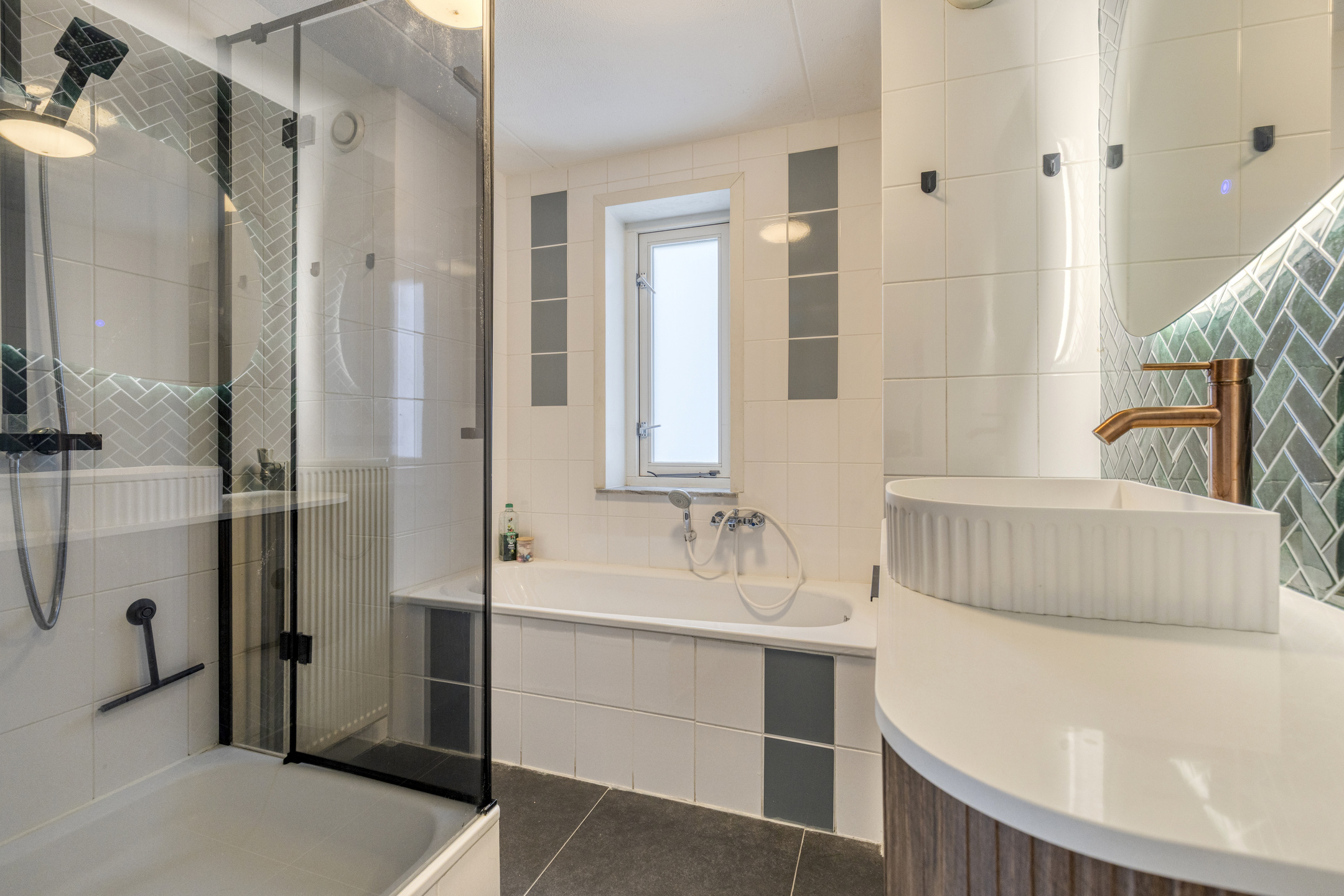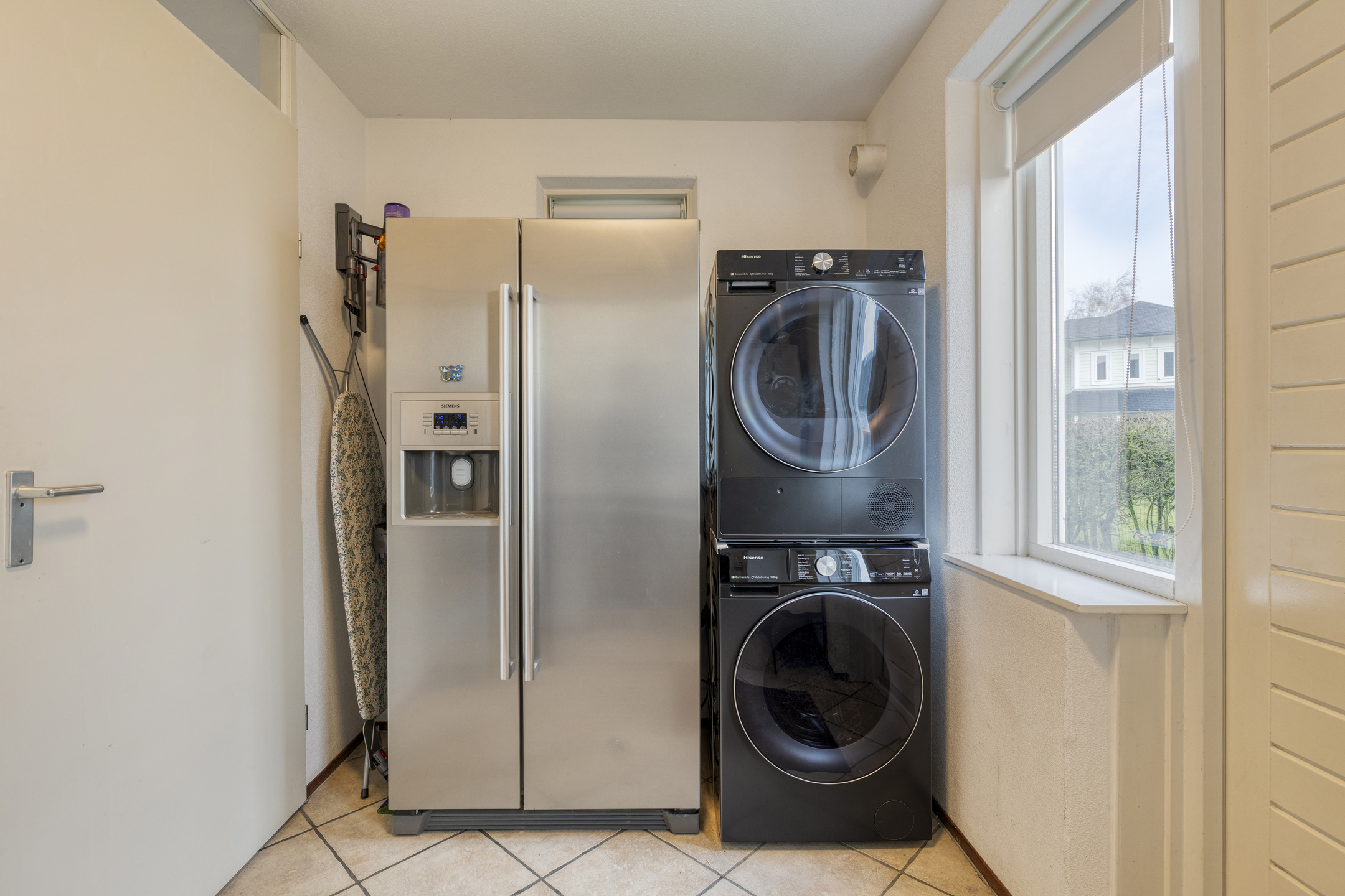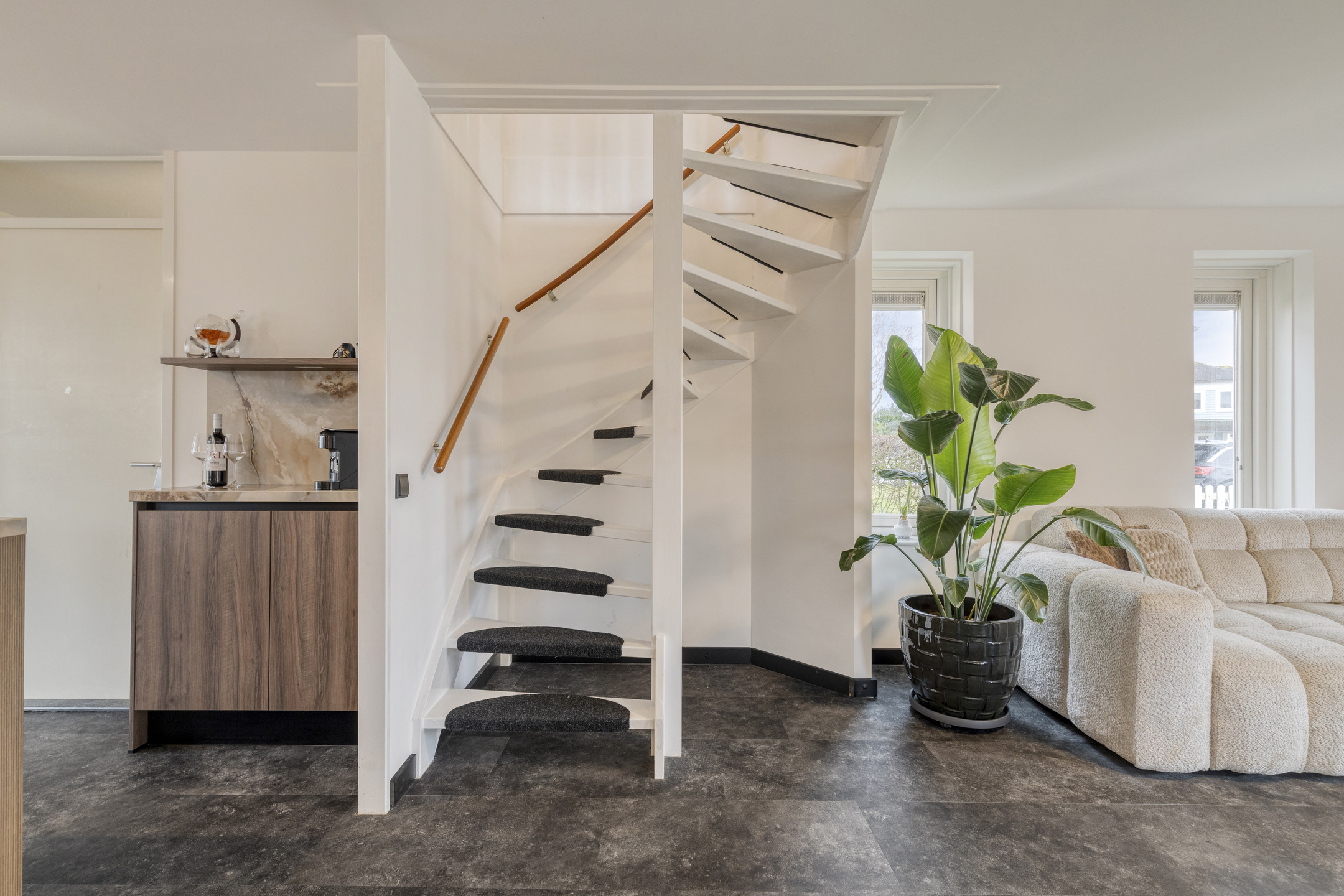 Hal/entree met de moderne toiletruimte met inbouwcloset en handwasbakje met kastje. De woonkamer met vloerverwarming heeft openslaande deuren naar de veranda’s aan de voor- en achterzijde en de ramen rondom zorgen voor veel lichtinval. De moderne keuken is in 2025 geplaatst, heeft veel opbergruimte in de kastjes en lades, en is compleet met inbouwapparatuur als: een inductiekookplaat met afzuiging, een combioven, vaatwasser en een kokend waterkraan. De keuken heeft een deur naar de praktische bijkeuken met hier een Amerikaanse koel-/vriescombinatie. De bijkeuken is zowel vanaf binnen als vanaf buiten bereikbaar, hier zijn ook de witgoedaansluitingen en de opstelplaats van de cv-combiketel (Intergas, 2024).