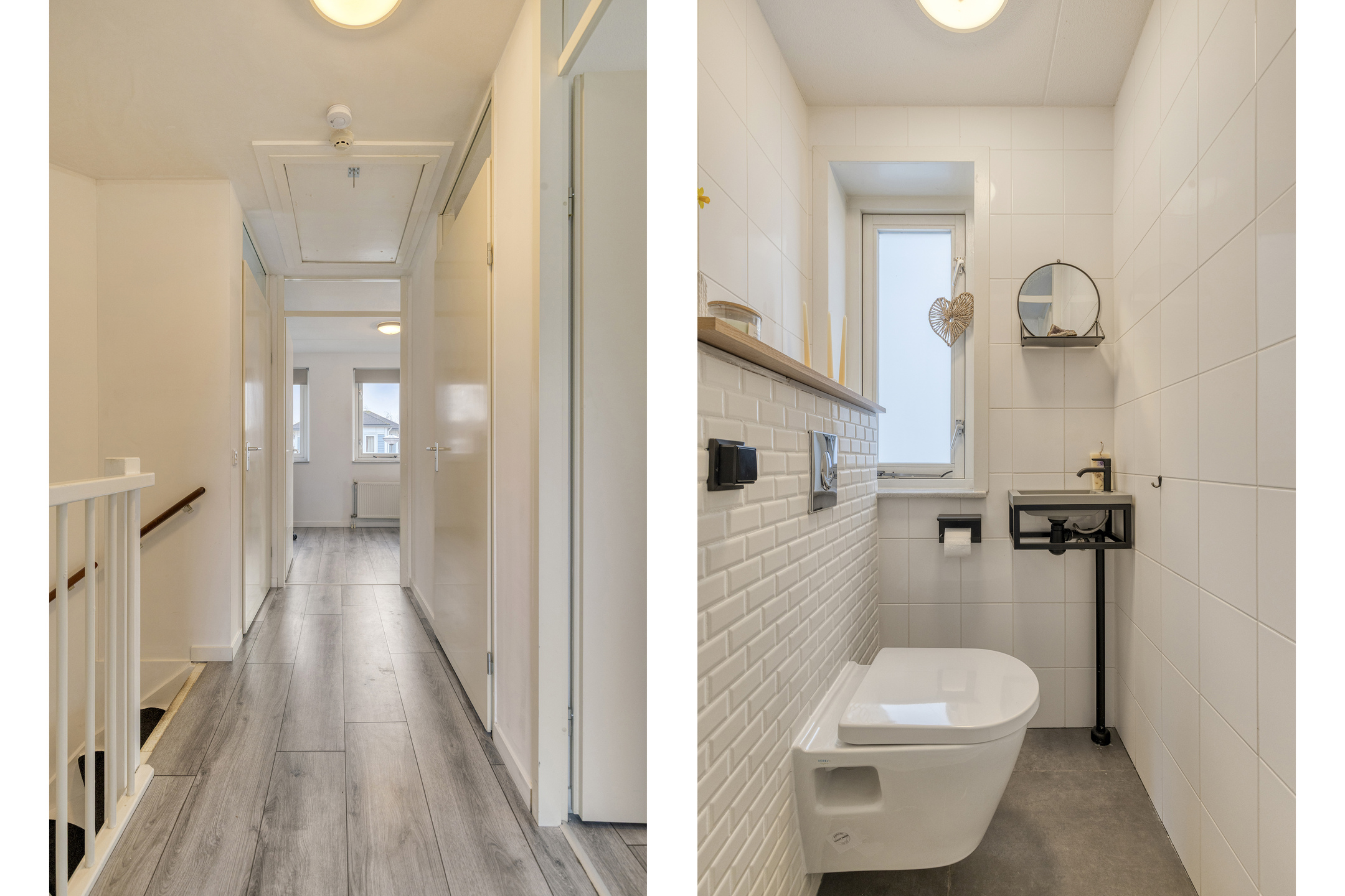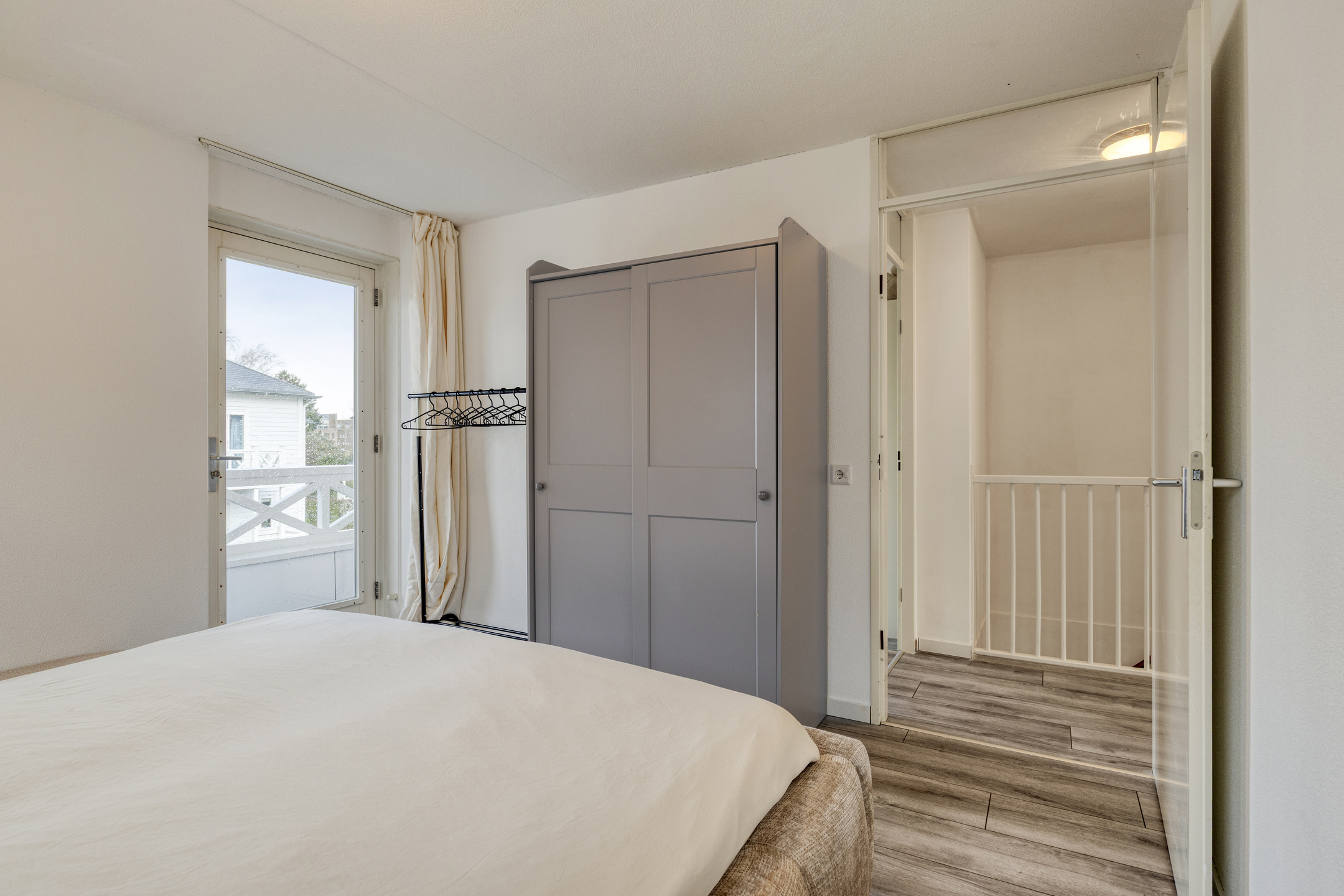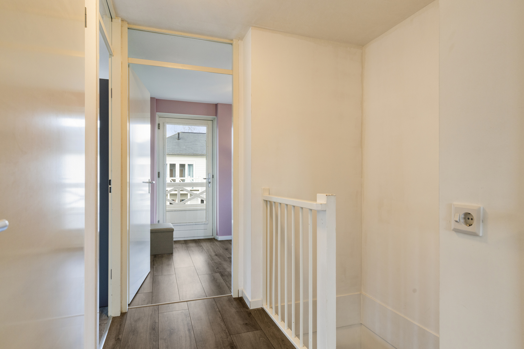 Overloop met toegang tot de 3 ruime slaapkamers, een badkamer, separate geheel betegelde toiletruimte met handwasbakje en vlizotrap naar de bergzolder. De 2 slaapkamers aan de achterzijde hebben beide toegang tot het balkon. Alle slaapkamers en de overloop zijn voorzien van een laminaatvloer. De moderne badkamer is geheel betegeld en heeft een douchecabine met hand- en regendouche, ligbad, radiator en een wastafelmeubel met voldoende opbergruimte.