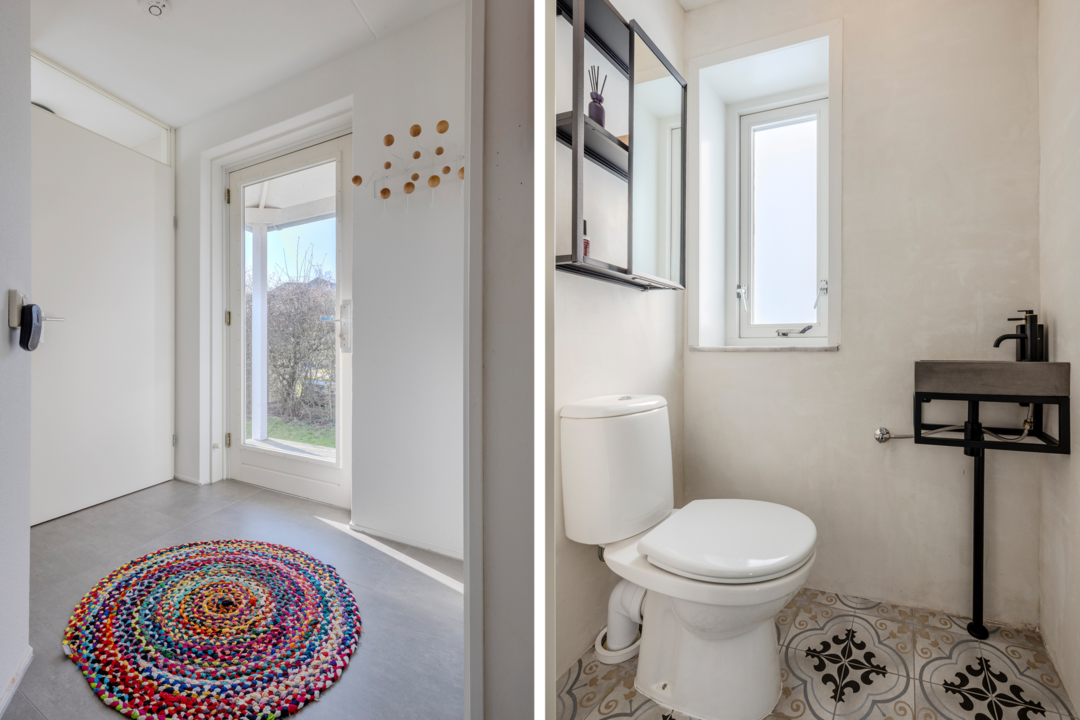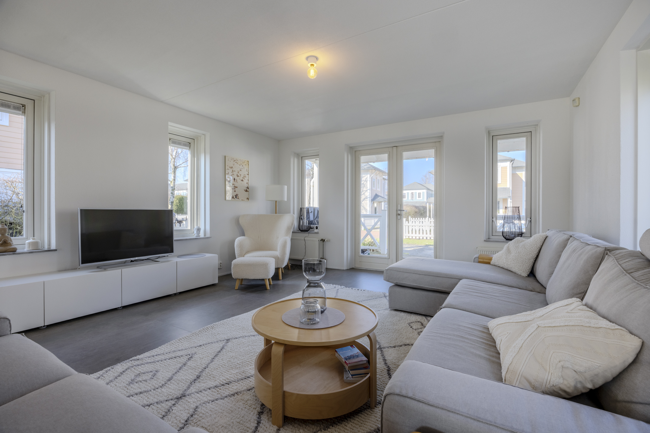 Hal/entree met de meterkast en de toiletruimte met staand toilet, een handwasbakje en een raam. De woonkamer heeft openslaande deuren naar de veranda’s aan de voor- en achterzijde. De keuken is in 2021/2022 geplaatst en is compleet met inbouwapparatuur als: een elektrische kookplaat, afzuigkap, vaatwasser, oven en een losse koel-vriescombinatie. De bijkeuken is zowel vanaf binnen als vanaf buiten bereikbaar, en hier is een 2e badkamer gerealiseerd. Ideaal als de kinderen vanaf het strand thuiskomen! Deze is ingericht met een wastafelmeubel met spiegel en een douchecabine. Ook is hier de opstelplaats van de cv-combiketel (Intergas, 2022) en de witgoedaansluitingen.