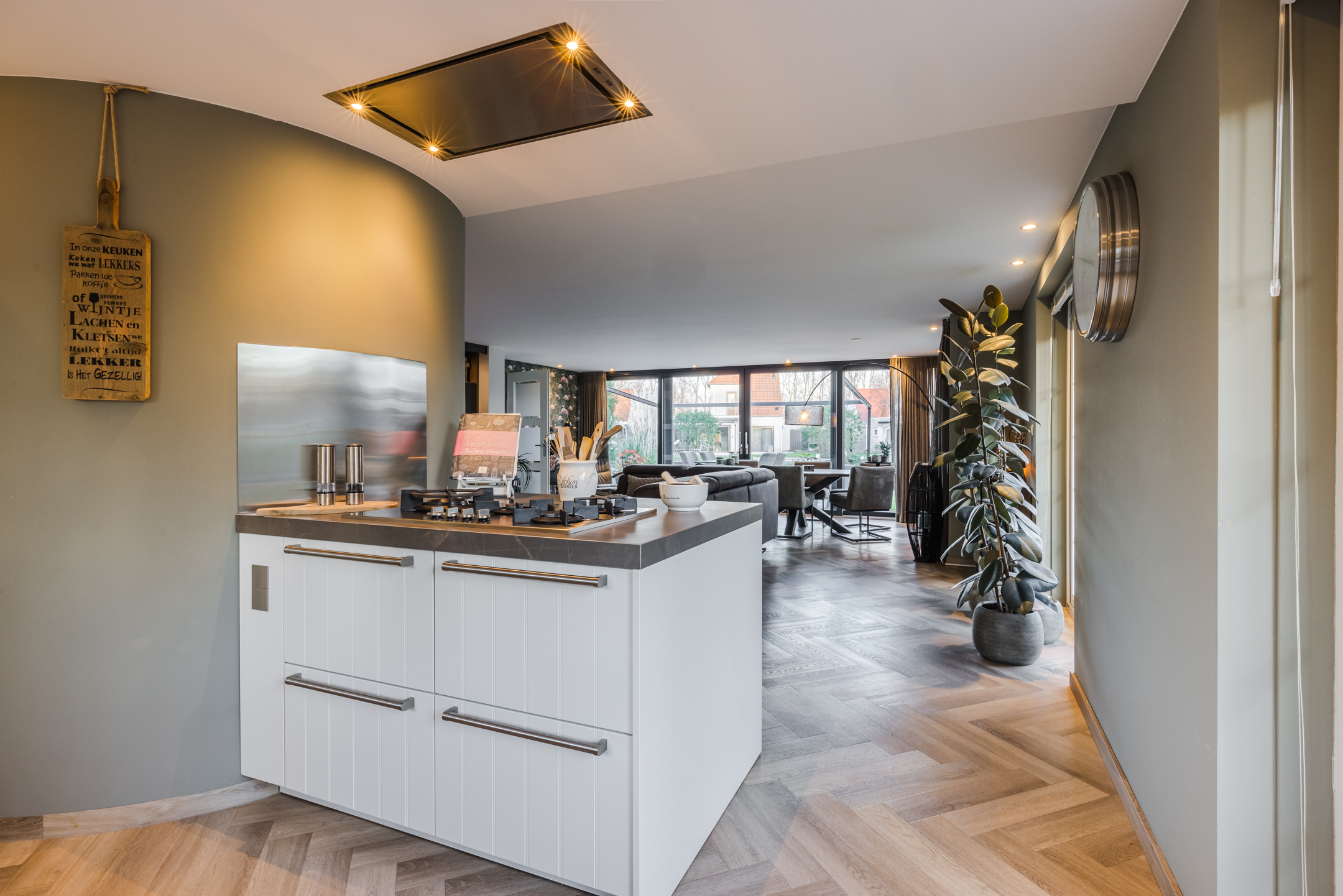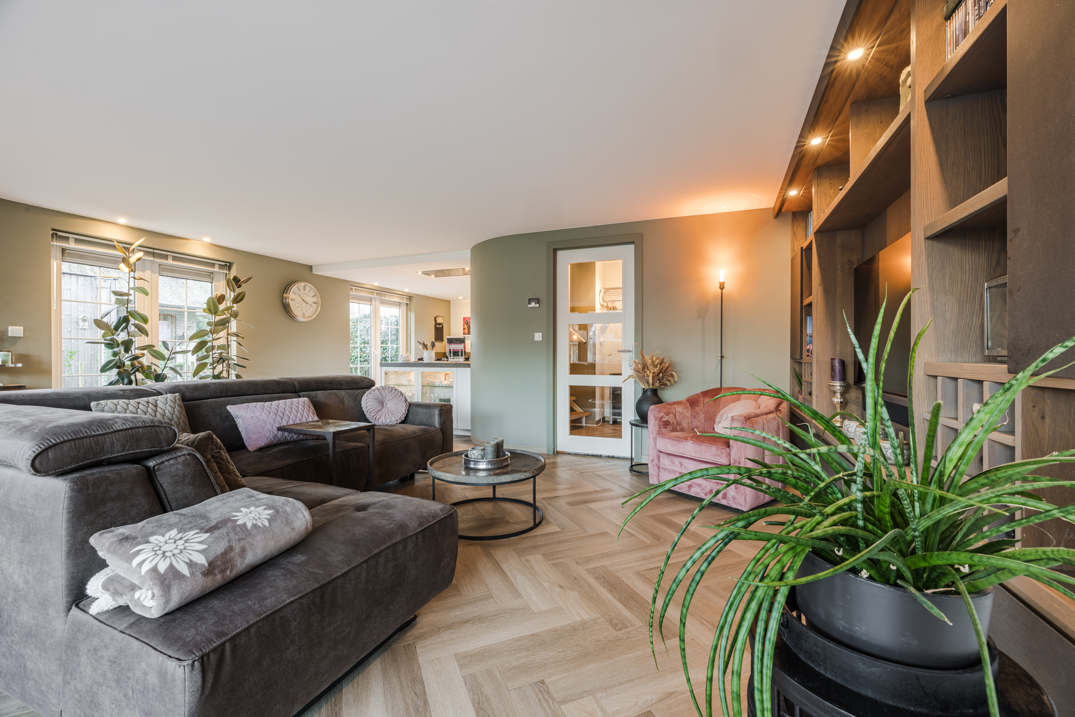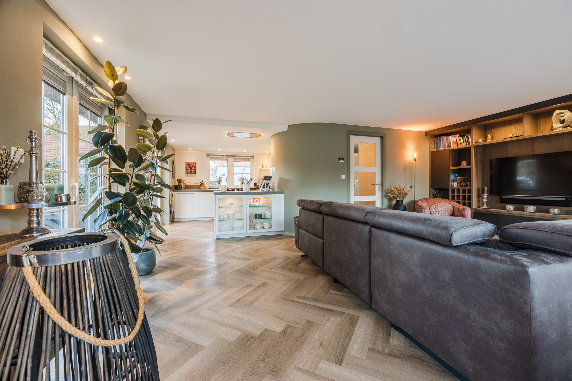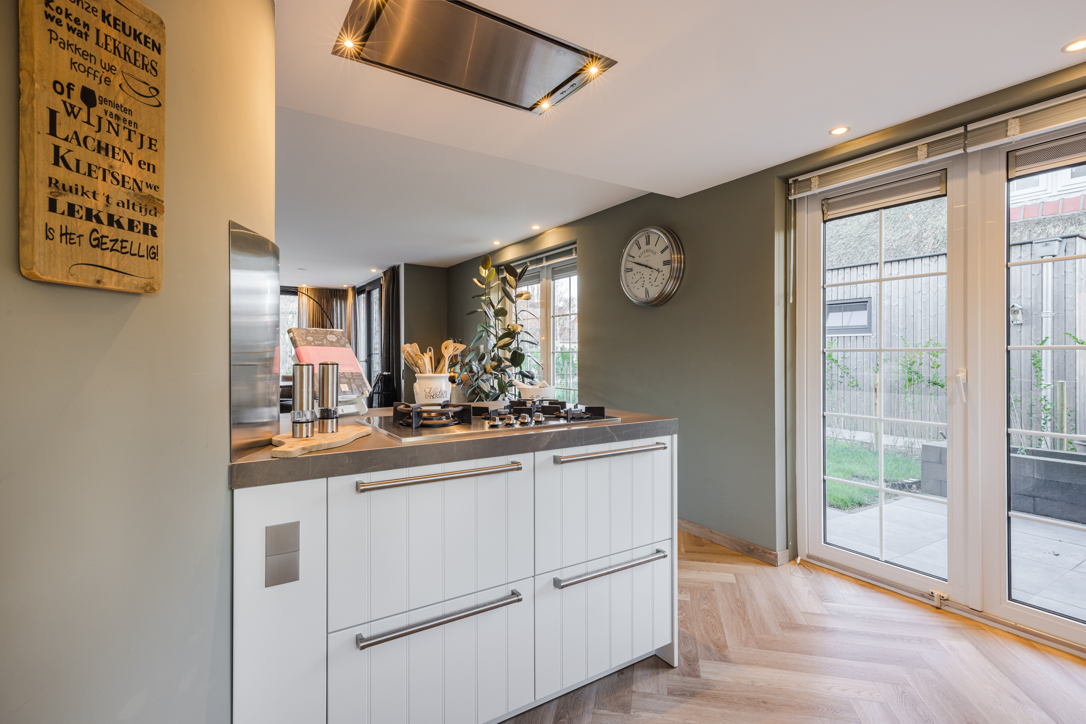 De ruime woonkamer heeft een pvc-visgraatvloer met vloerverwarming, gestuukte wanden en plafonds en het mooie ingebouwde wandmeubel maakt het geheel af. De aanbouw heeft een grote schuifpui naar de achtertuin en zowel de woonkamer als de keuken hebben openslaande deuren naar de tuin. Zo heb je ’s zomers echt dat binnen/buiten gevoel! De open keuken is ingericht met inbouwapparatuur als: een 4-pits gaskookplaat, inbouwafzuigkap, vaatwasser, koelkast en een combioven.