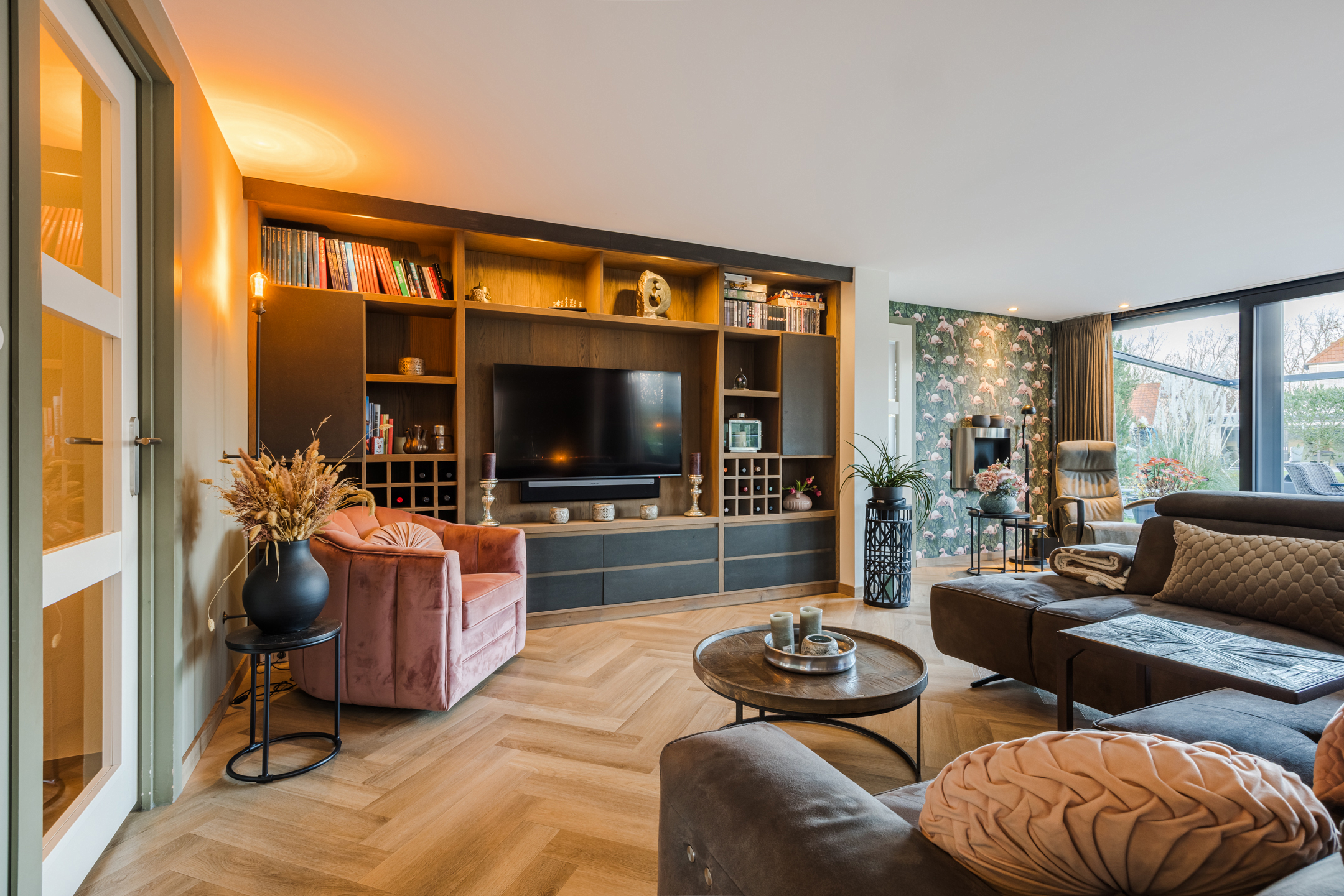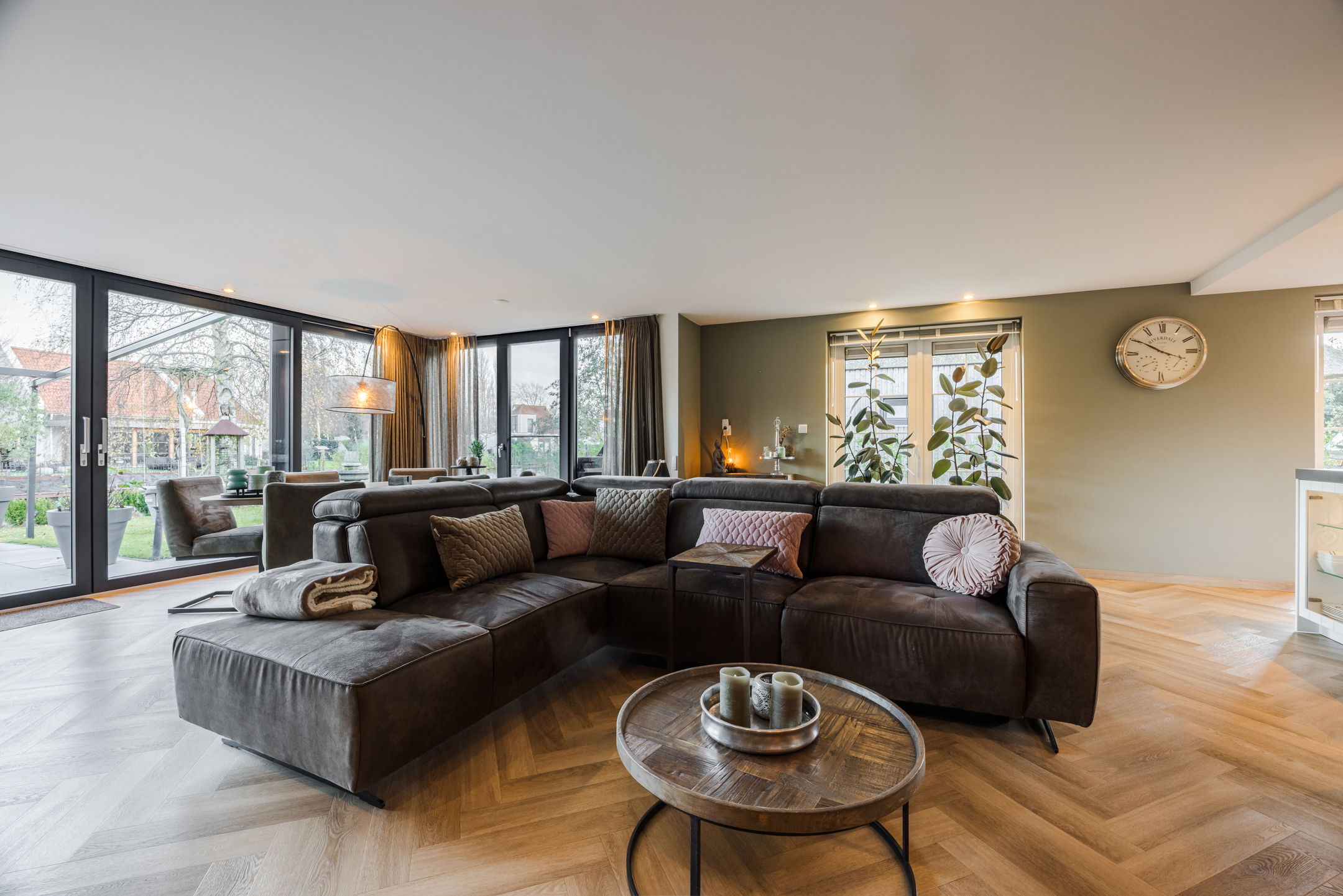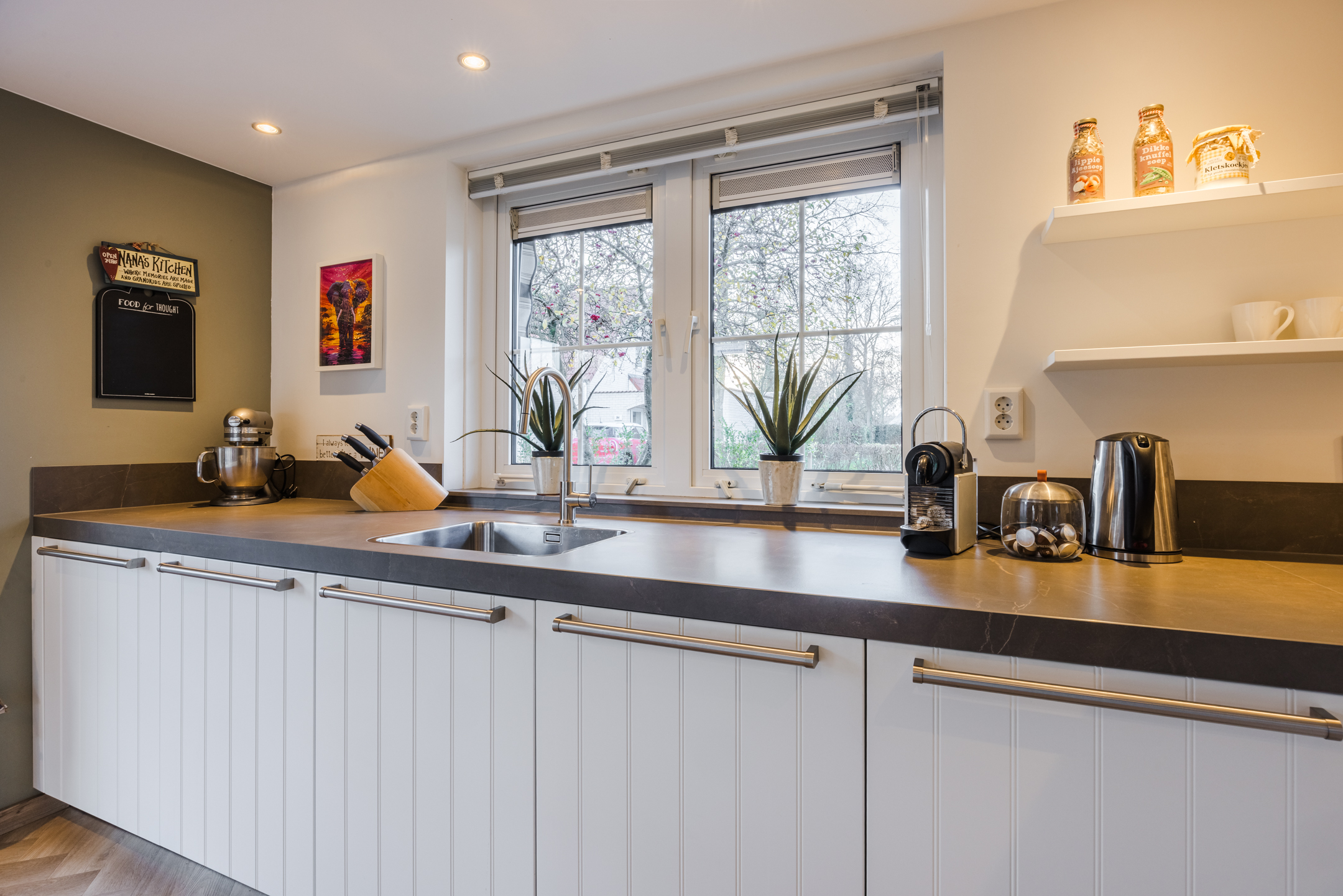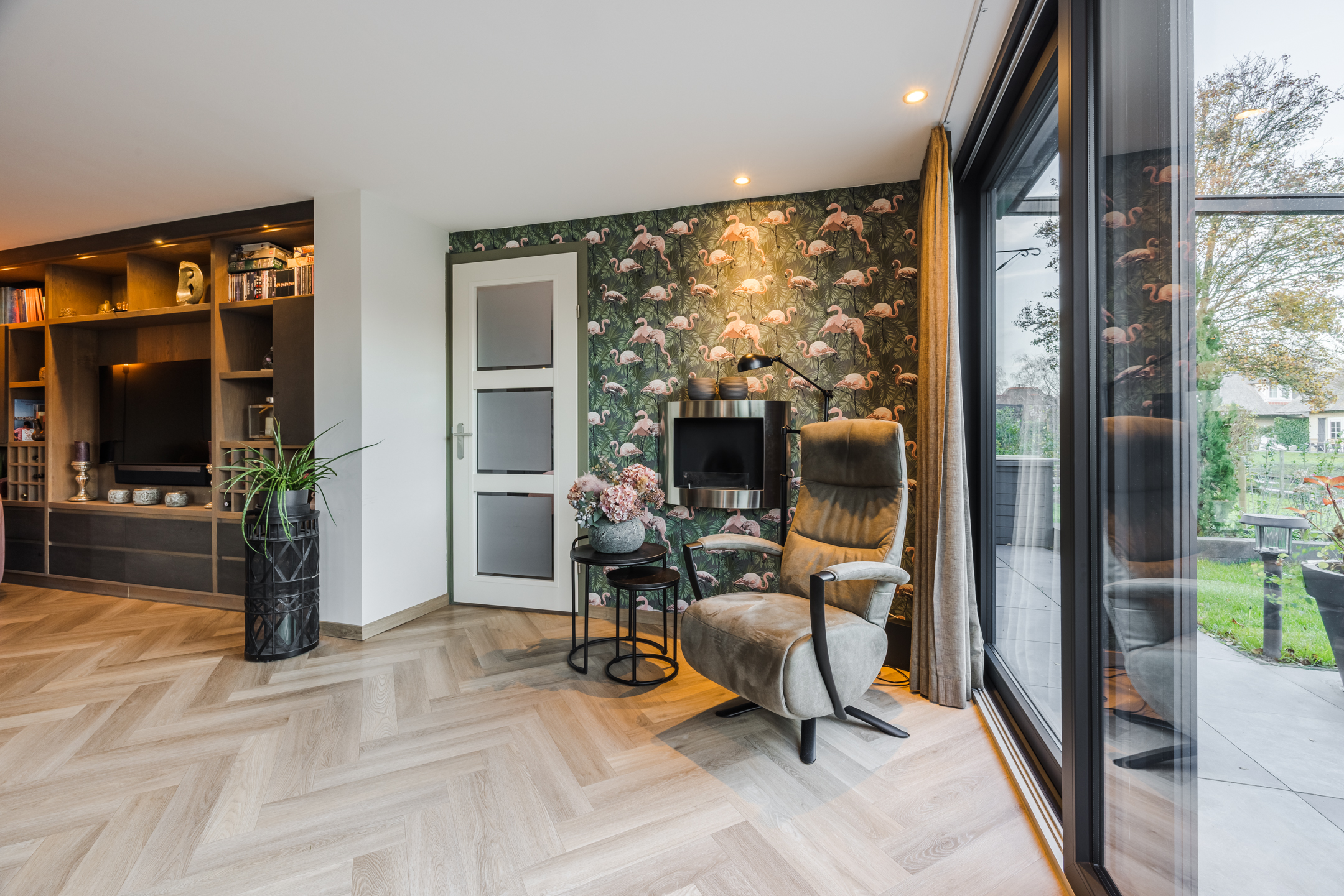 De ruime woonkamer heeft een pvc-visgraatvloer met vloerverwarming, gestuukte wanden en plafonds en het mooie ingebouwde wandmeubel maakt het geheel af. De aanbouw heeft een grote schuifpui naar de achtertuin en zowel de woonkamer als de keuken hebben openslaande deuren naar de tuin. Zo heb je ’s zomers echt dat binnen/buiten gevoel! De open keuken is ingericht met inbouwapparatuur als: een 4-pits gaskookplaat, inbouwafzuigkap, vaatwasser, koelkast en een combioven.