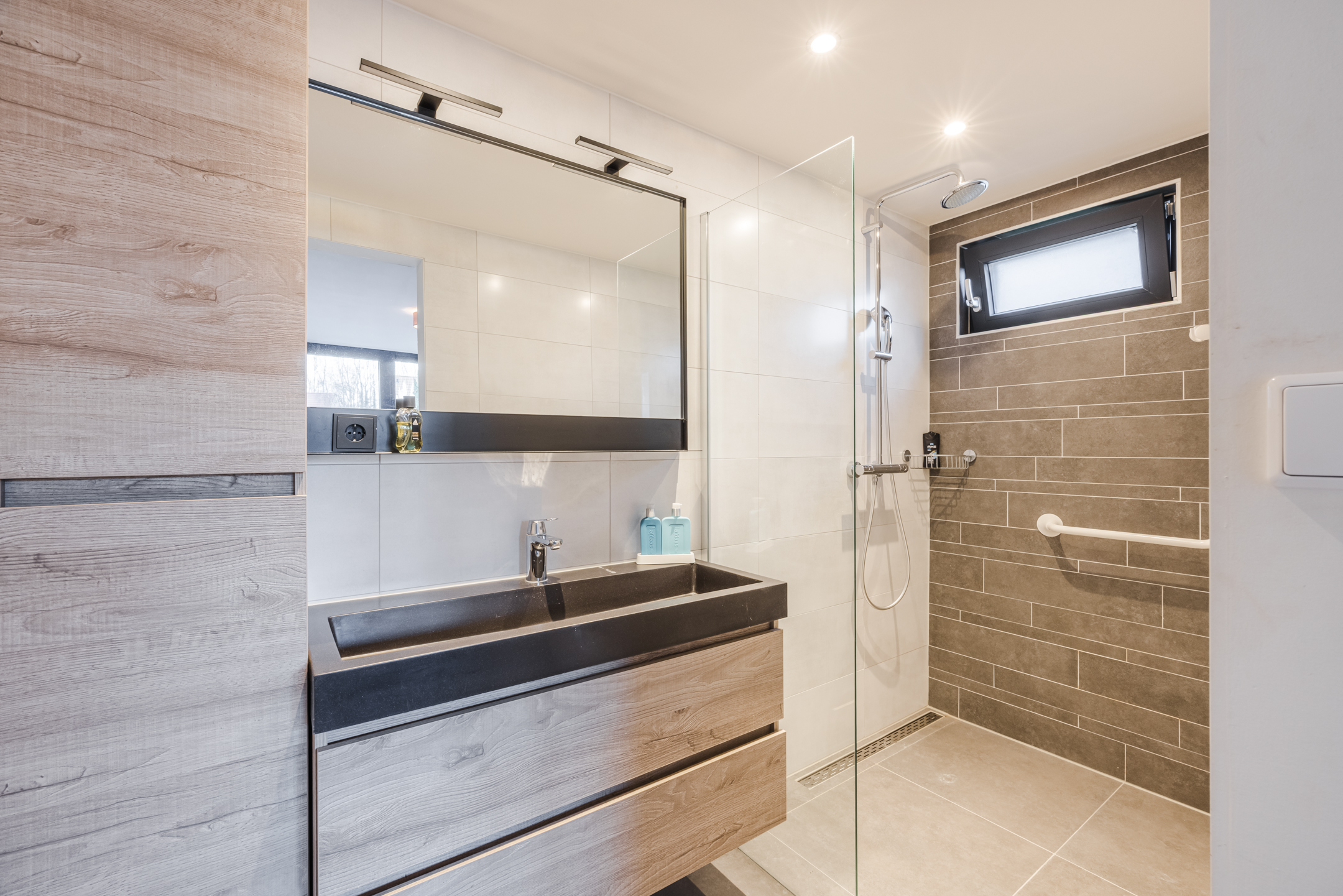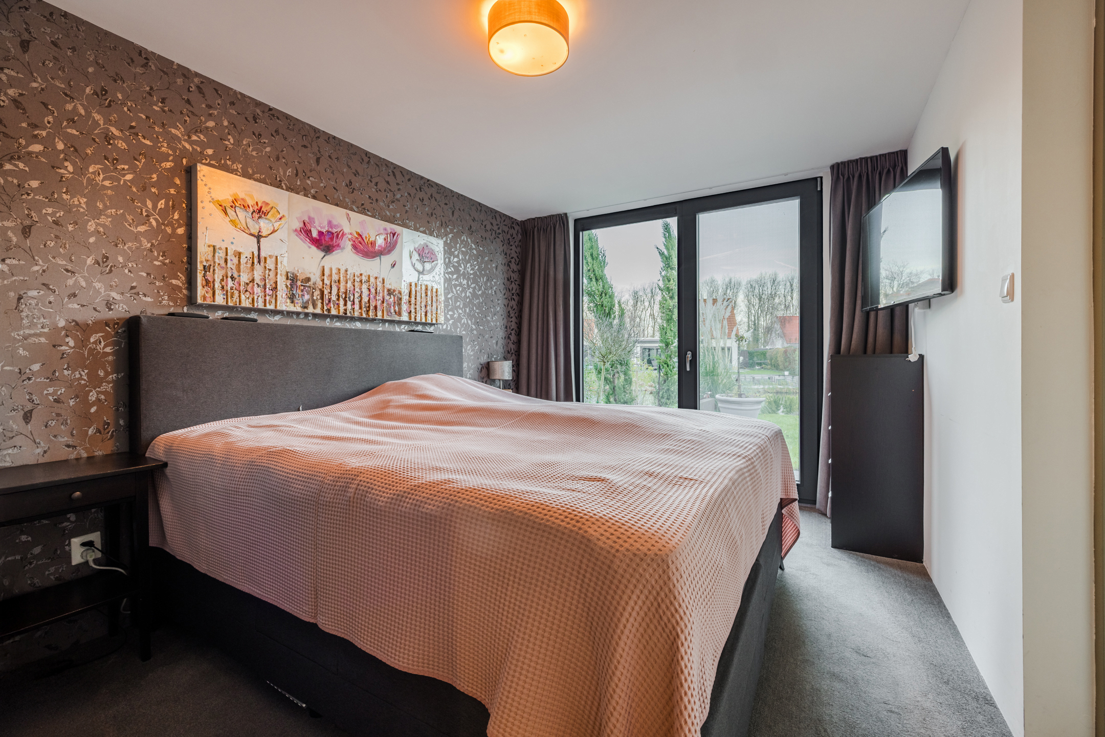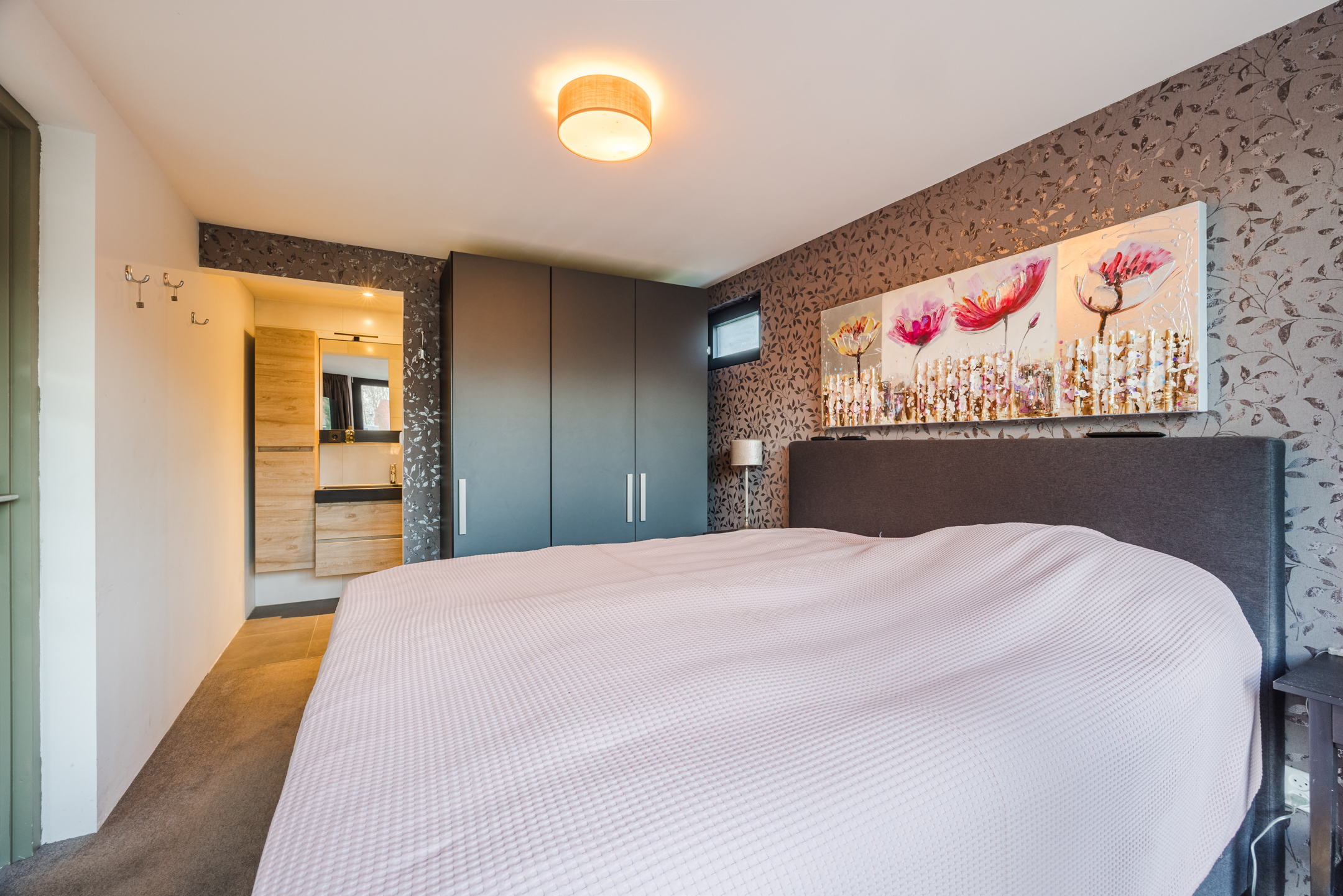 Vanuit de woonkamer is er een deur naar de slaapkamer, met een eigen deur naar de achtertuin en de en-suite badkamer welke is ingericht met een inloopdouche en een wastafelmeubel.