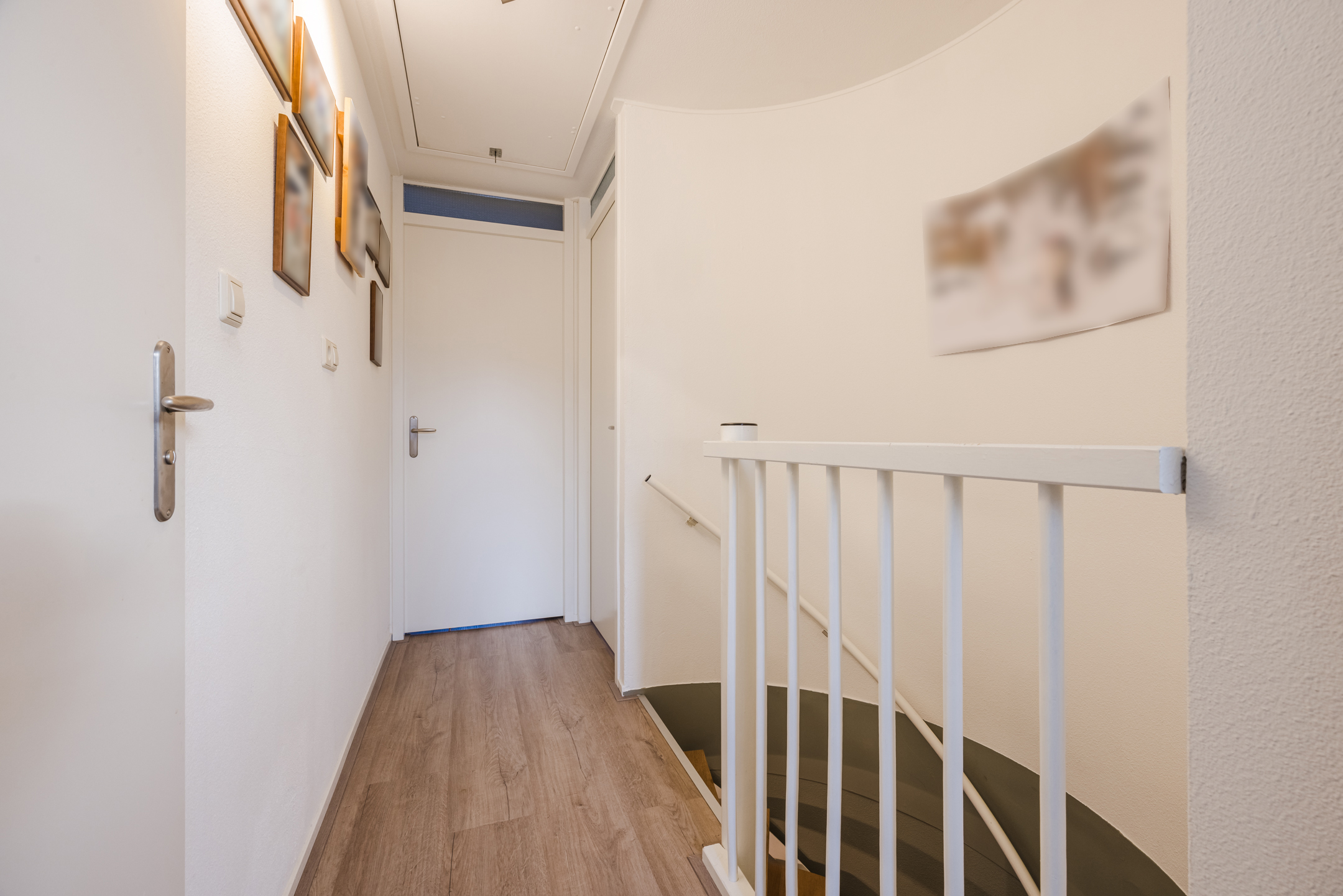 Overloop met toegang tot 3 slaapkamers, de 2e badkamer en de vlizotrap naar de bergzolder met de unit van de mechanische ventilatie.