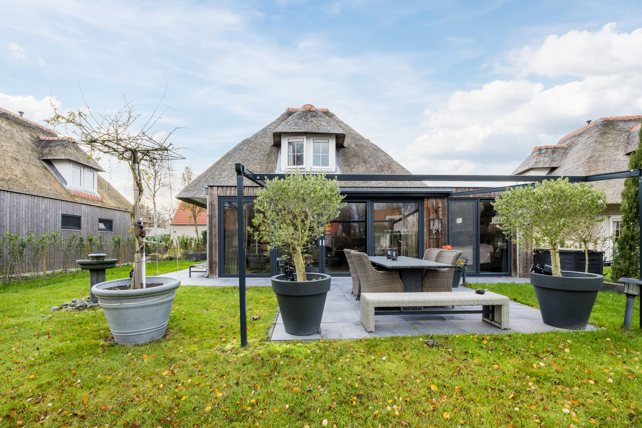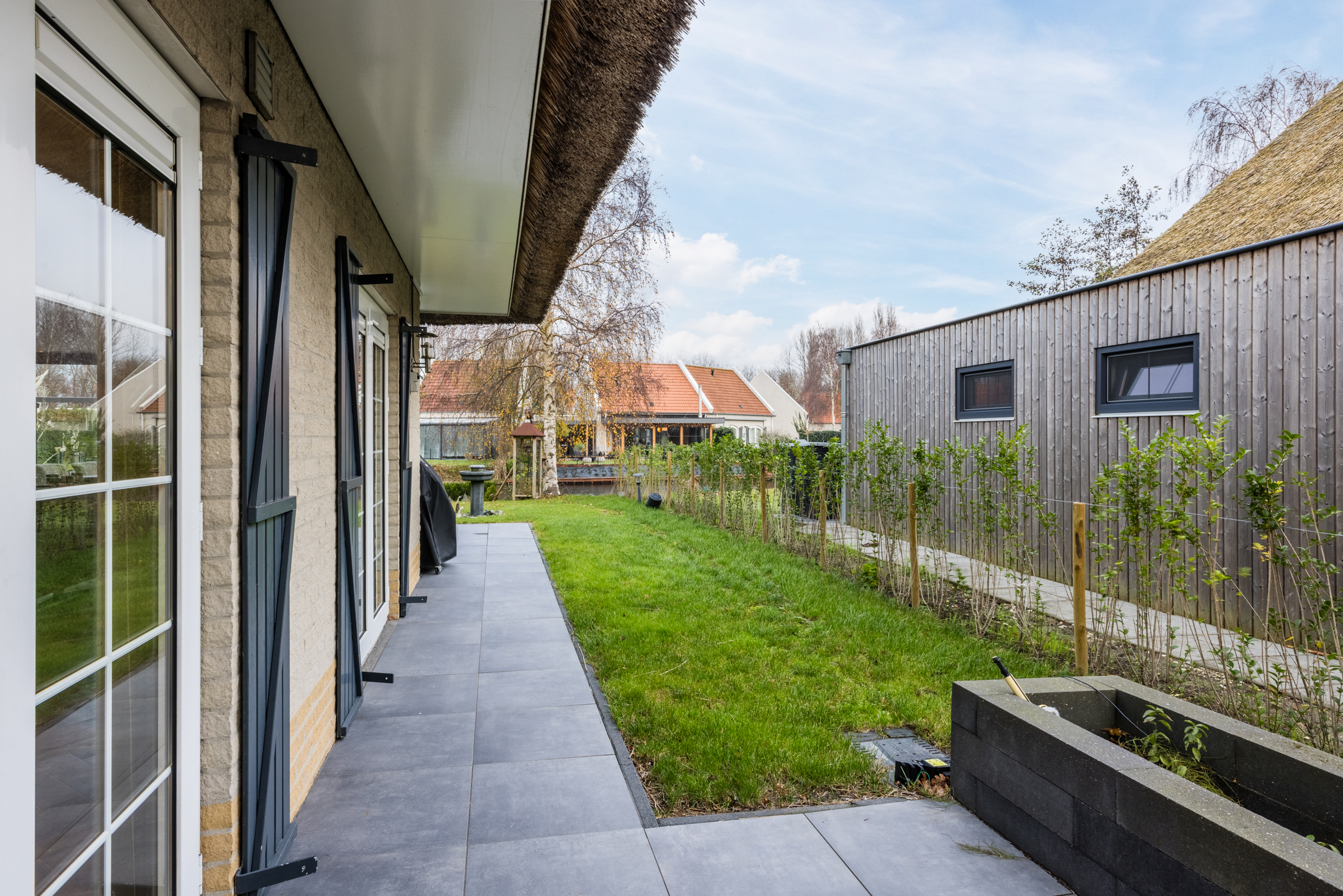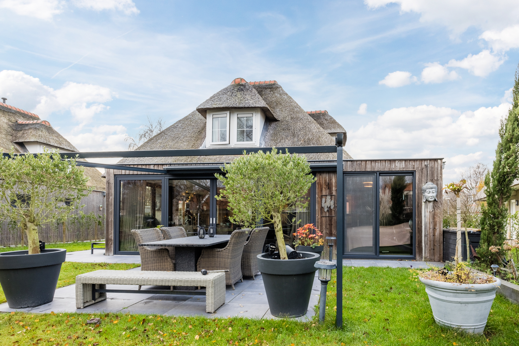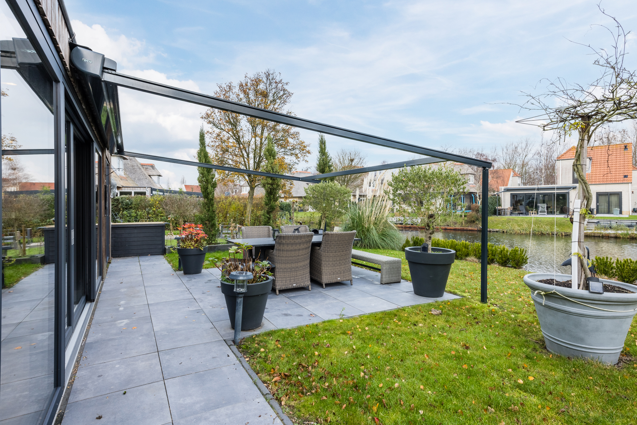 De achtertuin is aangelegd met een betegeld terras, gazon en plantenborders. Aan de achtergevel bevindt zich een elektrisch bedienbaar scherm, waarmee u ’s zomers eenvoudig de gewenste schaduw over het terras creëert — geen overbodige luxe!