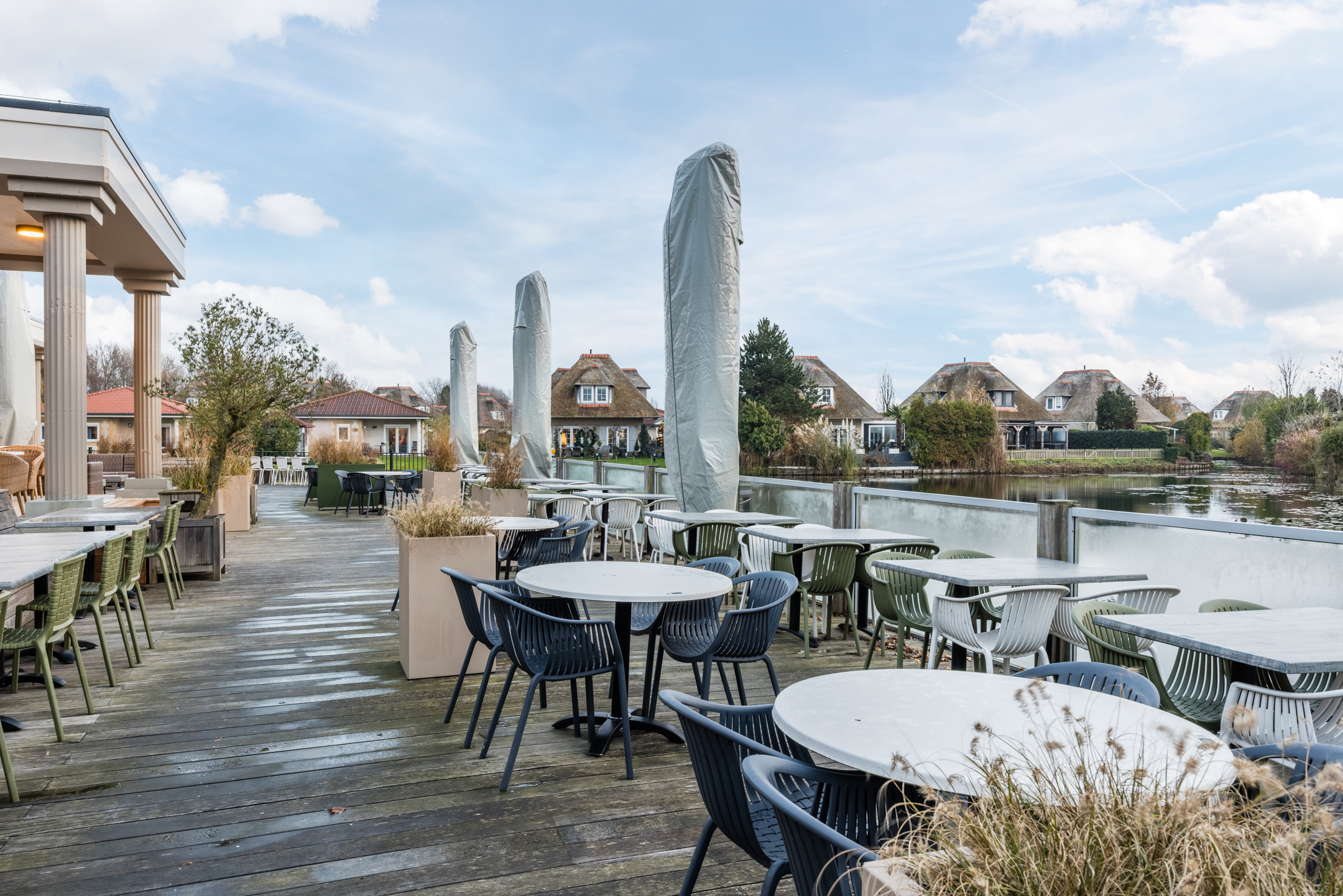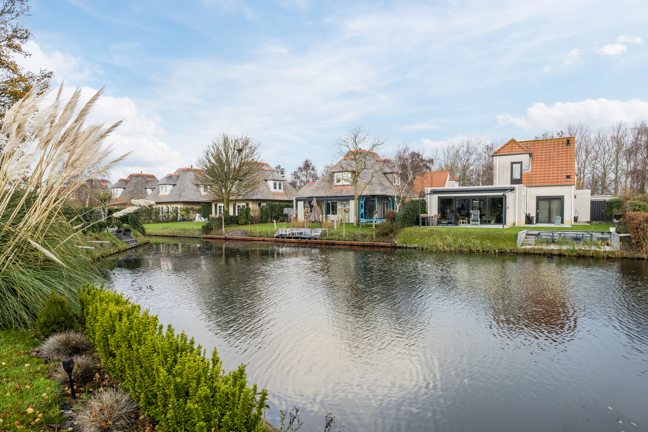 Op vakantiepark Cittá Romana omringd door natuur, grenzend aan het Haringvliet, de historische vestingstad Hellevoetsluis en vlakbij het Noordzee Strand ligt deze vrijstaande, levensloopbestendige, recreatievilla met rieten kap en riante tuin rondom, schitterend aan het water.