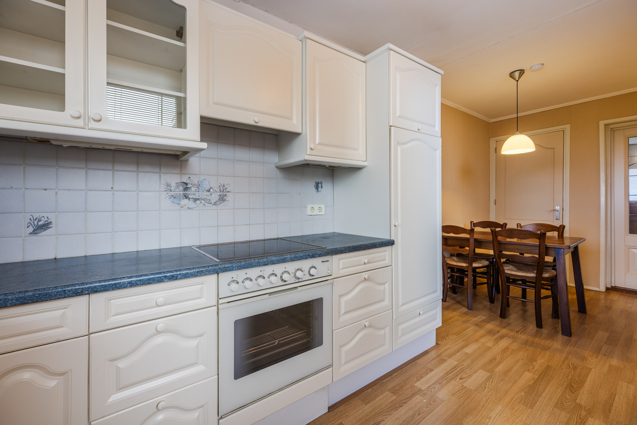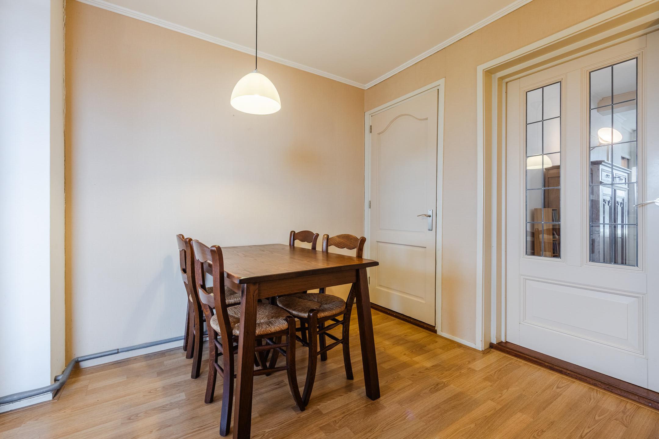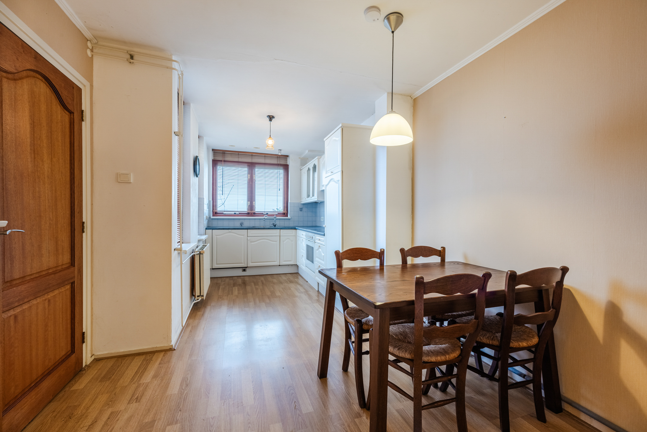 Hal/entree met een vaste kast. De ruime woonkamer heeft grote ramen aan zowel de voor- als zijkant van de woning, er is een deur naar de trapopgang naar de 1e verdieping en aansluitend de eetkamer/keuken; hier is alle ruimte voor een grote eettafel om gezellige avonden met vrienden of familie door te brengen! De keuken zelf is ingericht met een vaatwasser, koelkast, oven en een elektrische kookplaat.