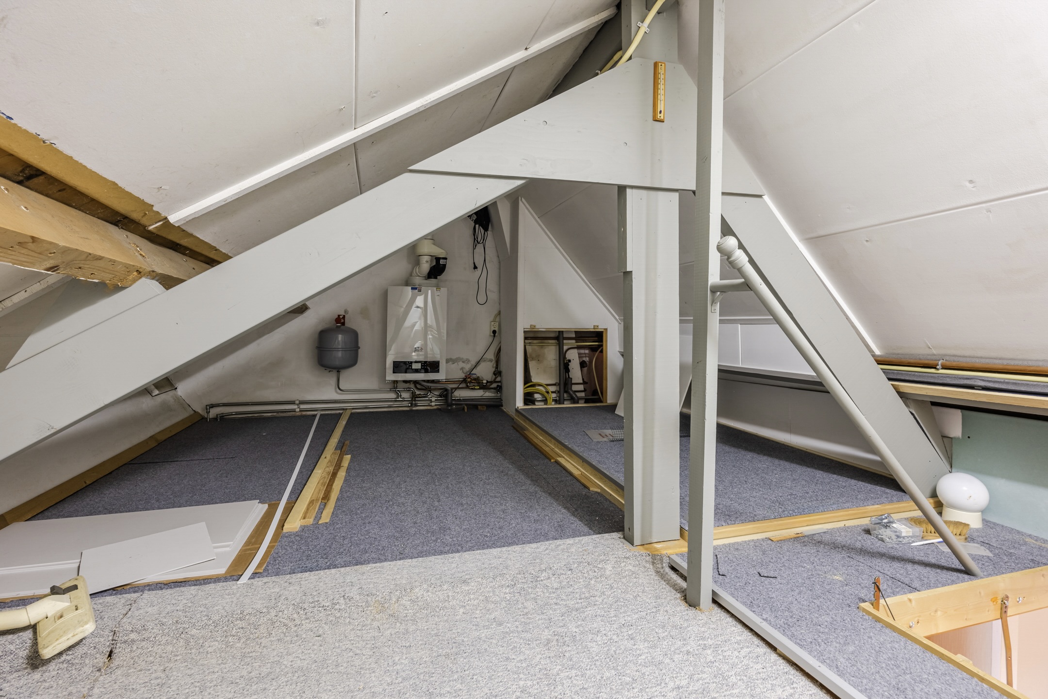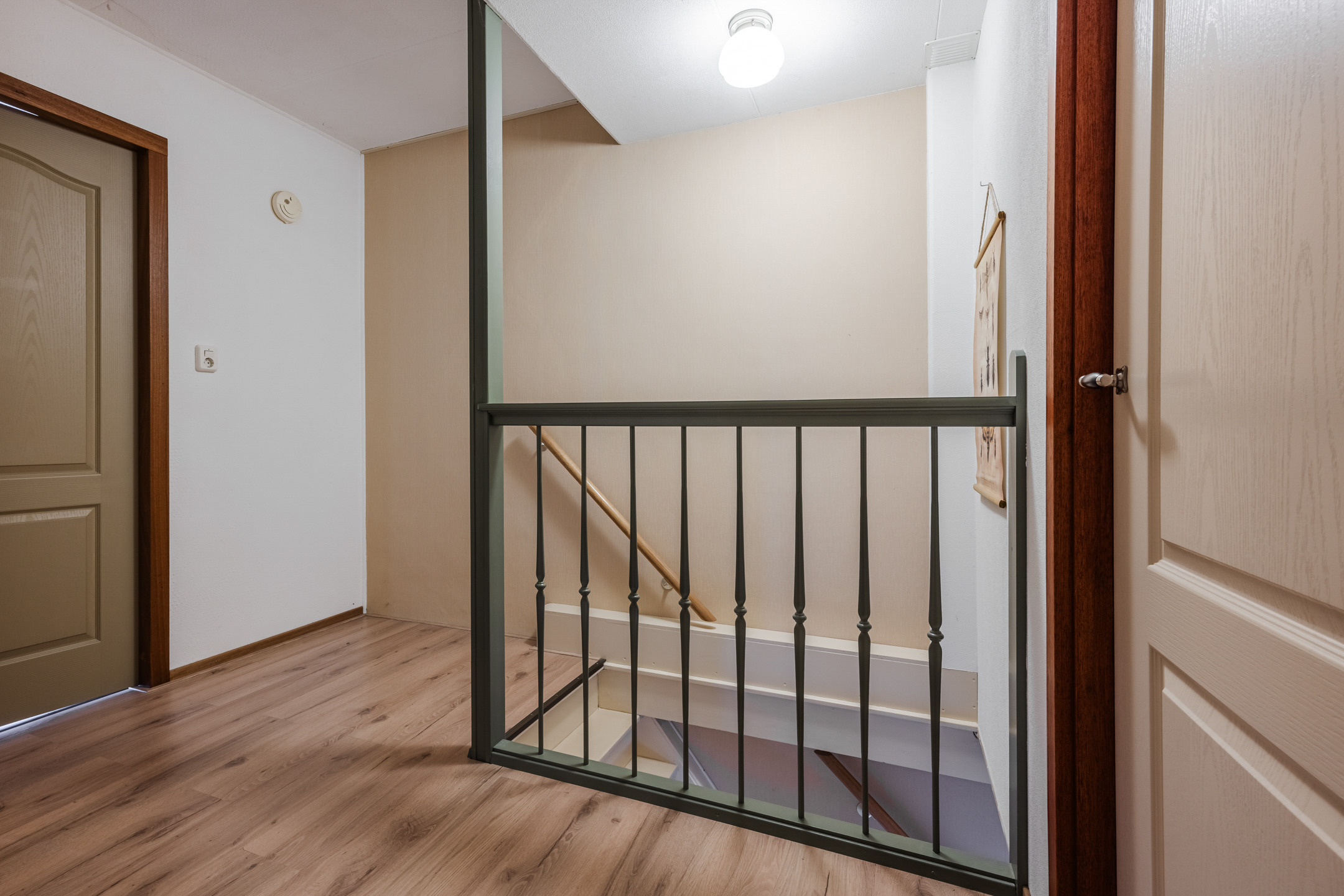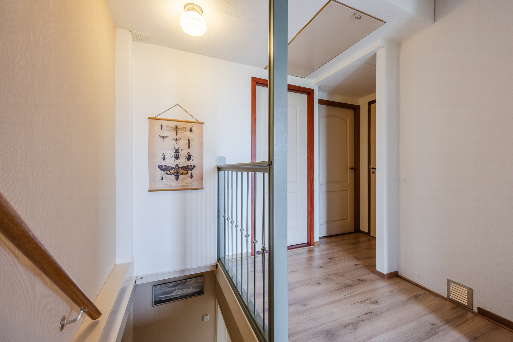Overloop met toegang tot de 3 slaapkamers en de badkamer. De grootste slaapkamer is gelegen aan de achterzijde, heeft vrij uitzicht en een deur naar het dak. De andere 2 slaapkamers zijn aan de voorzijde gelegen. De ruime badkamer is ingericht met een vaste wastafel, douchecabine, 2e toilet en de witgoedaansluitingen. Vanaf de overloop is via een vlizotrap de zolder te bereiken, met bergruimte en de opstelplaats van de cv-combiketel (Intergas, 2023).