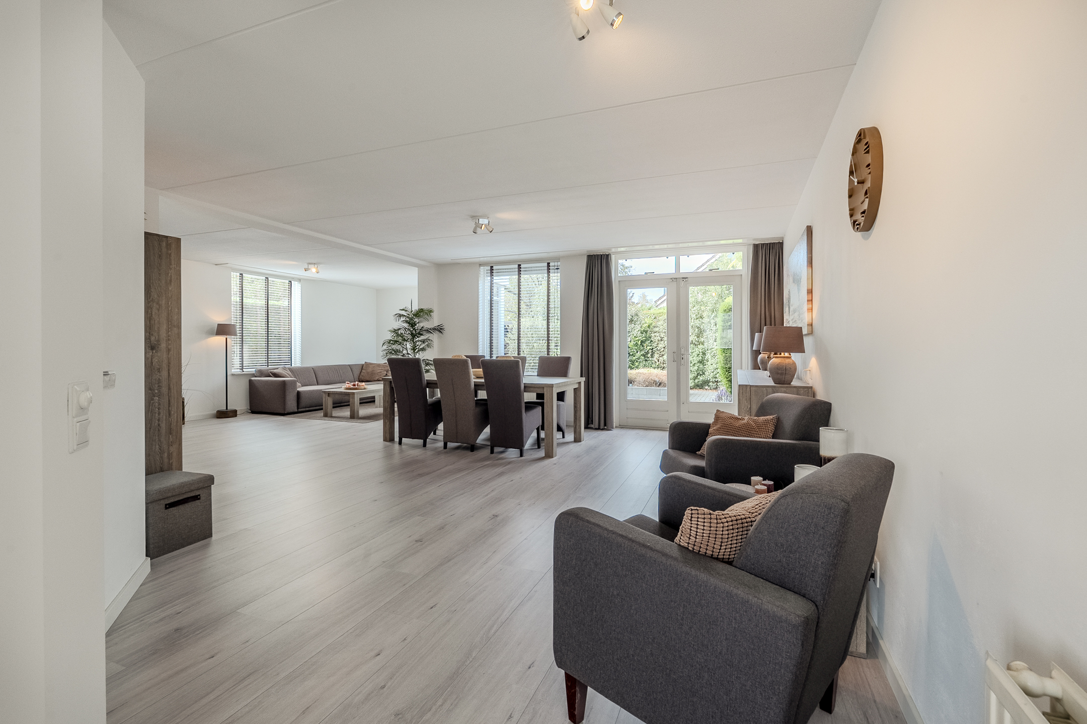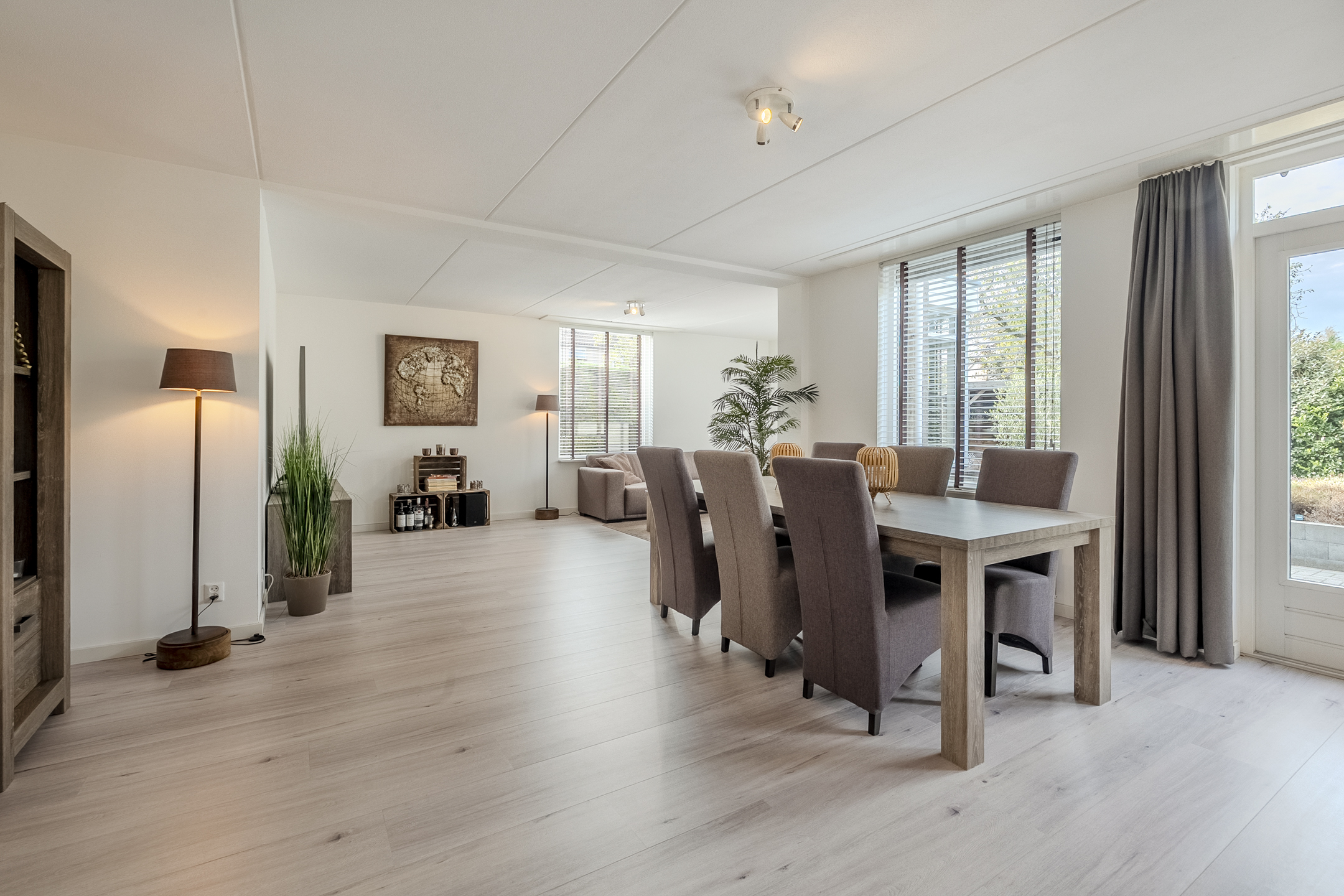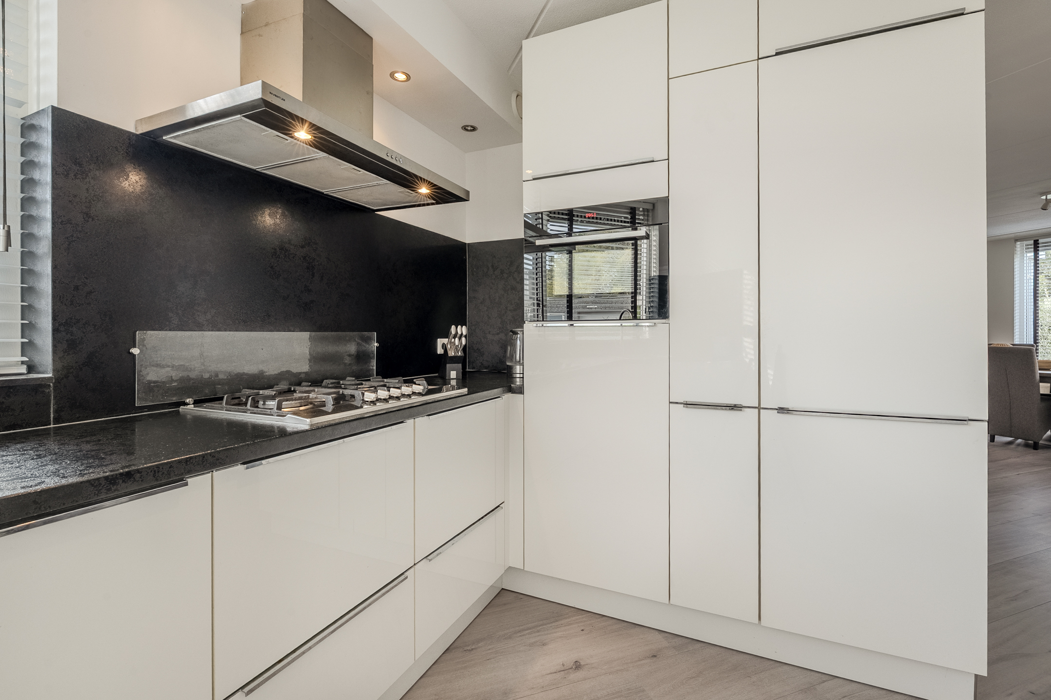 Vanuit de hal kom je tevens in de royale woonkamer. Deze biedt volop plek voor een gezellige zithoek bij de sfeerhaard en een grote eettafel om uitgebreid te dineren. Dankzij de vele raampartijen en openslaande deuren naar de achtertuin is er veel lichtinval. De open keuken is gelegen aan de voorzijde van de woning en is compleet uitgerust met inbouwapparatuur als: een 5-pits gaskookplaat, afzuigkap, koelkast, vriezer, combi-oven, vaatwasser en een close-in boiler.