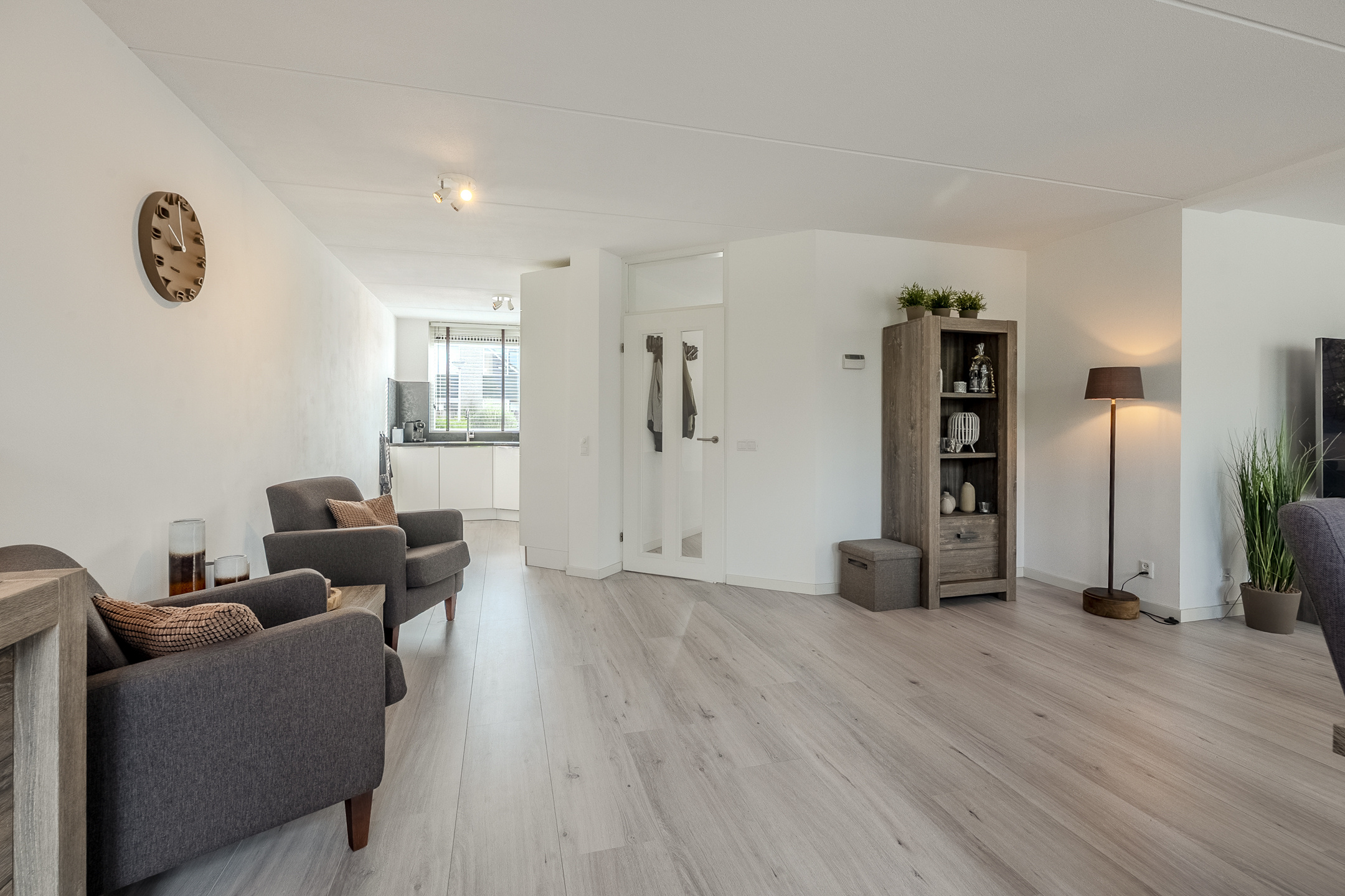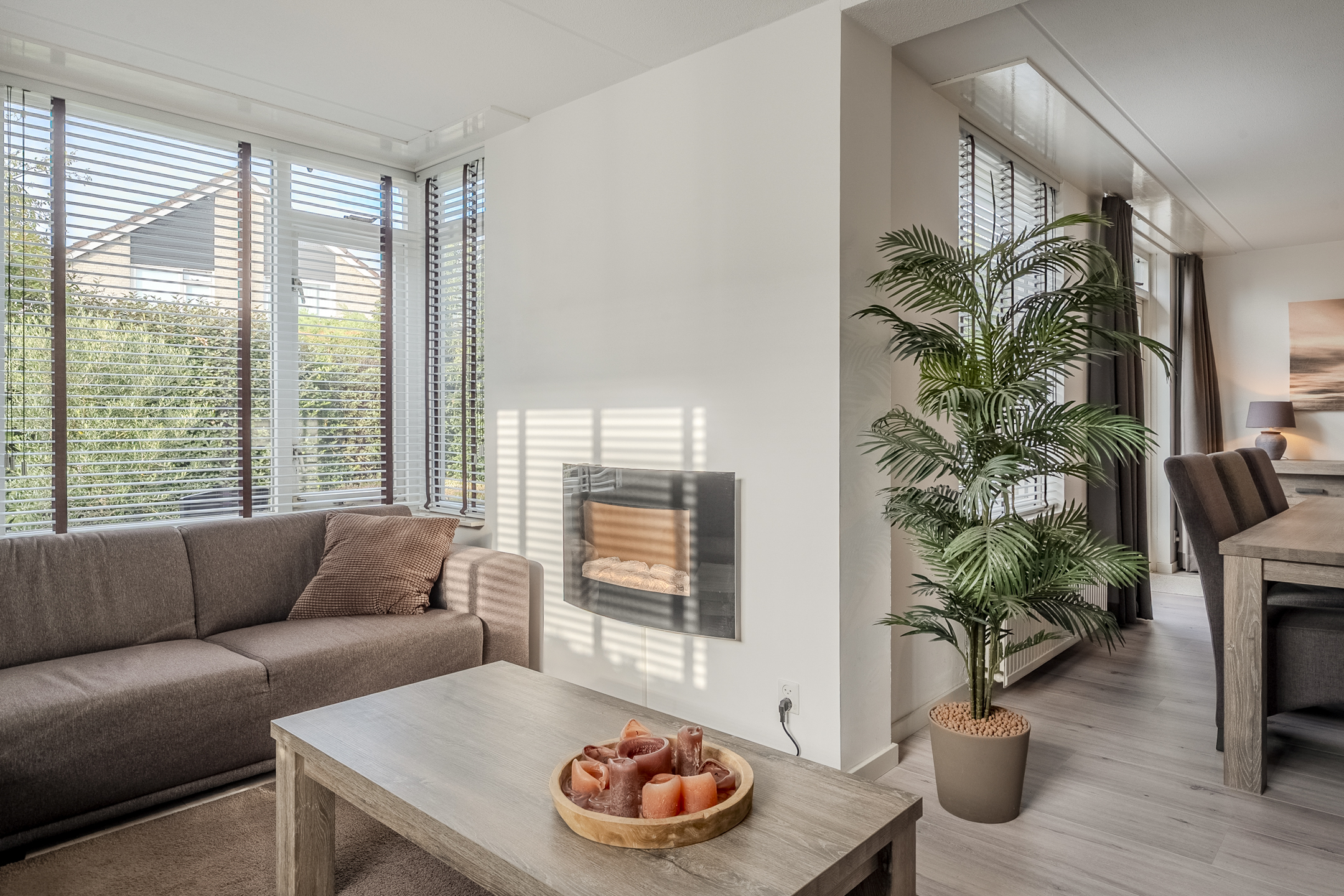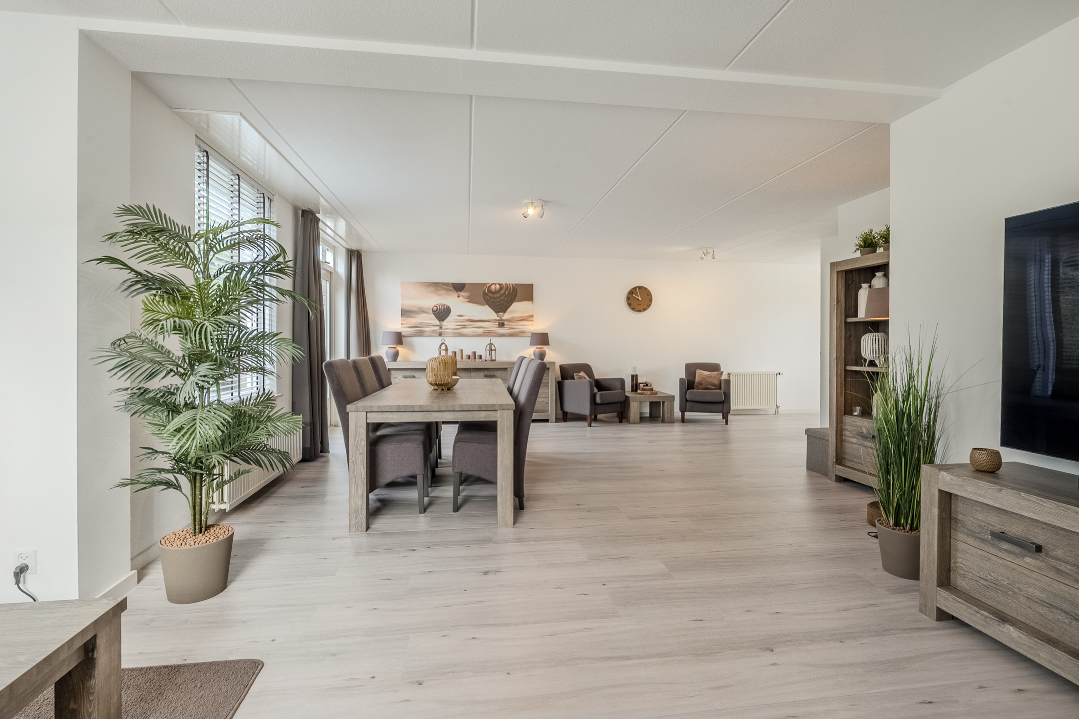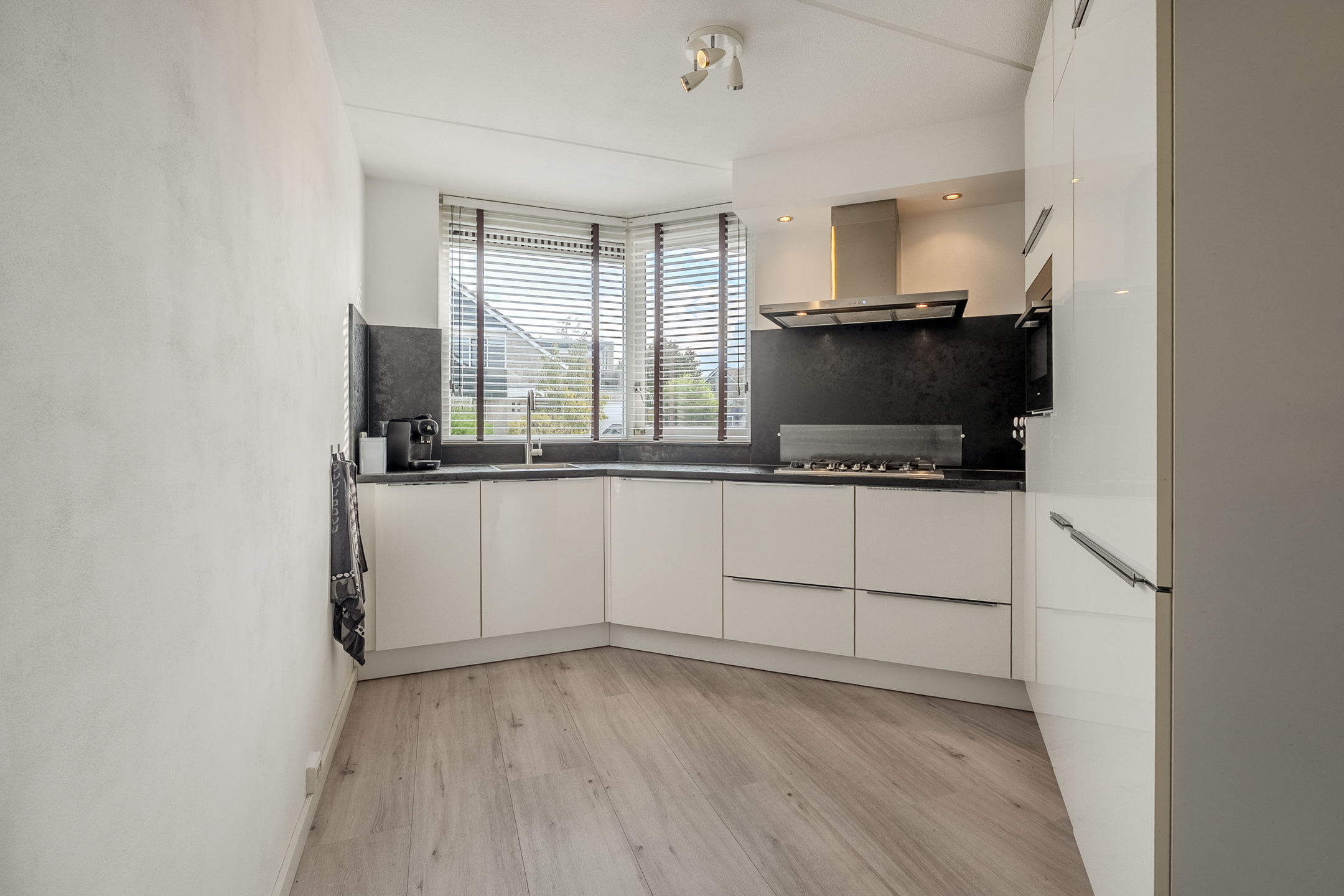 Vanuit de hal kom je tevens in de royale woonkamer. Deze biedt volop plek voor een gezellige zithoek bij de sfeerhaard en een grote eettafel om uitgebreid te dineren. Dankzij de vele raampartijen en openslaande deuren naar de achtertuin is er veel lichtinval. De open keuken is gelegen aan de voorzijde van de woning en is compleet uitgerust met inbouwapparatuur als: een 5-pits gaskookplaat, afzuigkap, koelkast, vriezer, combi-oven, vaatwasser en een close-in boiler.