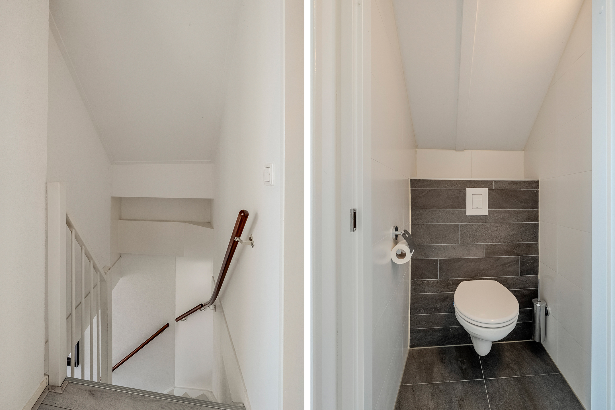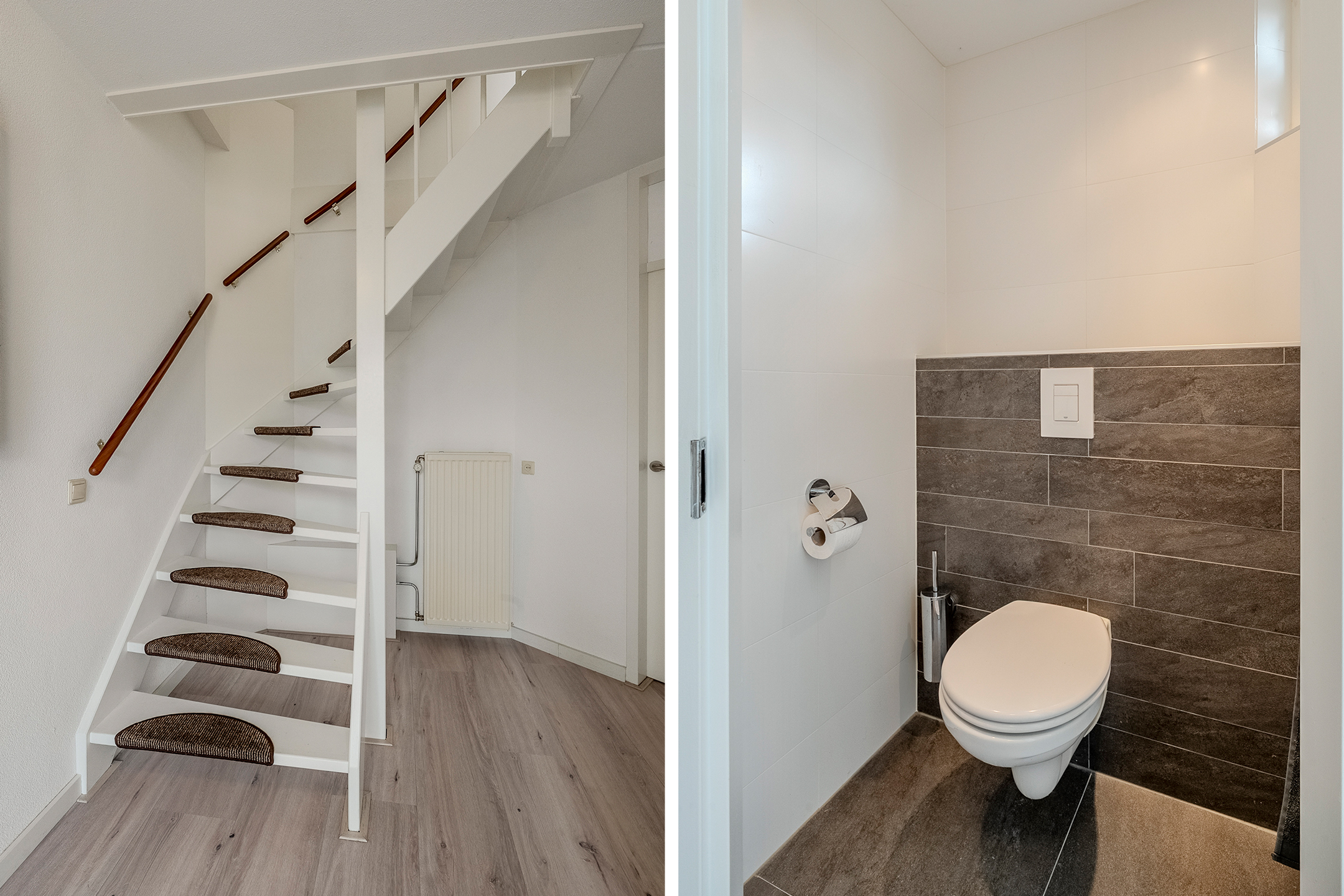 Ruime hal/entree met de trapopgang, geheel betegelde toiletruimte met handwasbakje en inbouwcloset, de meterkast en toegang tot de garage.