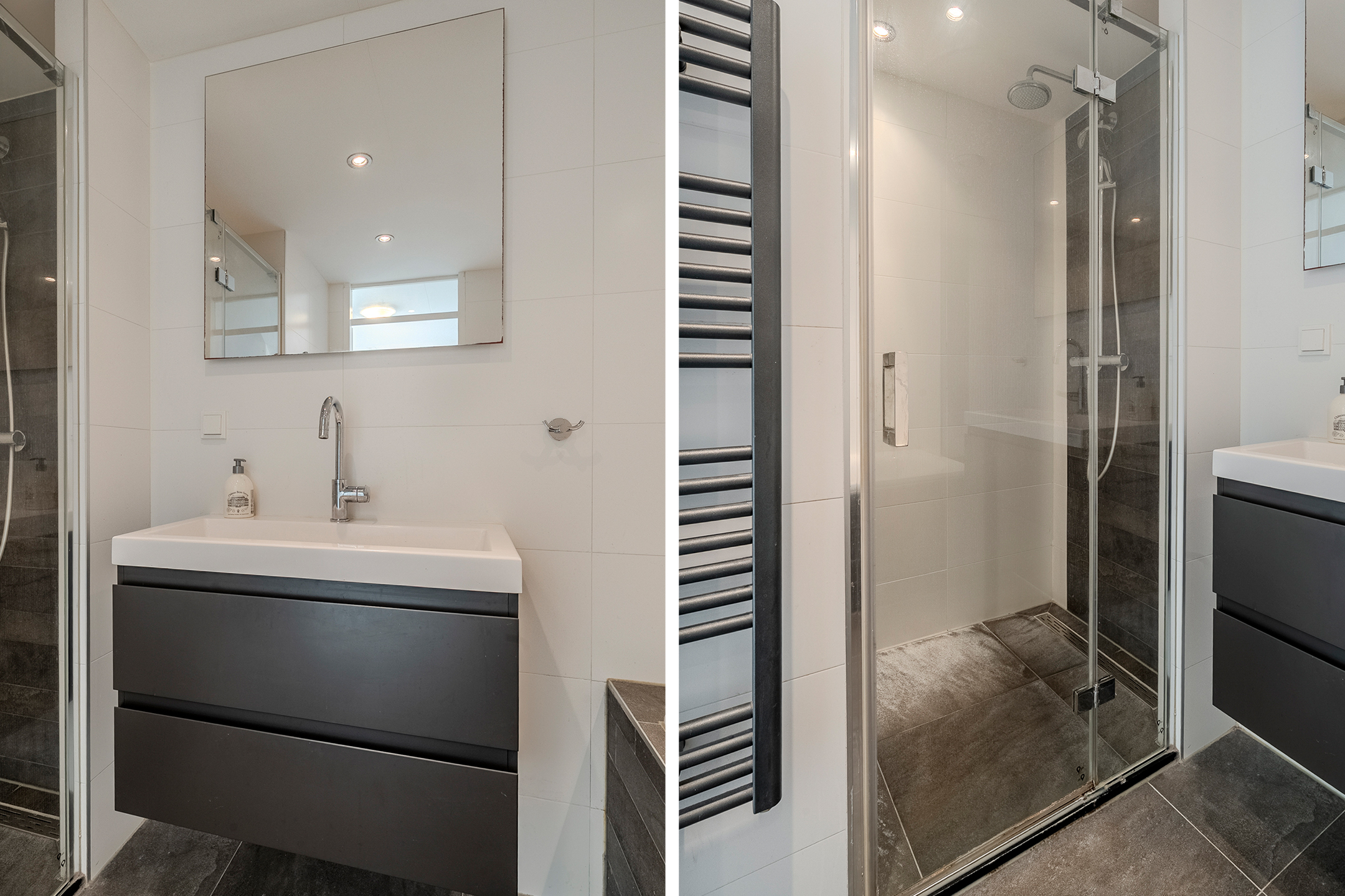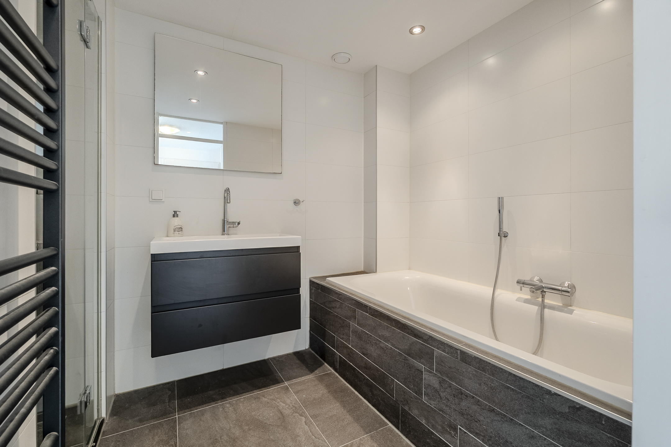 De moderne badkamer is ingericht met een ligbad met whirlpoolfunctie, een wastafelmeubel, designradiator en een ruime douchecabine. Daarnaast is er een separate toiletruimte met een tweede inbouwcloset, uitgevoerd in dezelfde stijl als de badkamer en het toilet op de begane grond.