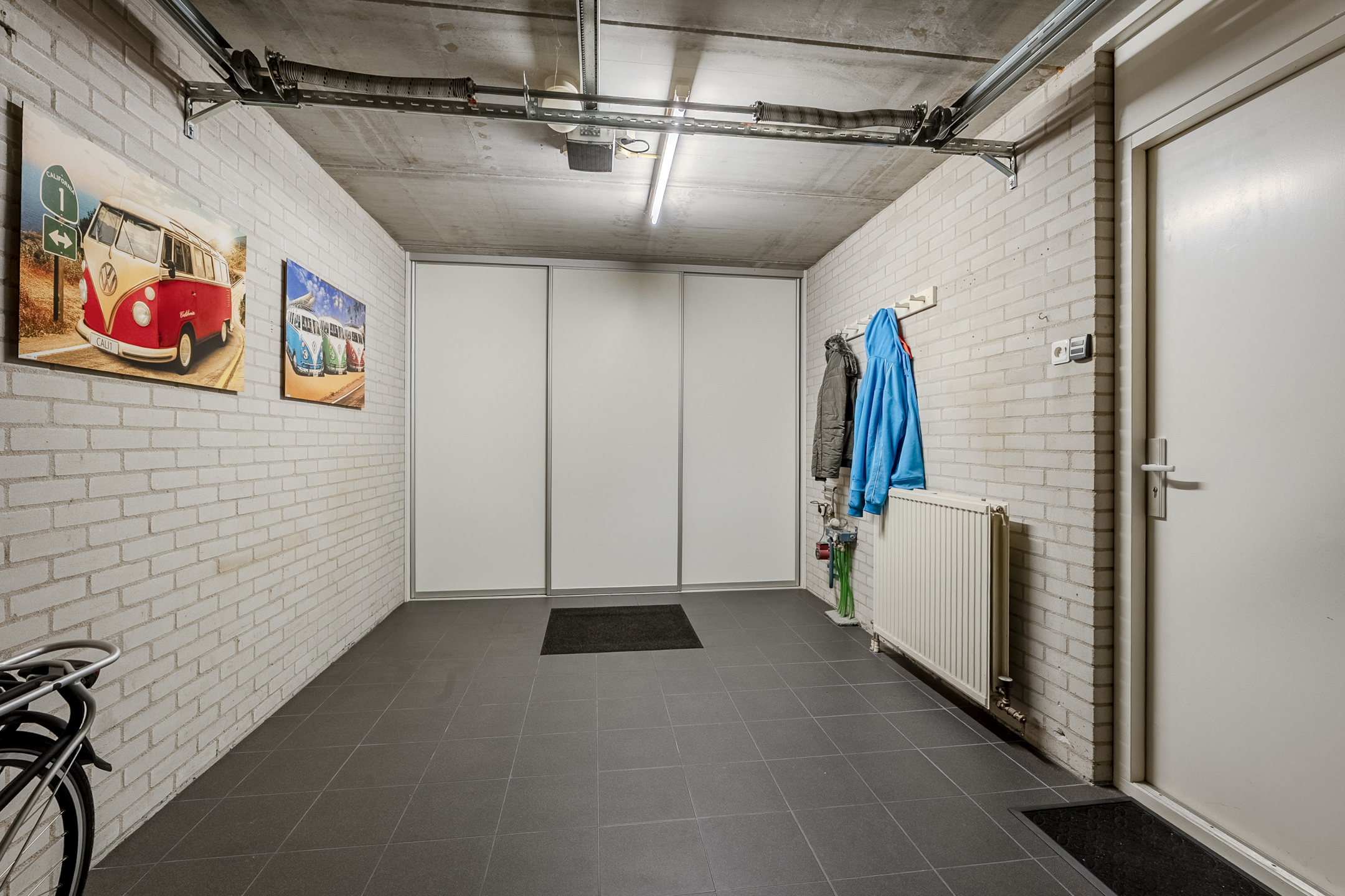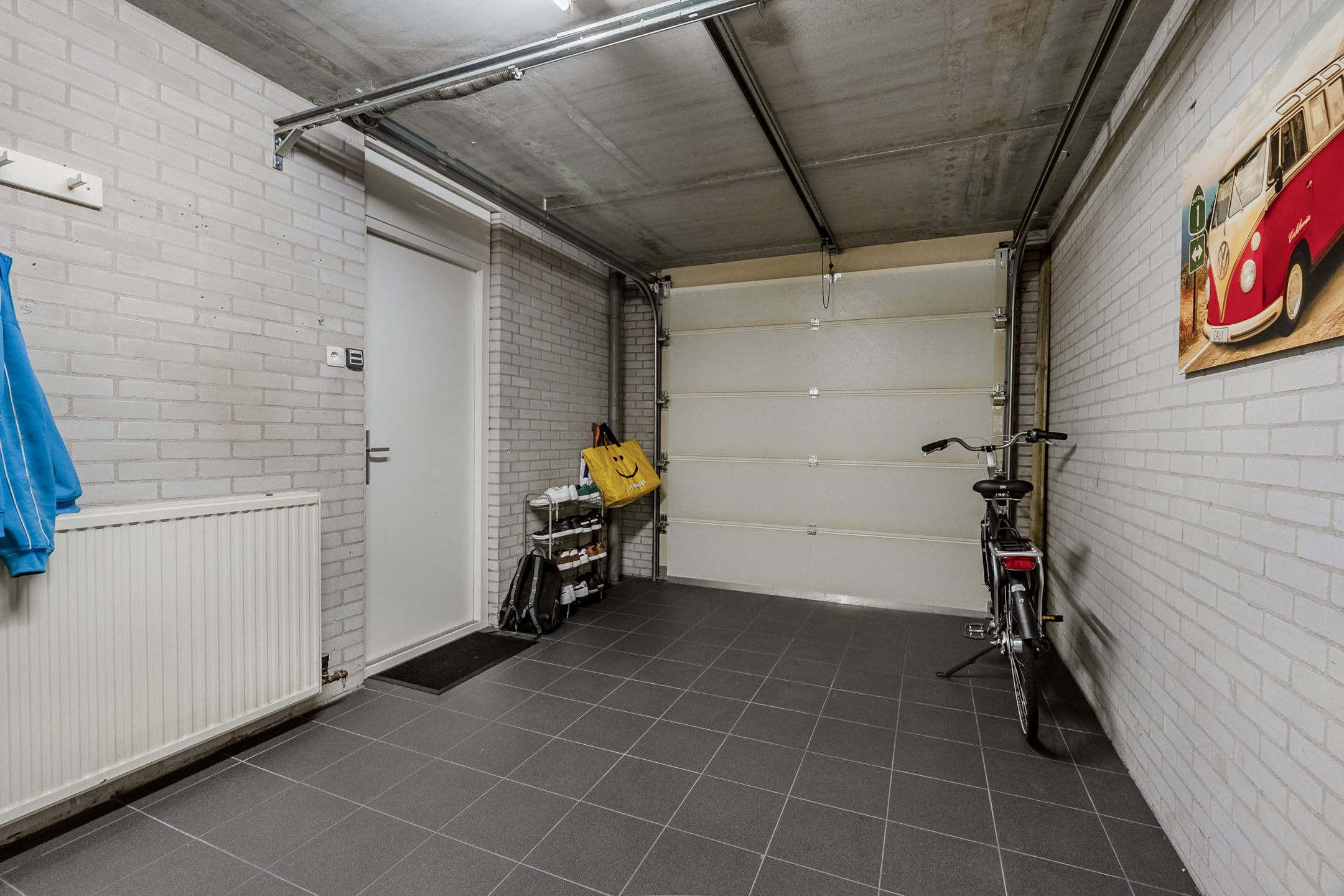 De garage heeft een tegelvloer, een elektrisch bedienbare sectionaaldeur naar de voortuin en een vaste kast met aansluitingen voor de wasmachine en droger.