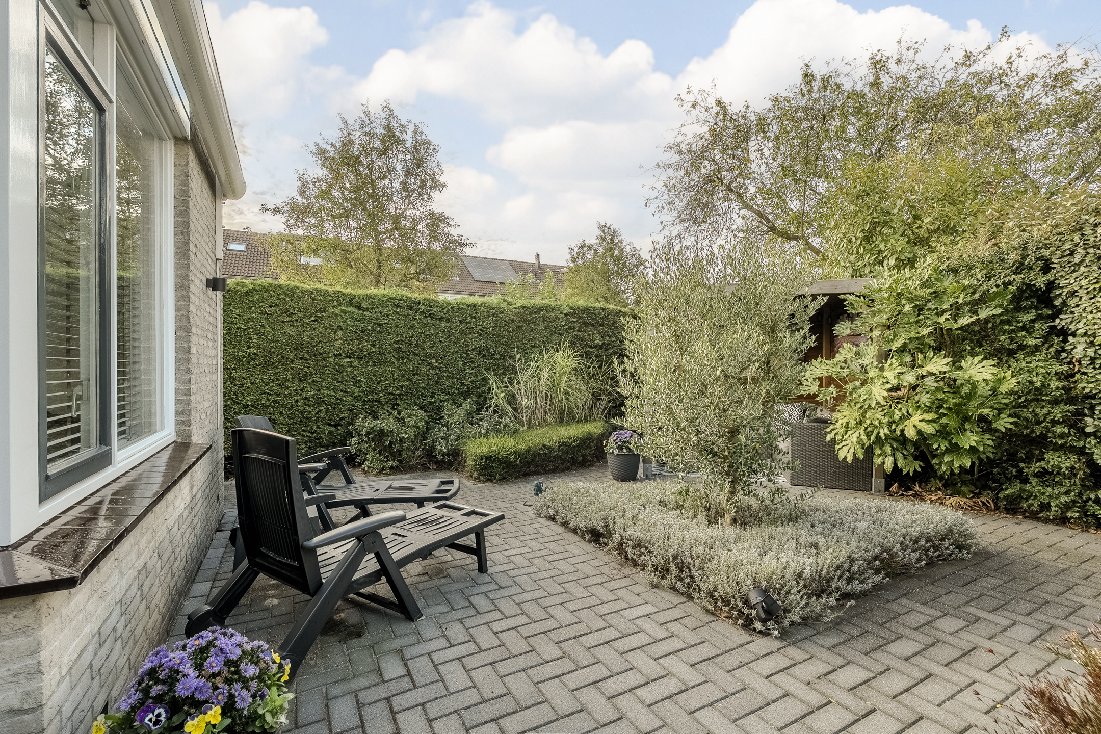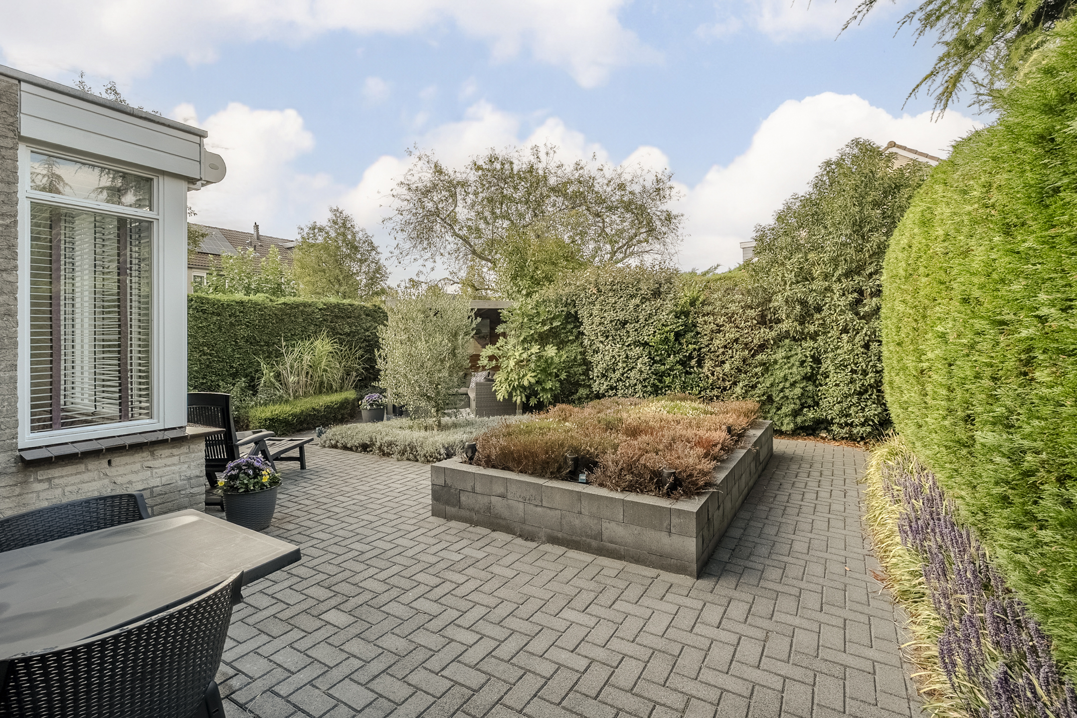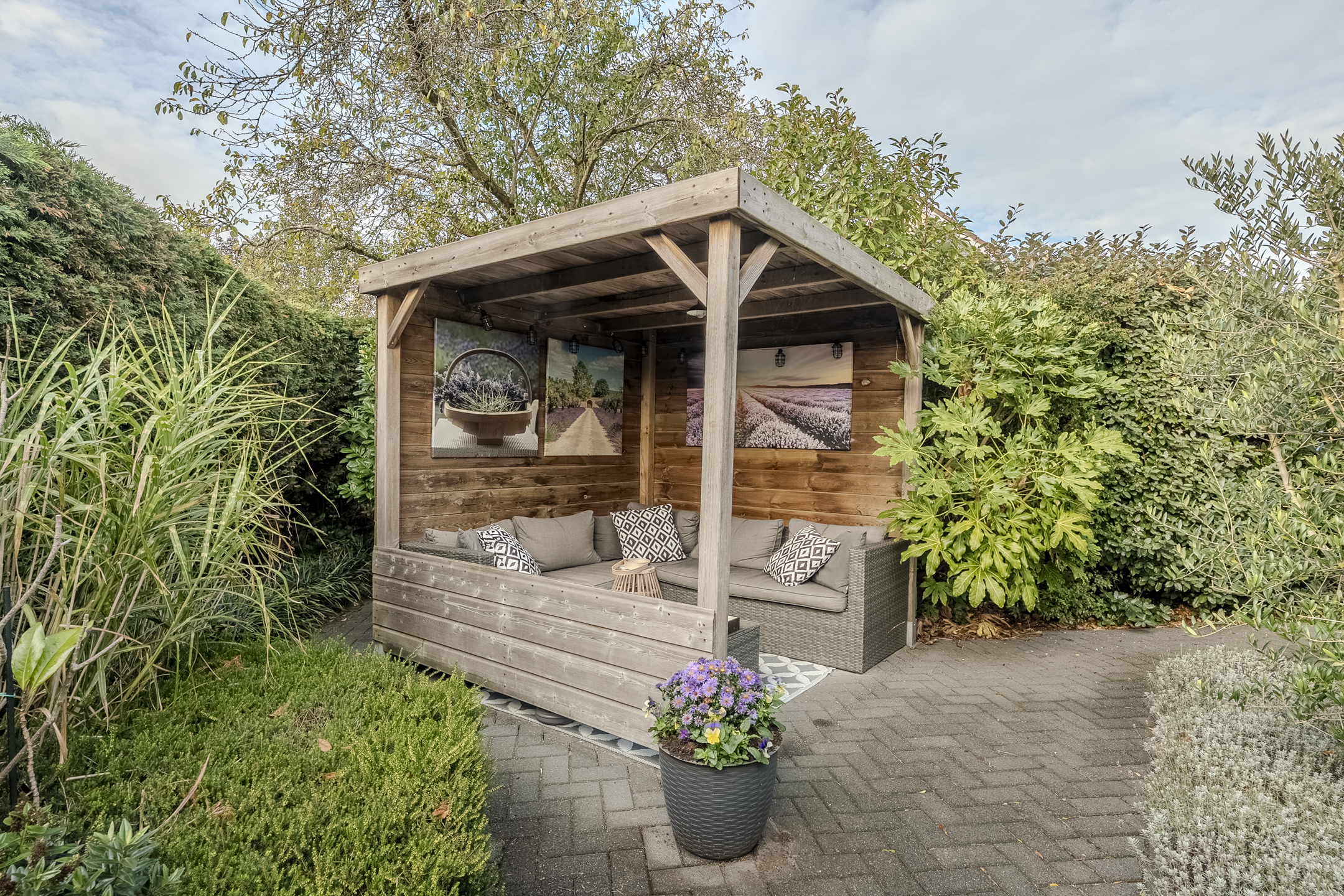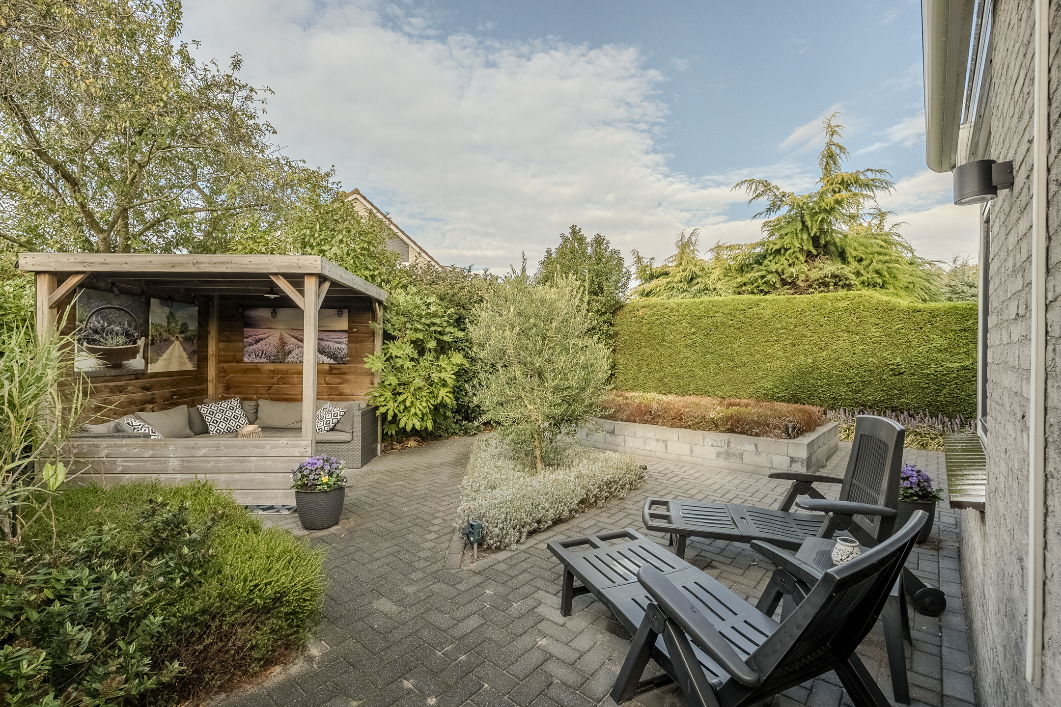 De fraai aangelegde achtertuin is op het (zuid)westen gelegen en aangelegd met sierbestrating, plantenborders en een mooie houten overkapping. Aan de achtergevel hangen elektrisch bedienbare zonneschermen, zo kun je een groot gedeelte van de dag genieten van de zon maar is er ook voldoende schaduw te creëren. Via de afgesloten zijtuin kom je in de voortuin met parkeergelegenheid voor de auto’s.
